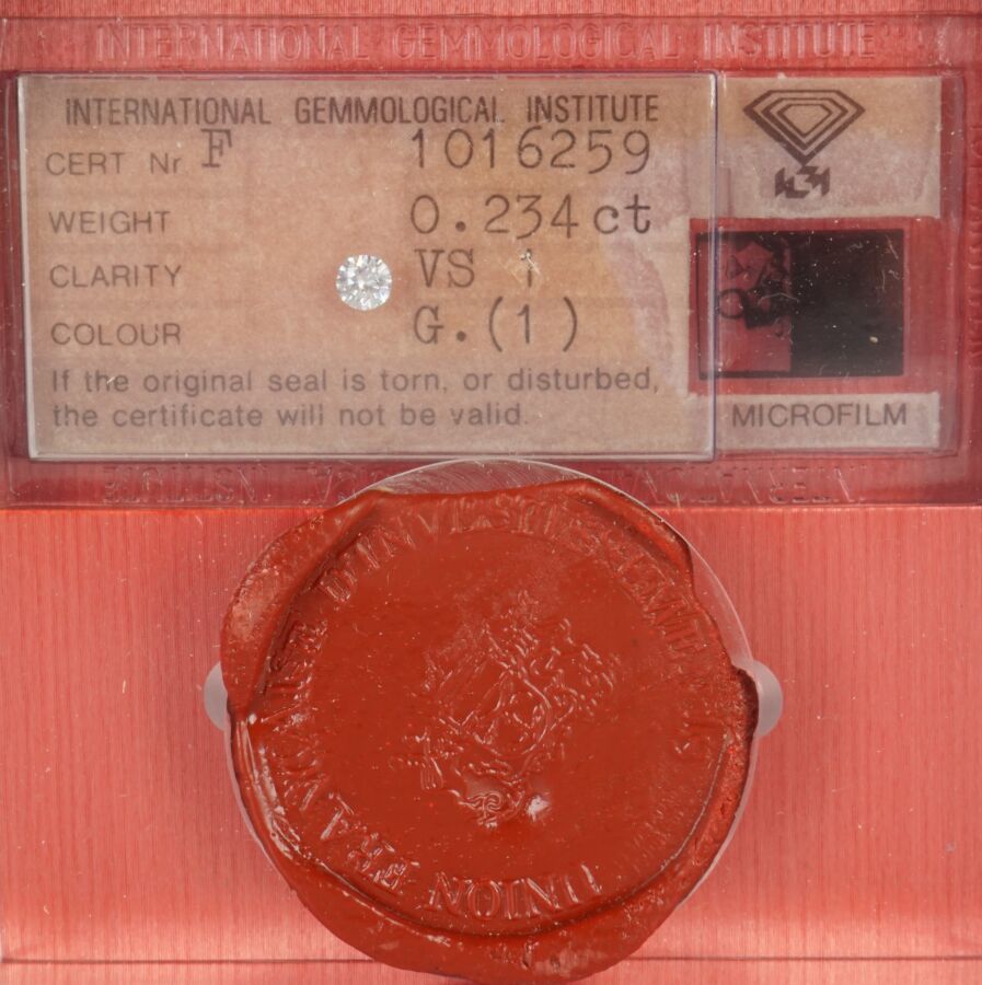 Diamant sur papier taille brillant, calibrant 0.23 cts, couleur G, pureté VS1, présenté en coffret sous scellé de l'International Gemmological Institute.