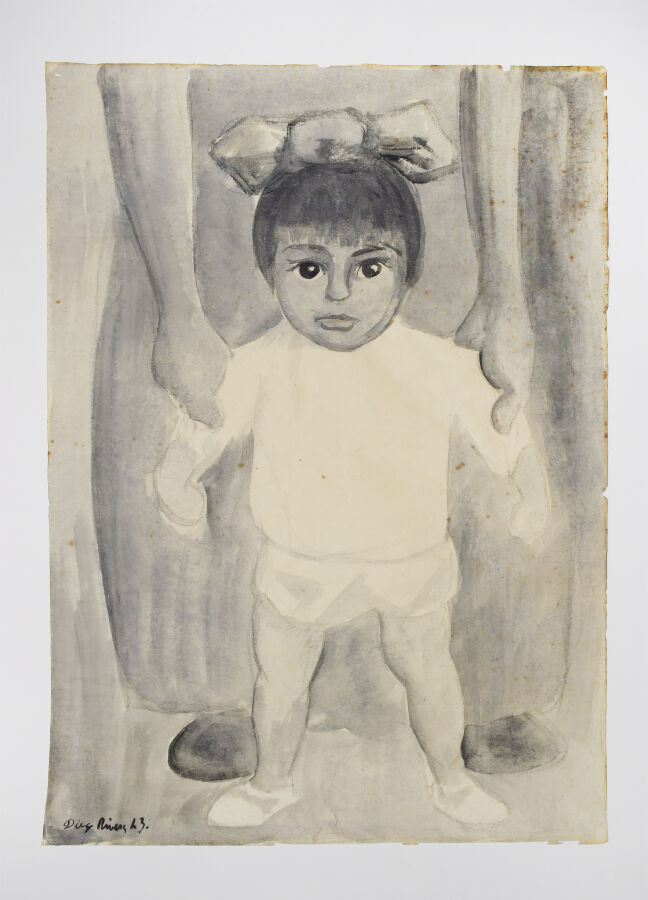 Diego RIVERA (1886-1957), "Les Premiers pas", 1943, dessin à l'aquarelle et encre sur papier calque, signé et daté à gauche, 74 x 53 cm. (petites tâches de rouille, moisissures et petite déchirure en bas à gauche).