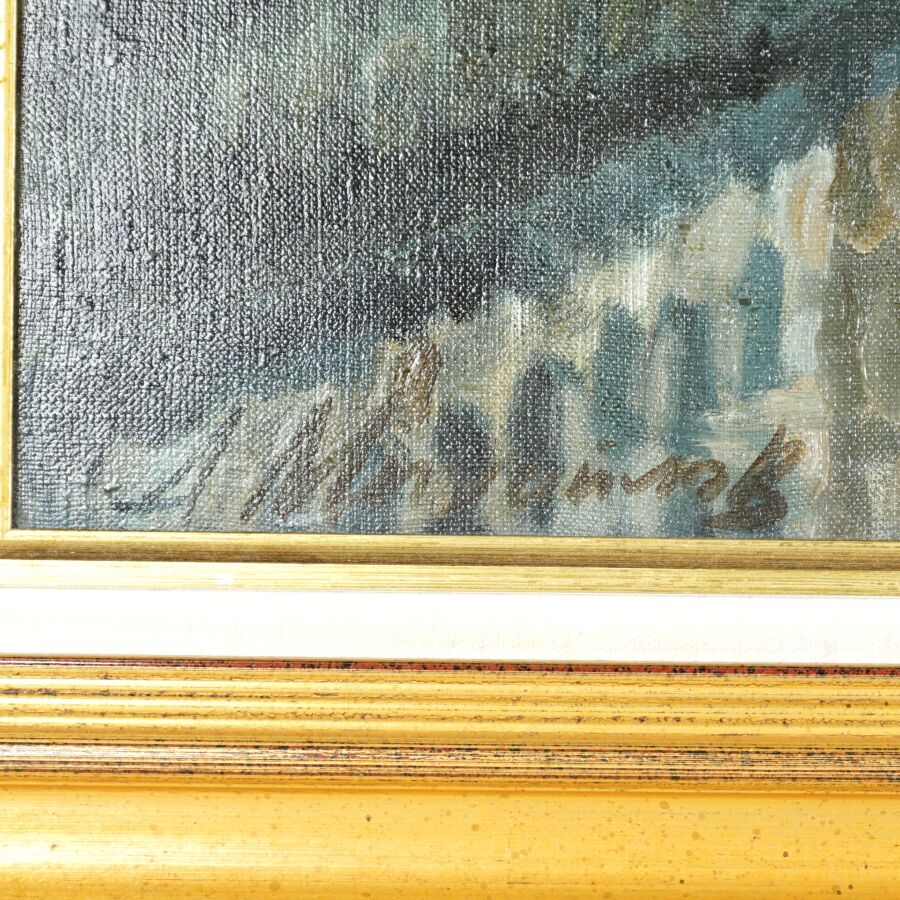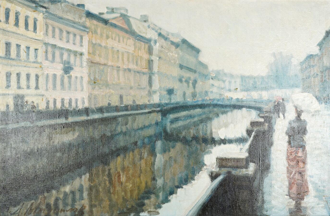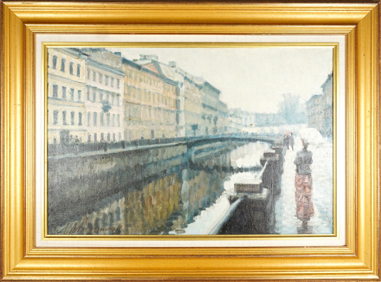 Dimitri MIKHAILOV (1953) "Les quais animés près du canal, Saint-Pétersbourg", huile sur toile signée en bas à gauche et contresignée au dos, 39 x 58 cm.