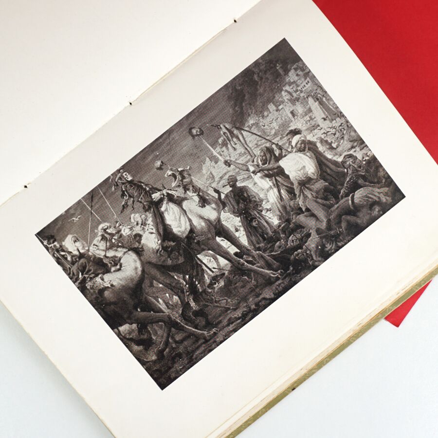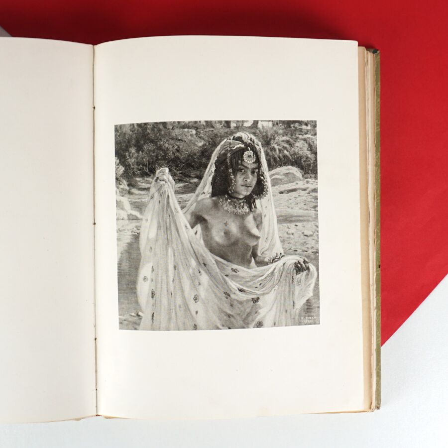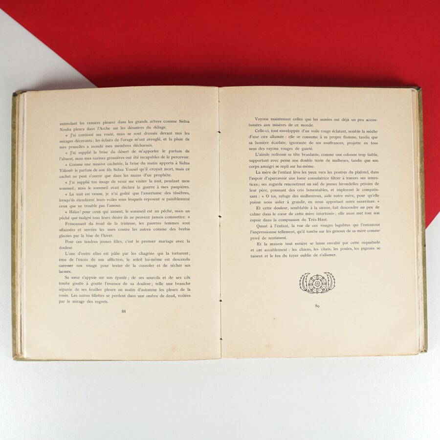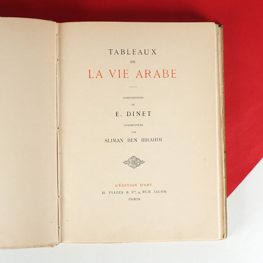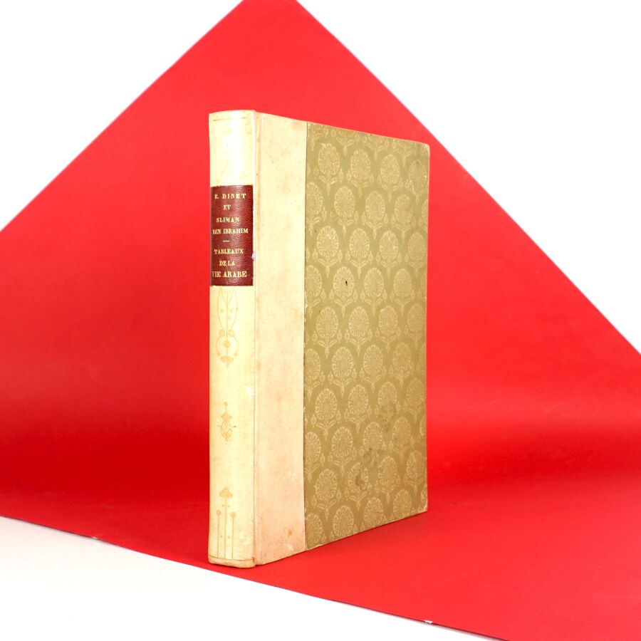 DINET (Étienne) & BEN IBRAHIM (Sliman). Tableaux de la vie arabe. Paris, H. Piazza & Cie, sd. In-8 bradel demi-vélin, dos orné de fers orientaux dorés, p. de titre en mar. rouge, papier vert à motifs vert clair sur les plats et les gardes, couv. conservées (reliure de l'époque). Hors-texte en noir par E. Dinet.