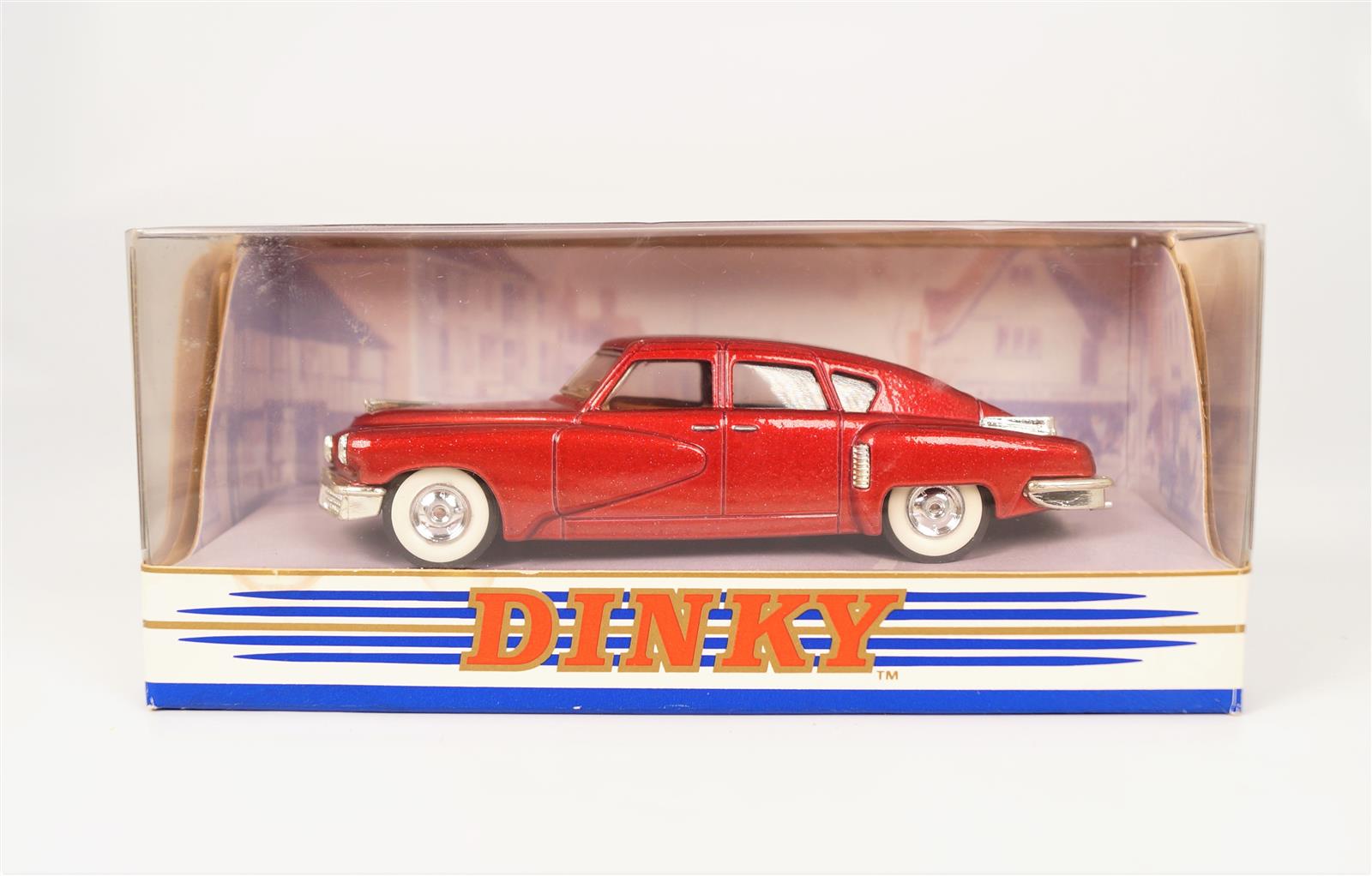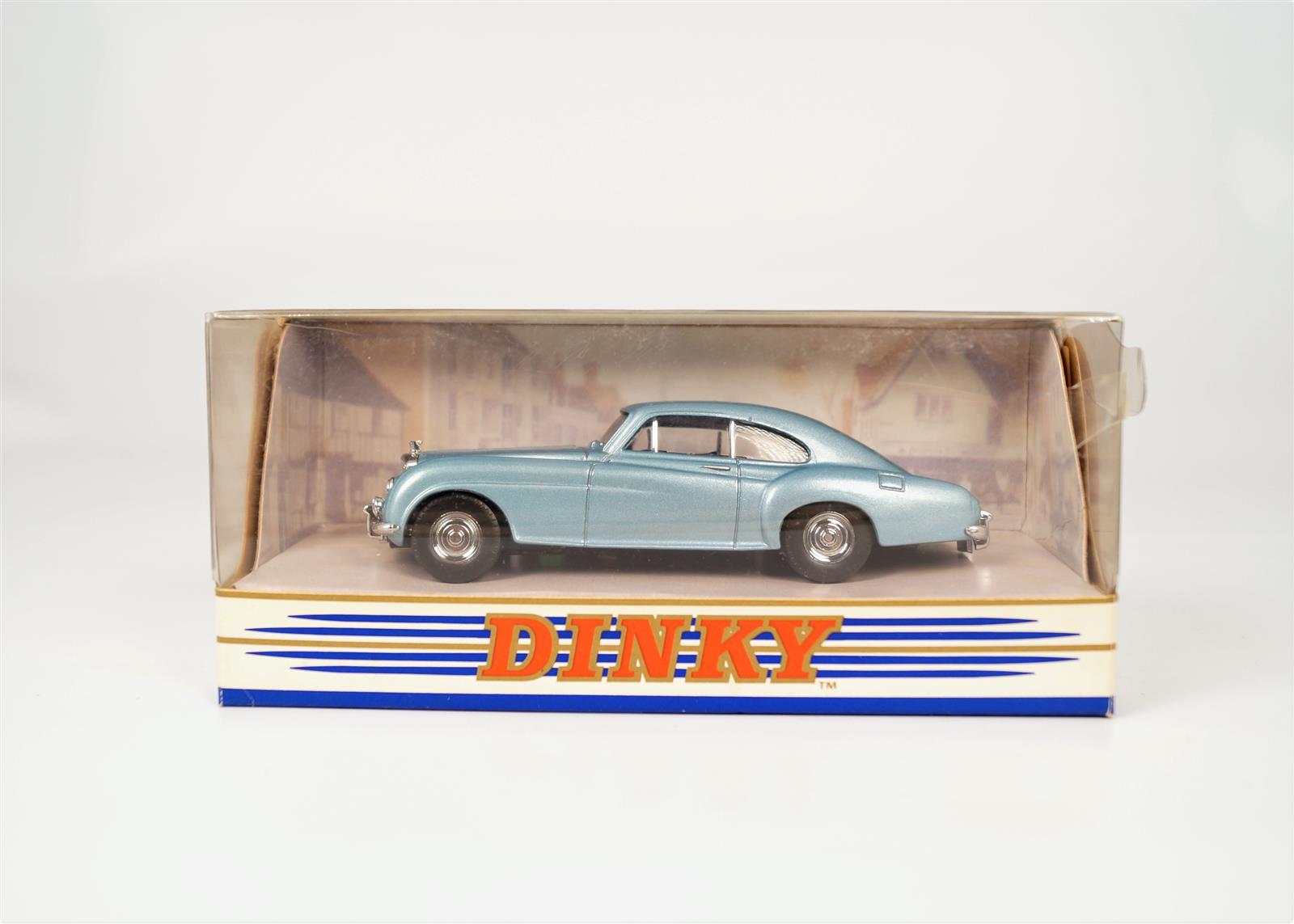 DINKY : Lot de 5 voitures miniatures, dans leurs boîtes d'origine comprenant : 1 Bentley " R " continental, 1955, réf. DY-13, bleu pâle métallique, boîte d'origine ; TUCKER Torpedo, 1948, réf. DY-11, couleur rouge métallique, boîte d'origine ; Ford E83W 10 CWT VAN, 1950, réf. DY-4, jaune, toit noir, modèle " Heinz ", boîte d'origine ; Cadillac, Coupe de Ville, 1959, réf. DY-7, rouge avec toit blanc, boîte d'origine ; Citroën 2 CV, 1957, réf. DY-32, bleu-gris, toit gris, boîte d'origine, L. de 12 à 16.2 cm (quelques usures)