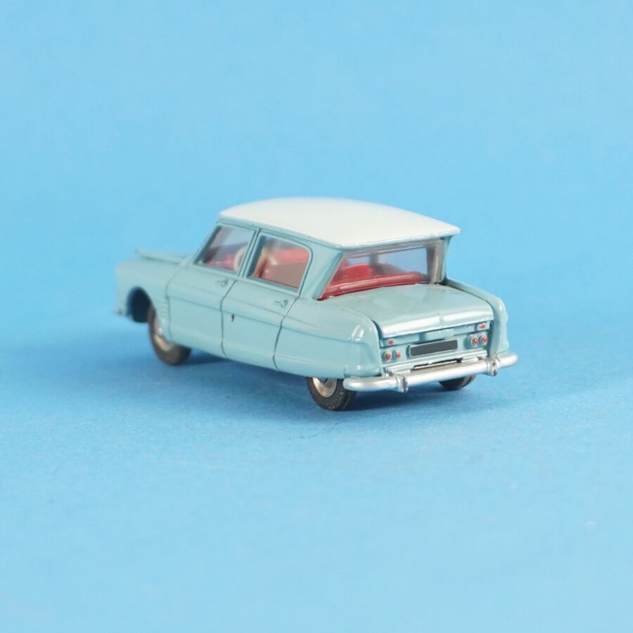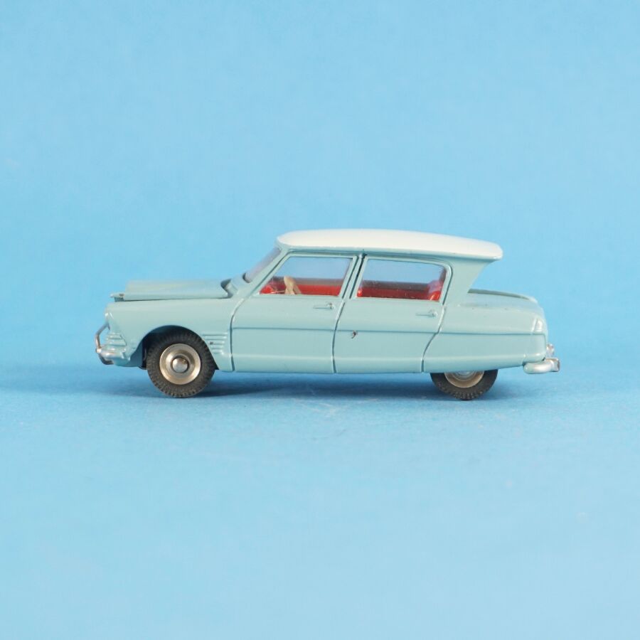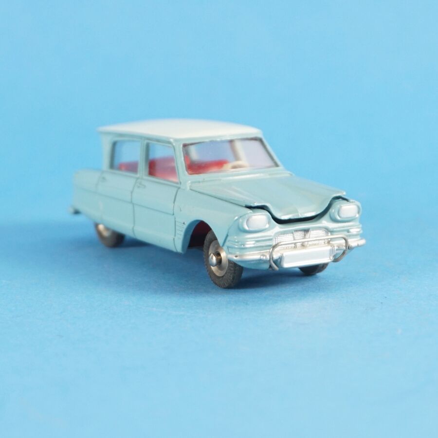 DINKY TOYS : Ami 6 Citroën, réf. 557, échelle 1/43ème, bleue et toit bleu clair, capot et malle ouvrants, direction, suspension, aménagements intérieurs et glaces, dans sa boîte d'origine (usures à la boîte, infimes rayures et écaillures).