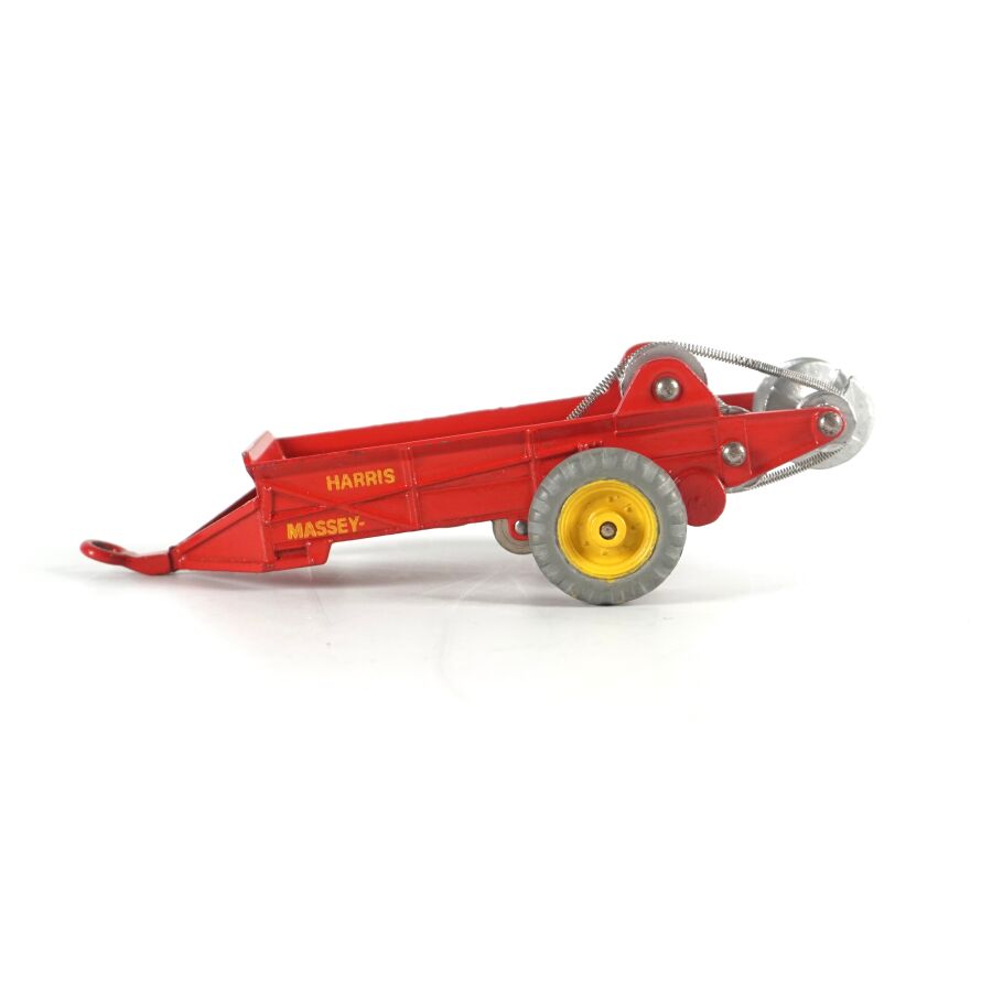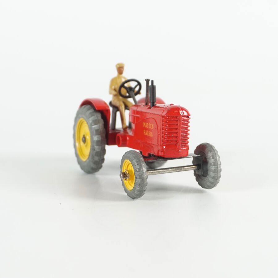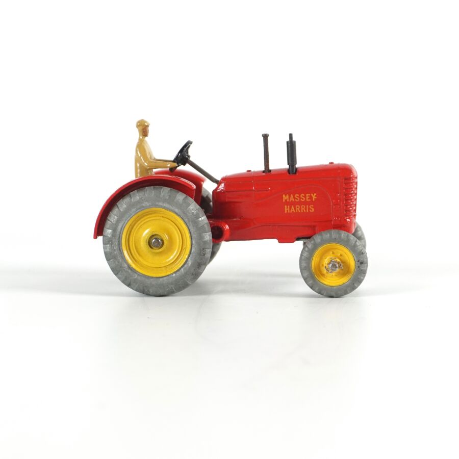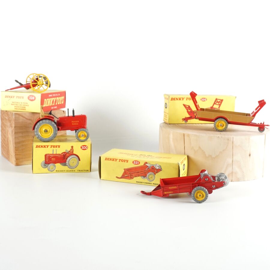 DINKY TOYS : Attelage comprenant un tracteur Massey-Harris, réf. 300, échelle 1/43ème, rouge, avec conducteur ; d'une remorque Harvest Trailer, réf. 320 ; d'une remorque Massey-Harris, réf. 321 et d'une Hay rake réf. 324, présentés dans leurs boîtes d'origine (usures à la boîte, légères écaillures, rouille à la hay).