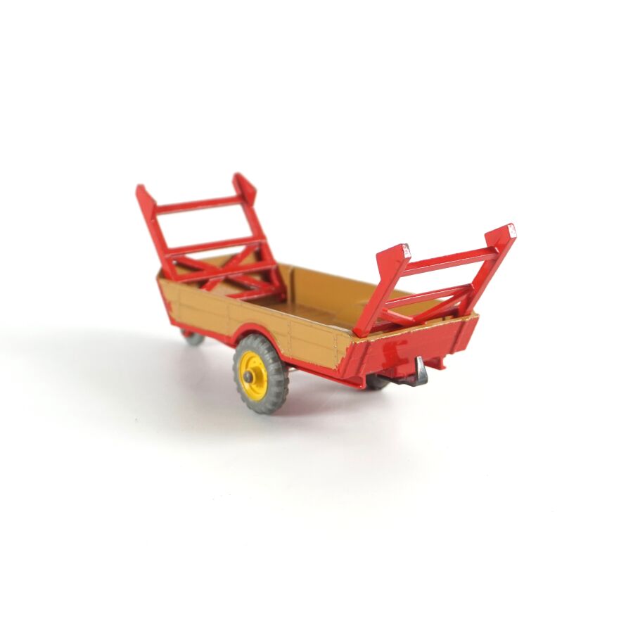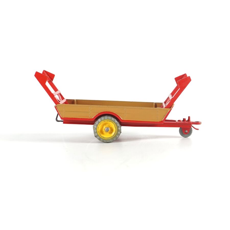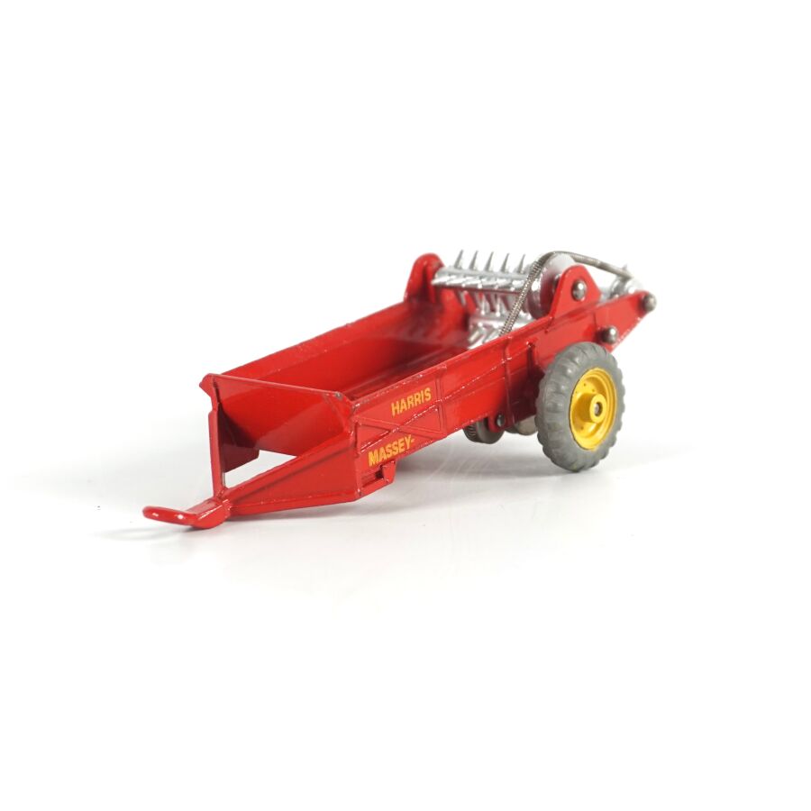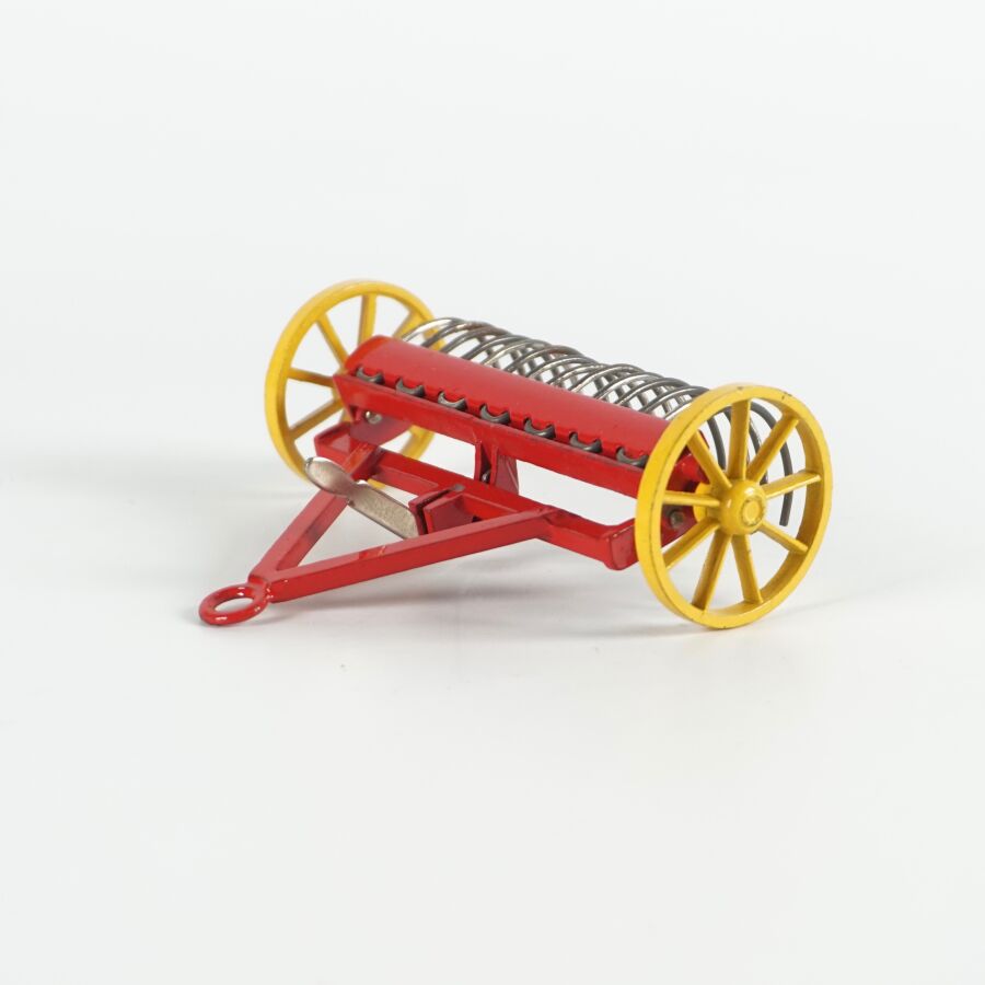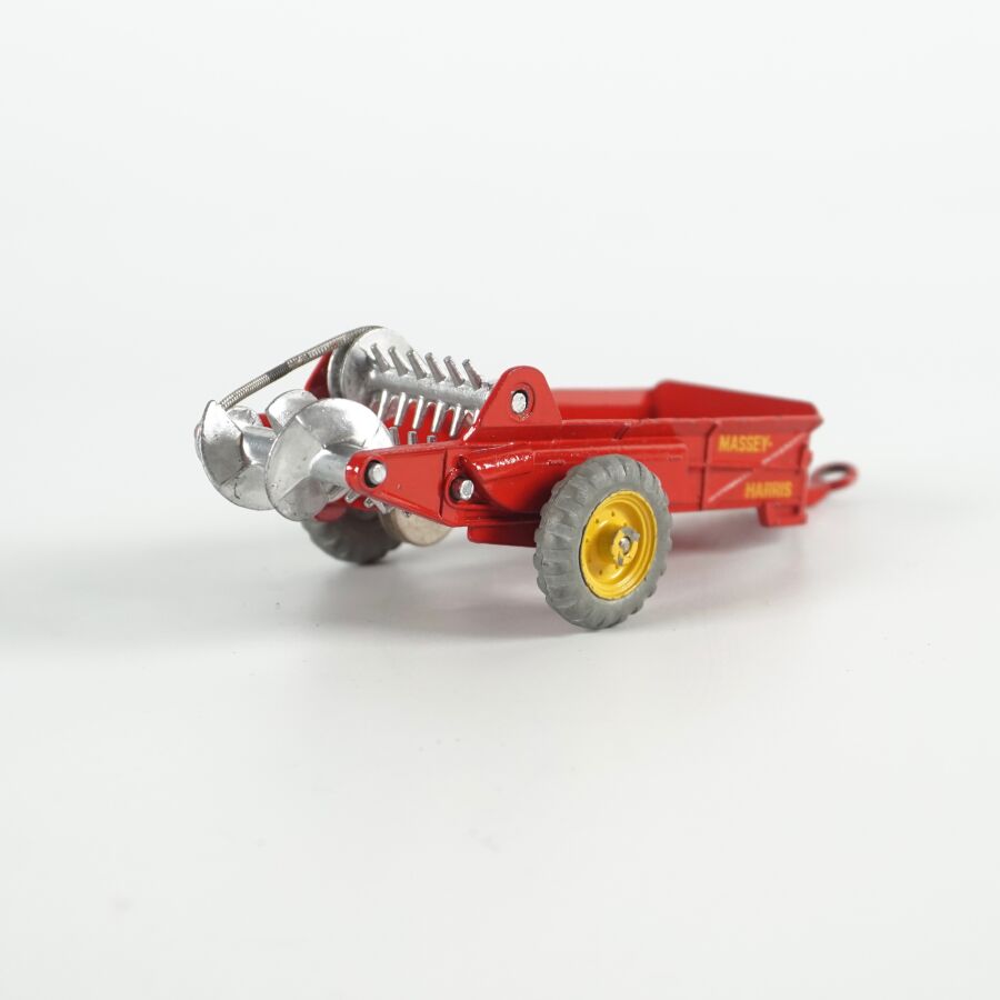 DINKY TOYS : Attelage comprenant un tracteur Massey-Harris, réf. 300, échelle 1/43ème, rouge, avec conducteur ; d'une remorque Harvest Trailer, réf. 320 ; d'une remorque Massey-Harris, réf. 321 et d'une Hay rake réf. 324, présentés dans leurs boîtes d'origine (usures à la boîte, légères écaillures, rouille à la hay).