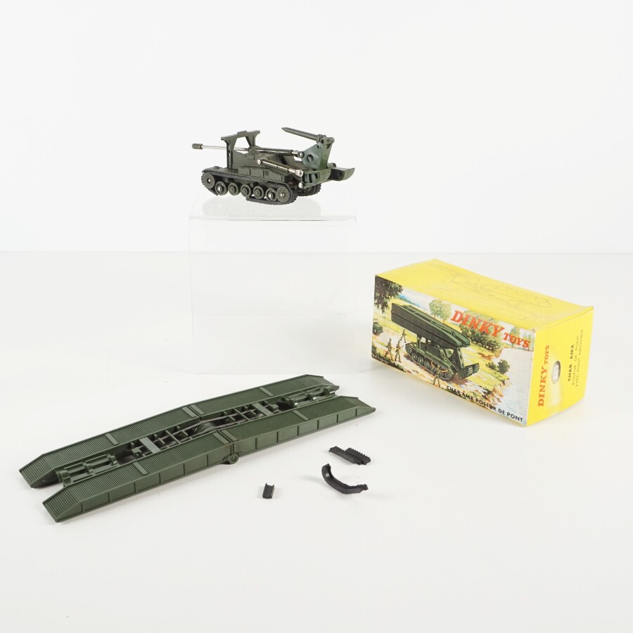DINKY TOYS : Char AMX Poseur de pont, avec pont amovible, réf.883, échelle 1/43ème, présenté dans sa boîte d'origine (petites usures à la boîte et chenilles sèches et cassantes).