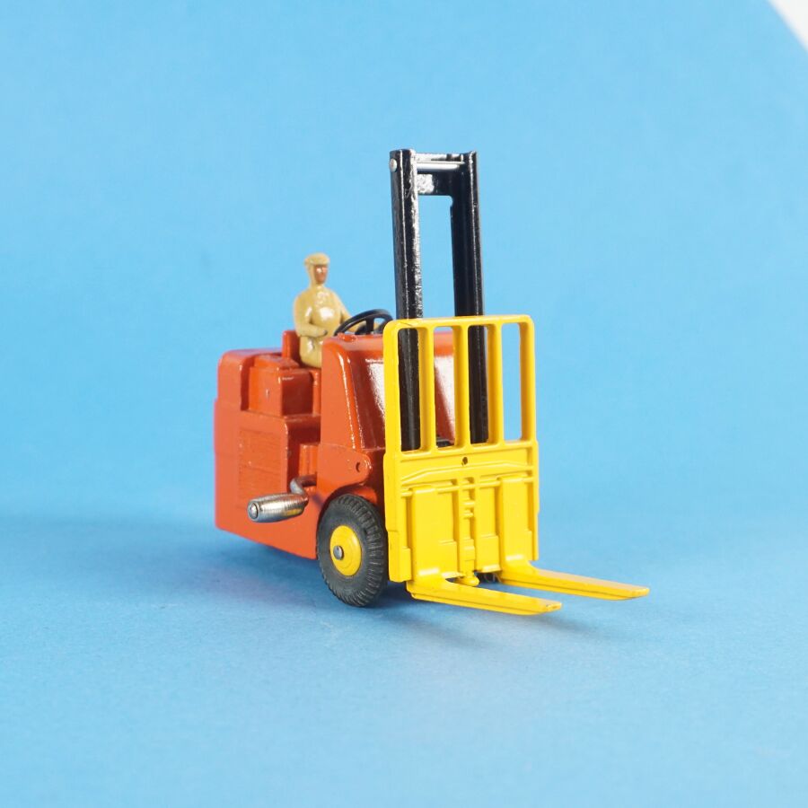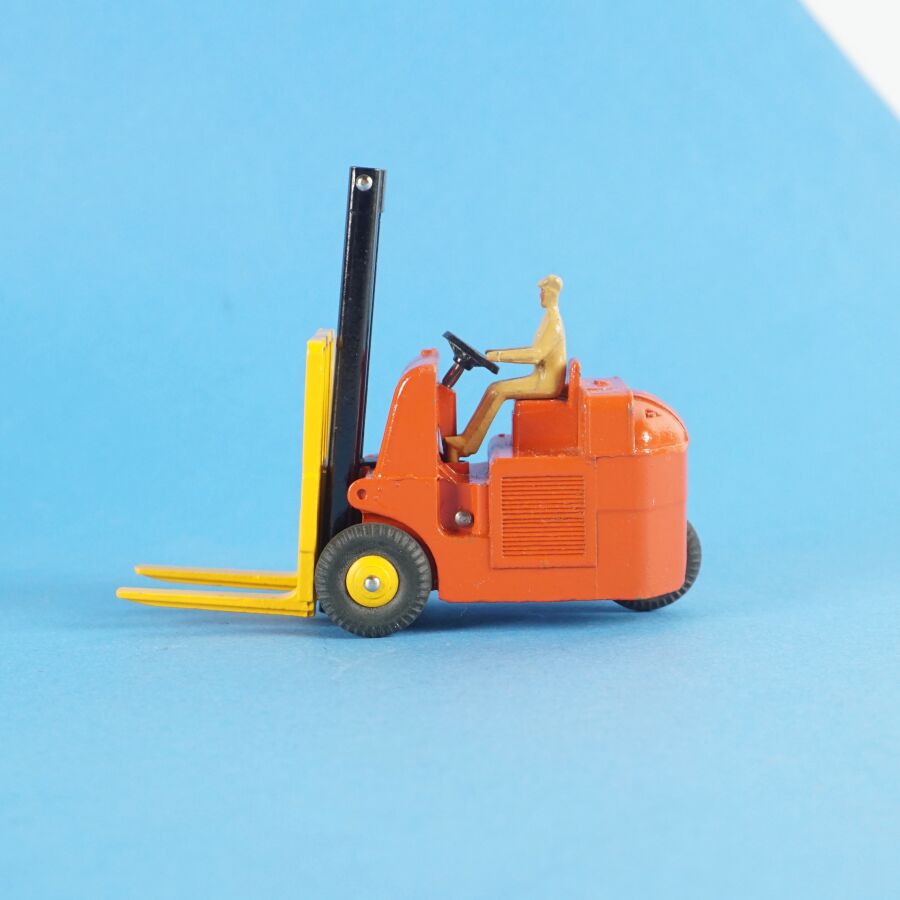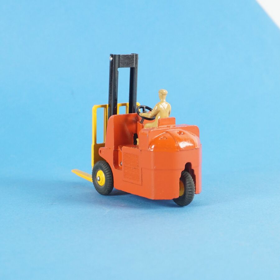 DINKY TOYS : Chariot à fourche Coventry Climax, réf. 597, de couleur orange et jaune, avec sa boîte d'origine (usures à la boîte, bel état, manivelle non fonctionnelle).