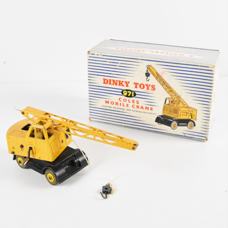 DINKY TOYS : Coles mobile crane, grue de couleur jaune, réf. 971, la cabine pivote, dans sa boîte d'origine (inscription et usures sur la boîte, écaillures de la peinture).