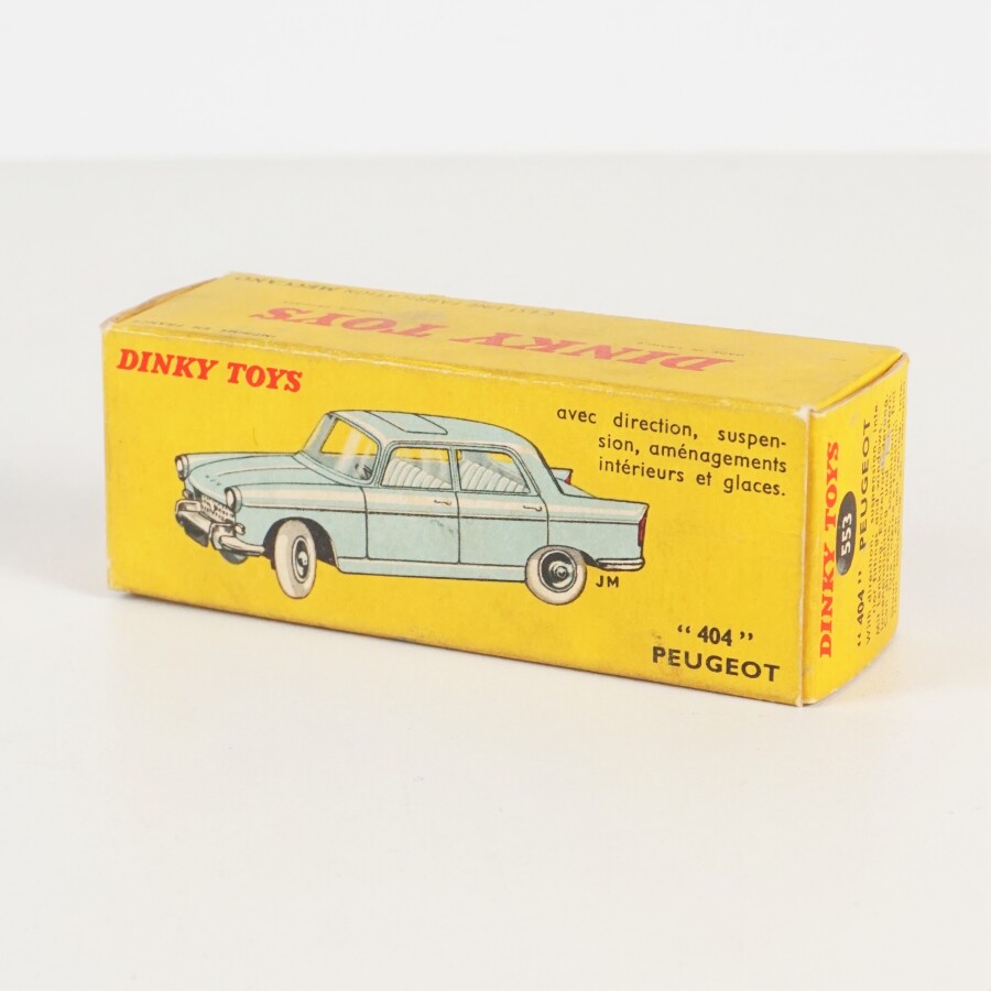 DINKY TOYS : Ensemble de 2 Peugeot comprenant 1 Peugeot 403 berline, modèle avec glaces, réf. 521 et 1 Peugeot 404, réf. 553, dans leurs boîtes d'origine (boîte en l'état, la peinture n'est pas d'origine, quelques usures aux carrosseries).