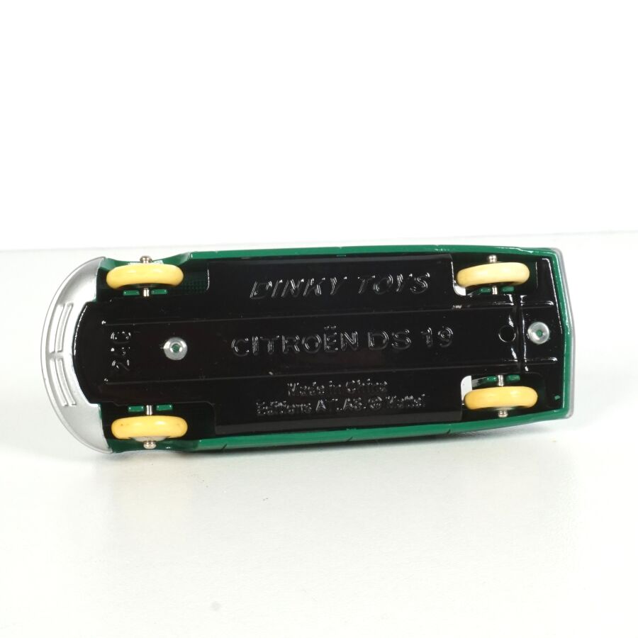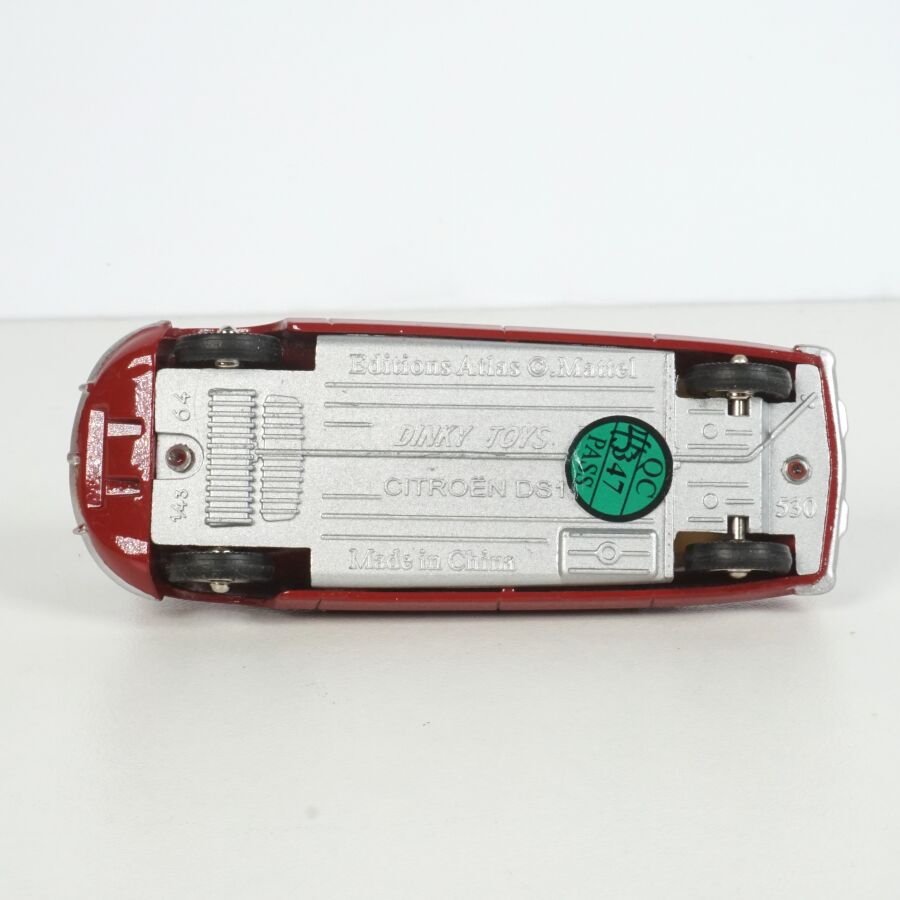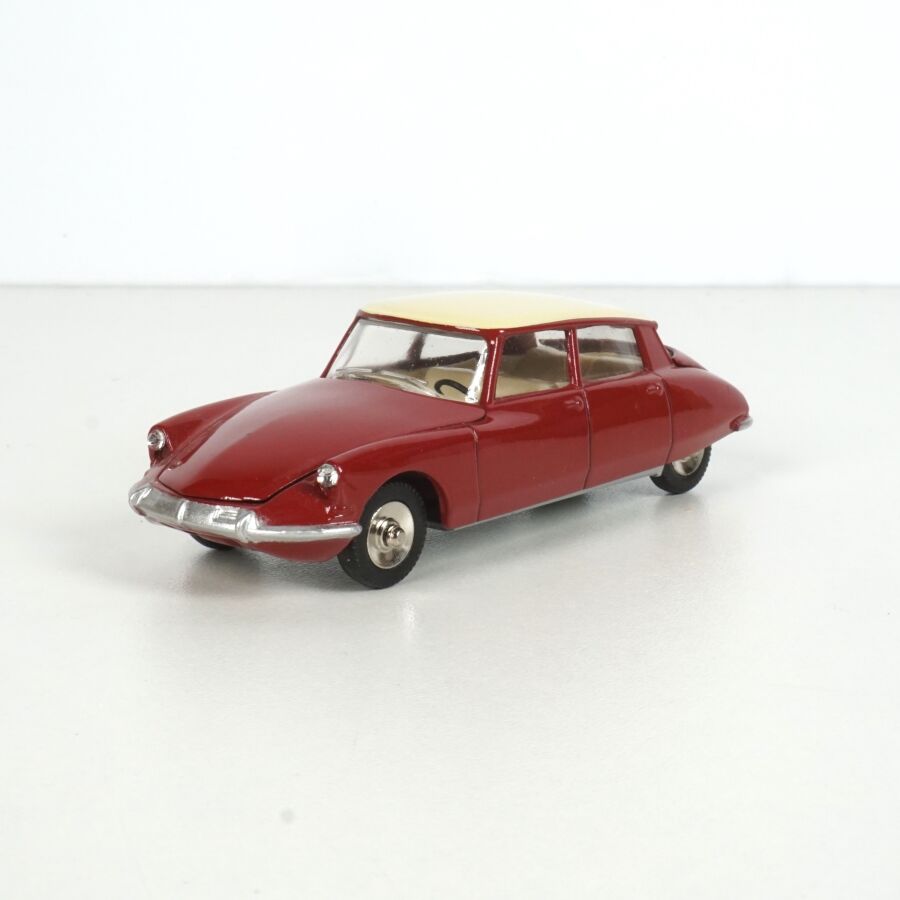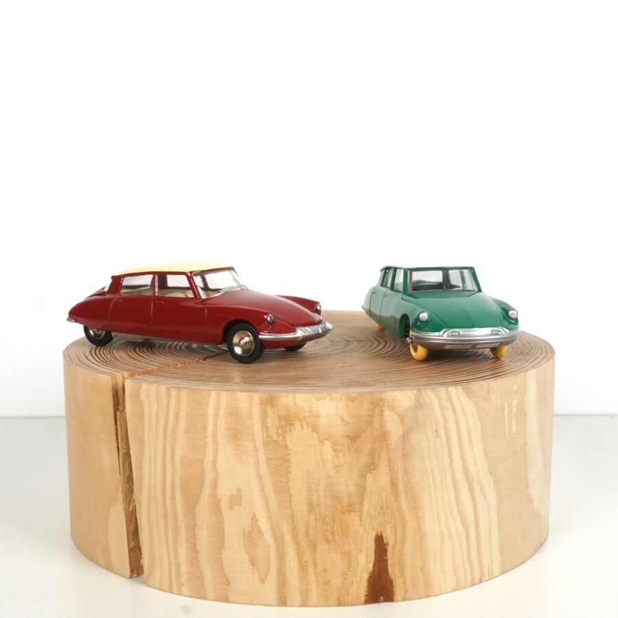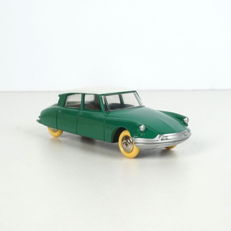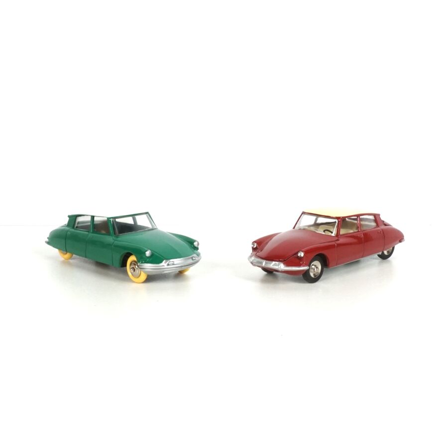 DINKY TOYS : Ensemble de 2 véhicules, échelle 1/43ème, comprenant (1) Citroën DS 19, réf. 24C, verte toit blanc, avec glaces et (1) Citroën DS 19, réf. 530, bordeaux, toit beige, capot et coffre ouvrants, phares scintillants, moteur et plancher moulés, avec glaces.