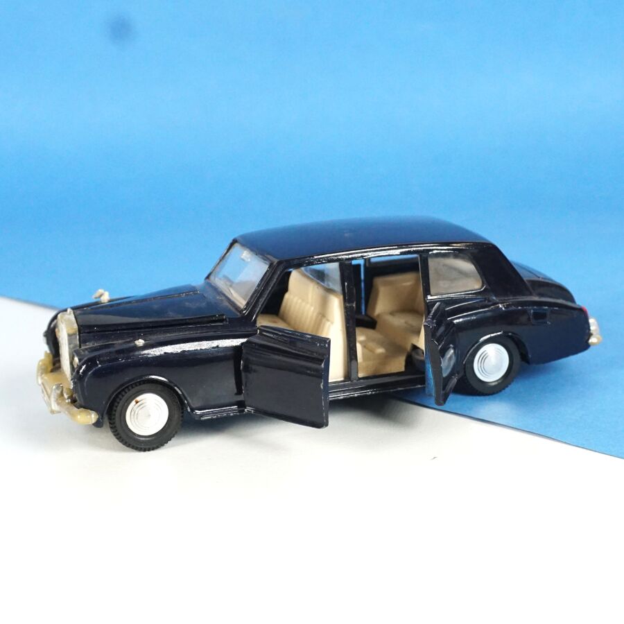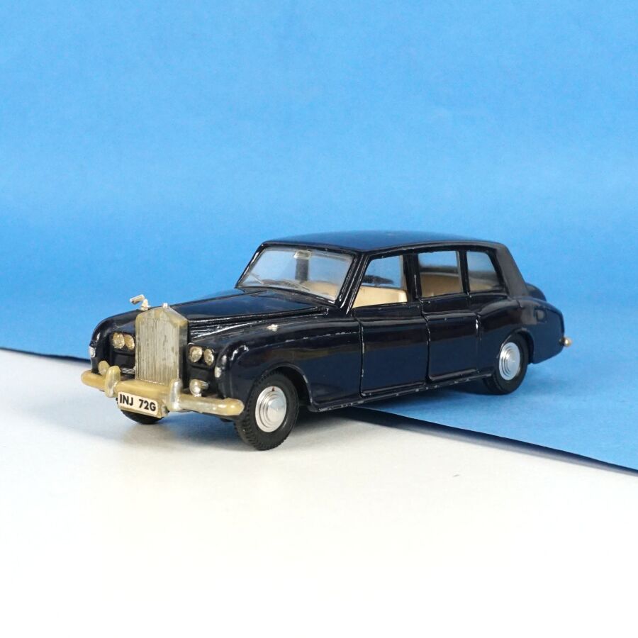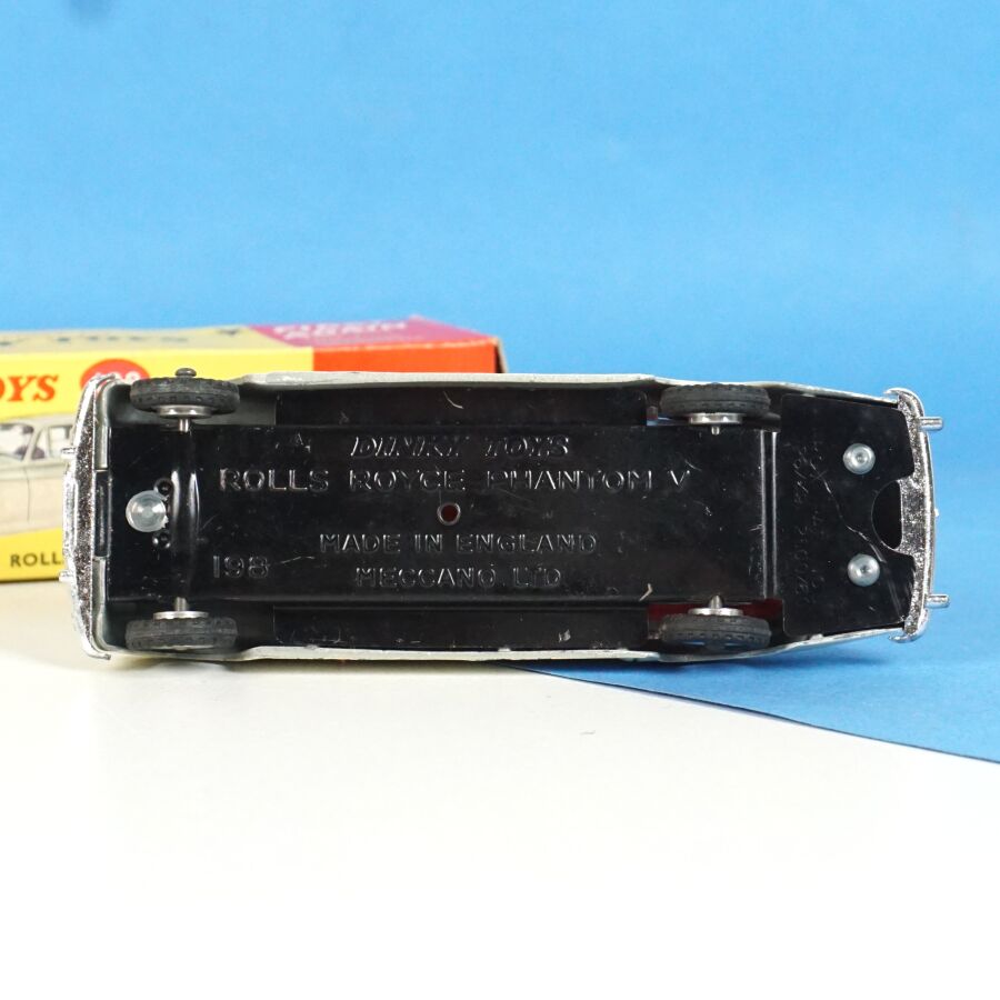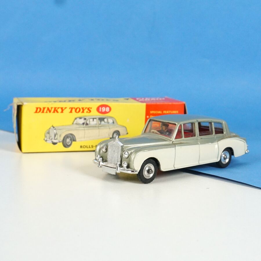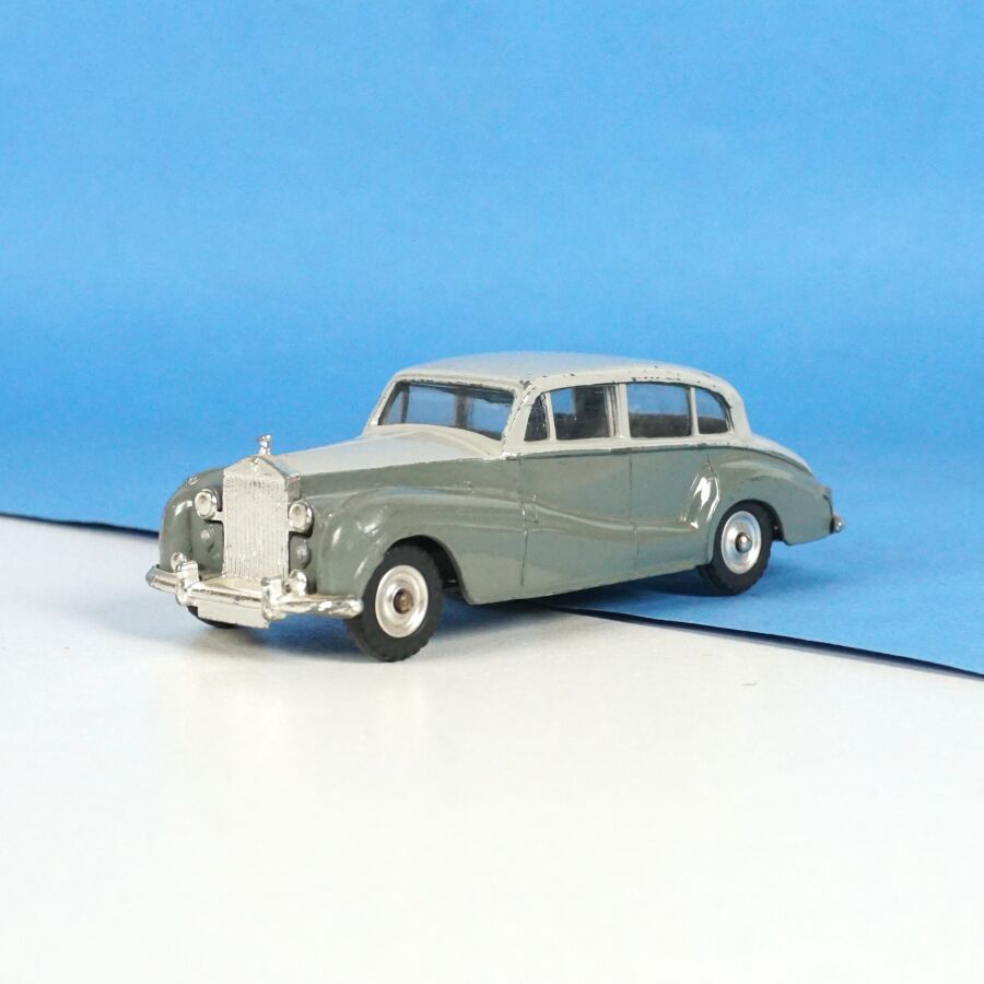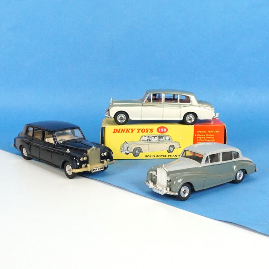 DINKY TOYS : Ensemble de 3 véhicules, échelle 1/43ème, comprenant (1) Rolls-Royce, réf. 551, grise deux tons ; (1) Rolls-Royce Phantom V, réf 198, grise et blanche avec des fenêtres ouvrables et présentée en boîte d'origine ; (1) Rolls-Royce Phantom V, réf. 152, noire avec portes ouvrantes (usures, écaillures, manques).
