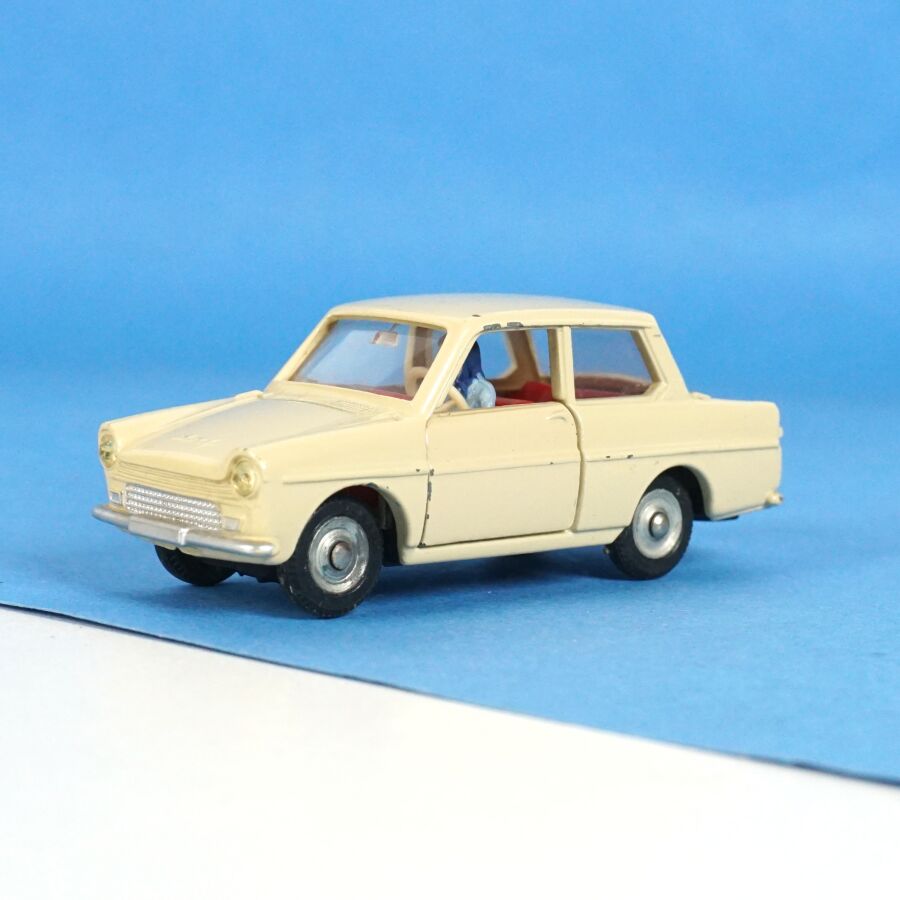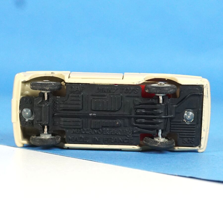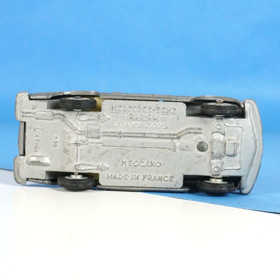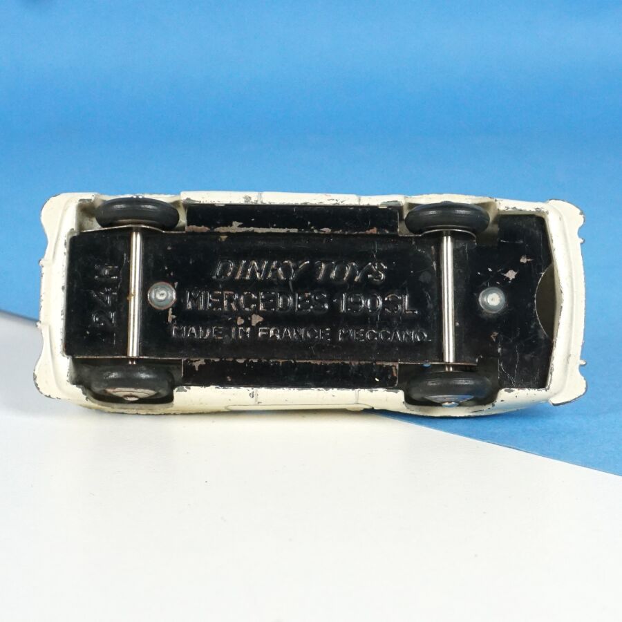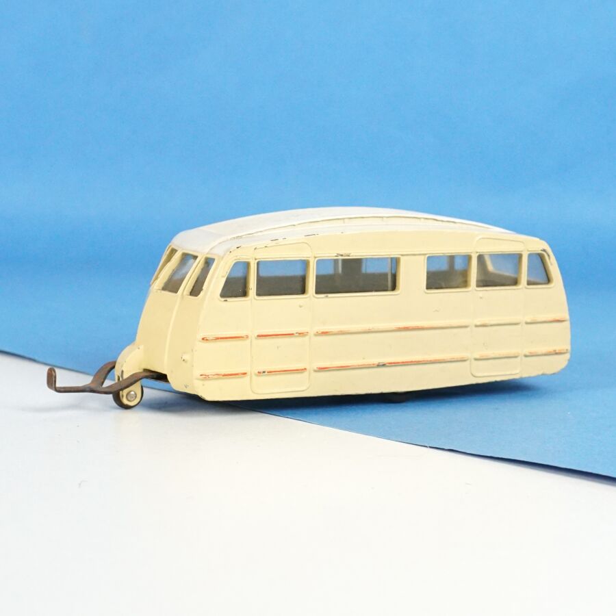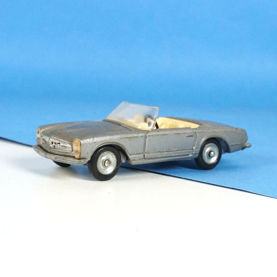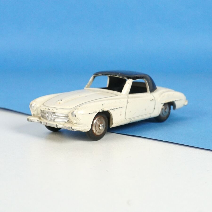 DINKY TOYS : Ensemble de 4 véhicules, échelle 1/43ème, comprenant (1) DAF, réf. 508, beige intérieur rouge, avec sa conductrice ; (1) Mercedes-Benz 230-SL, réf. 516, argent ; (1) Mercedes 190 SL, réf. 24H, beige et (1) Caravane, réf. 811, beige avec vitres (quelques usures et écaillures).