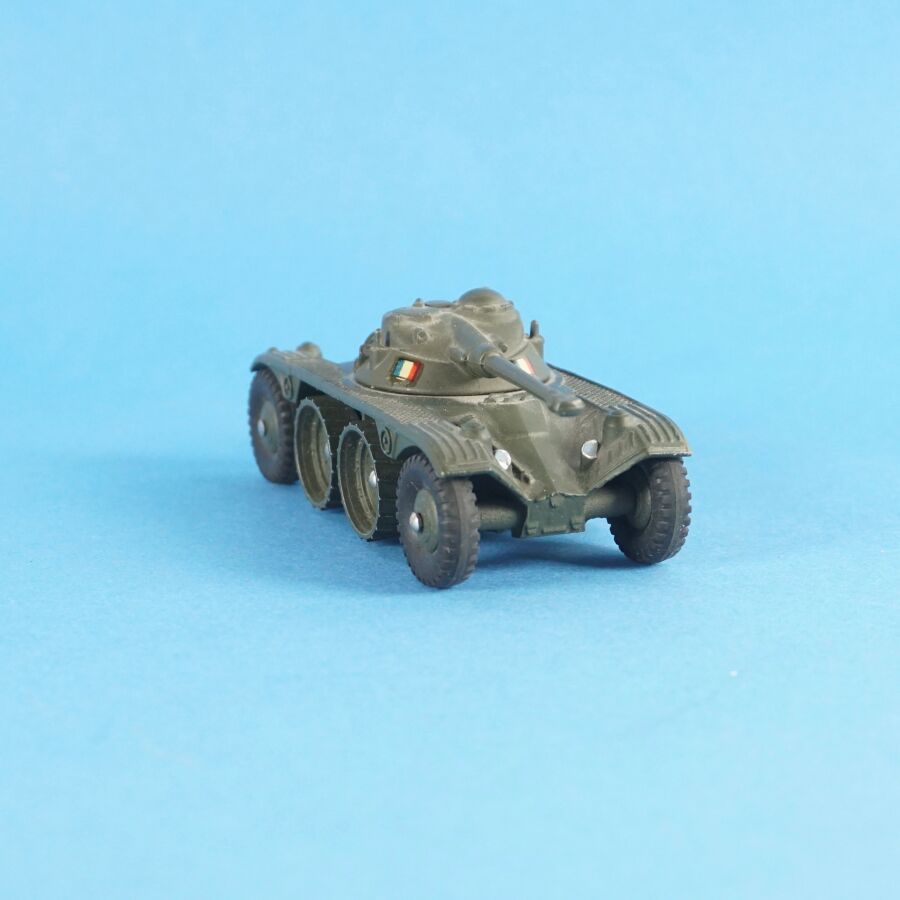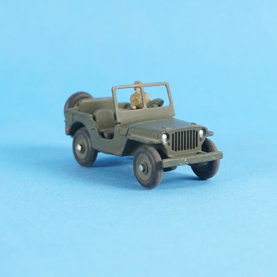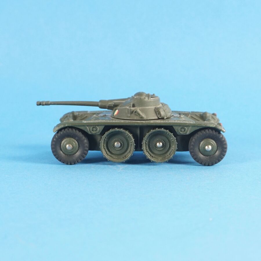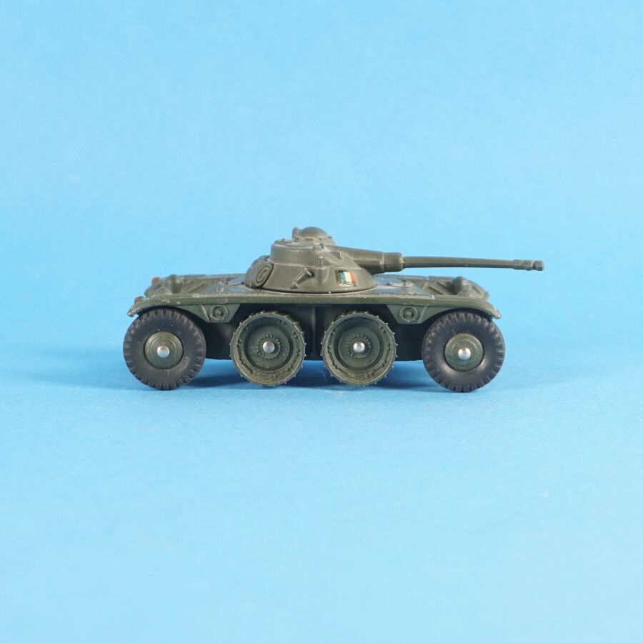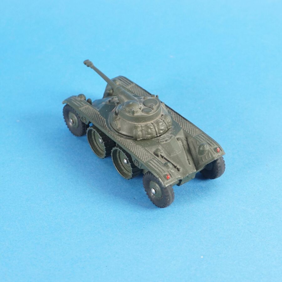 DINKY TOYS : Ensemble de 4 véhicules/engins militaires, échelle 1/43ème, comprenant : (1) Char A.M.X 13 tonnes, réf. 80C, dans sa boîte d'origine (usures à la boîte, quelques traces) ; (1) Engin Blindé de Reconnaissance Panhard, réf. 815 80A, dans sa boîte d'origine (usures à la boîte, quelques traces) ; (1) Obusier de 155 A.B.S, réf. 80E, dans sa boîte d'origine (usures à la boîte, quelques traces) et (1) Jeep Hotchkiss-Willys, réf. 816, avec conducteur, dans sa boîte d'origine (usures à la boîte, quelques traces).