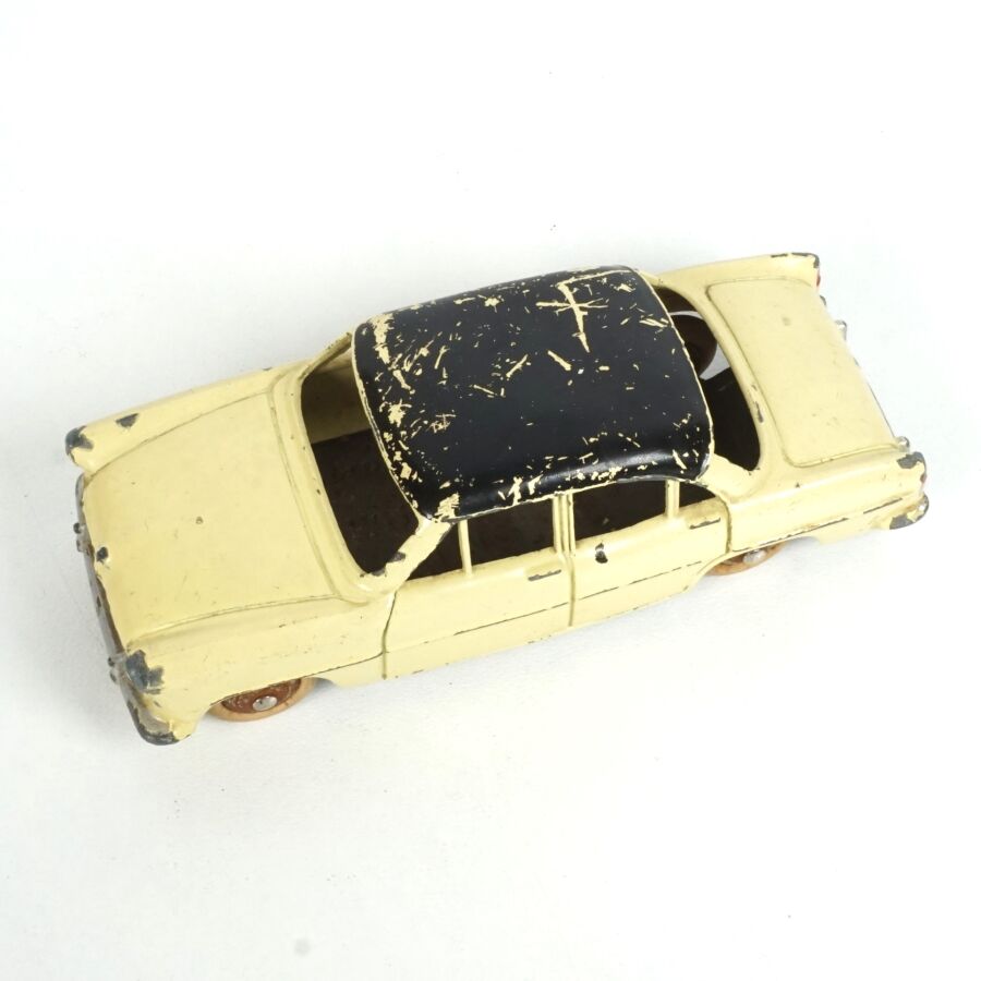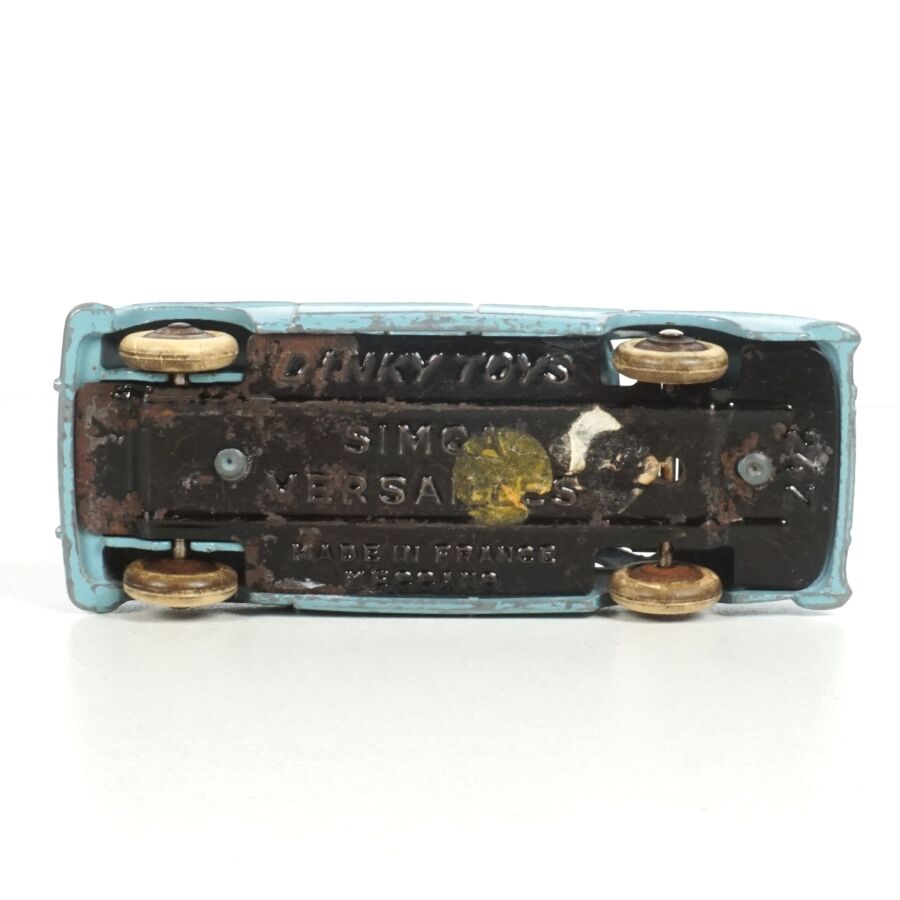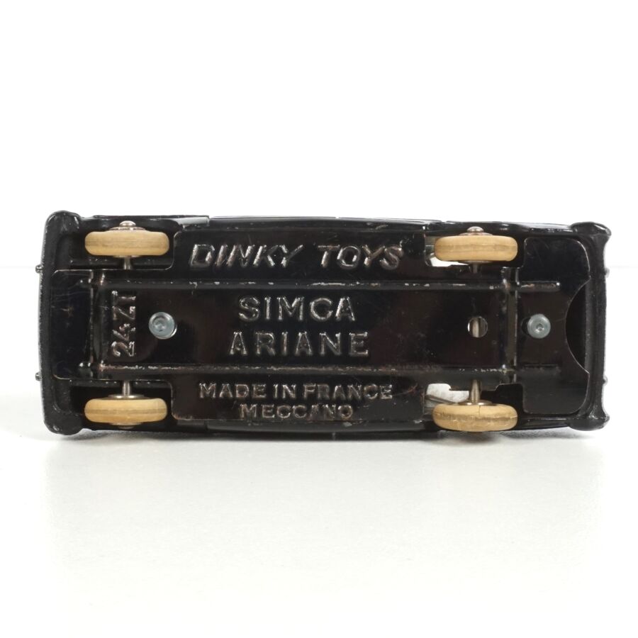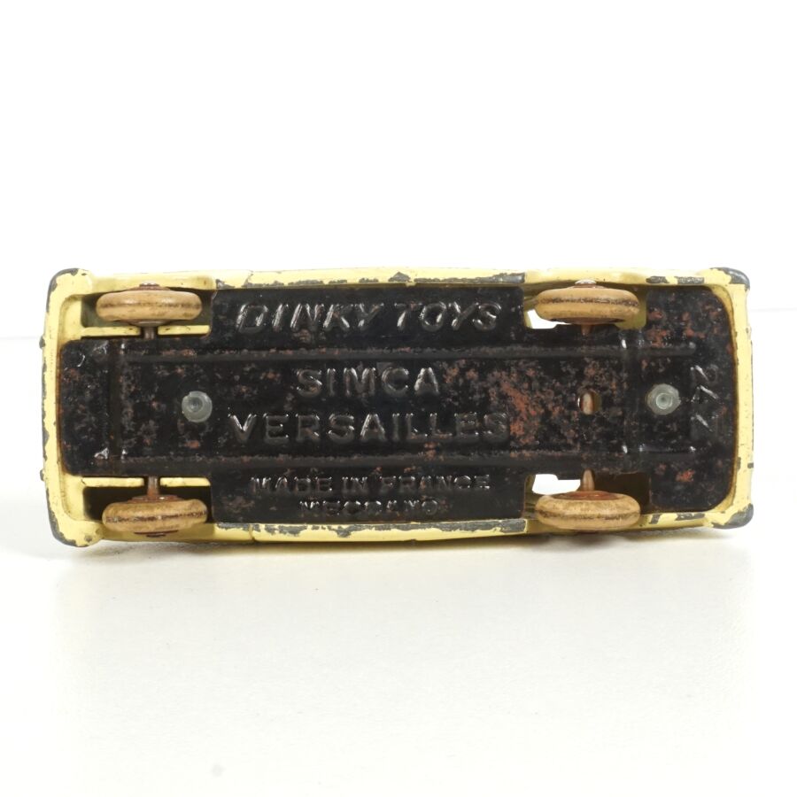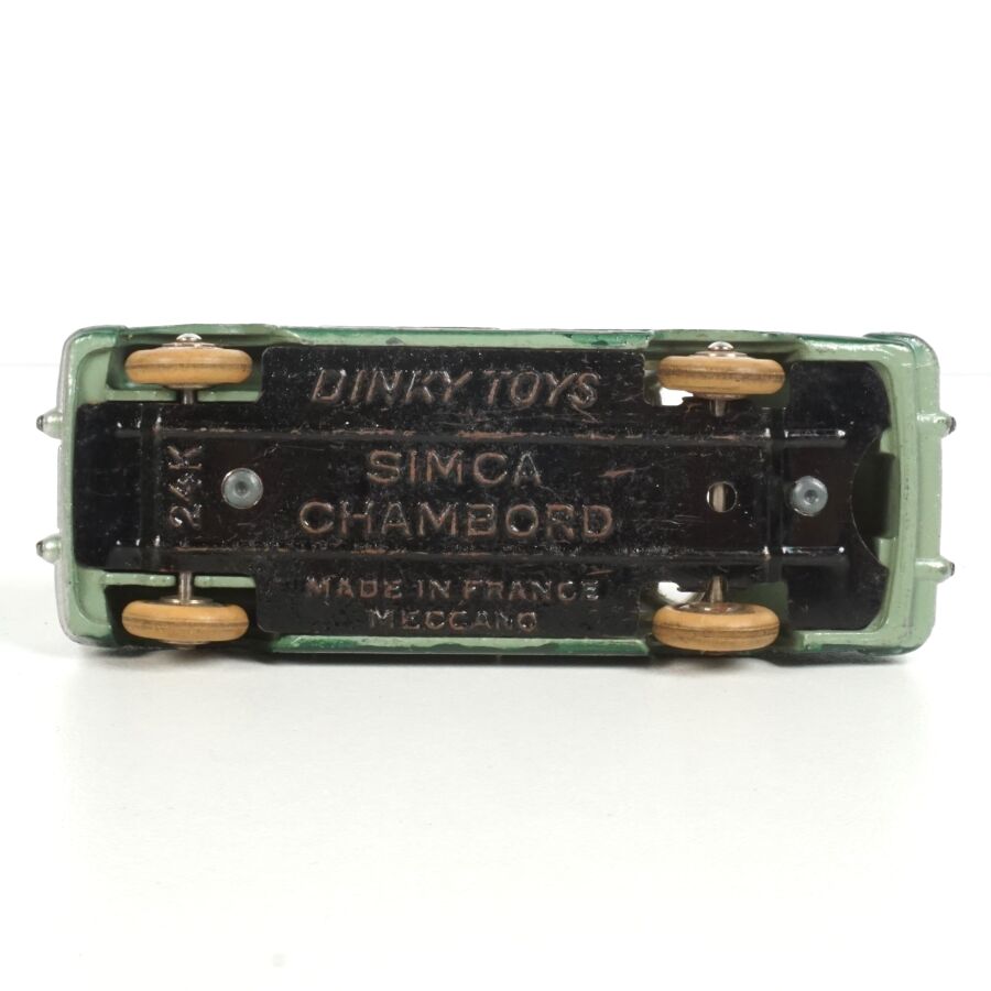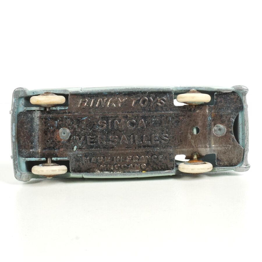 DINKY TOYS : Ensemble de 5 véhicules, échelle 1/43ème, comprenant (1) Simca Chambord, réf. 24K, verte deux tons, avec glaces ; (1) Simca Versailles, réf. 24Z, bleue toit blanc ; (1) Simca Versailles, réf. 24Z, jaune toit noir ; (1) Simca Versailles, verte et (1) Taxi Simca Ariane, réf. 24ZT, noire toit rouge, avec glaces (écaillures, usures).