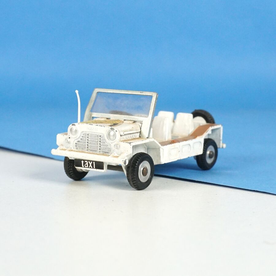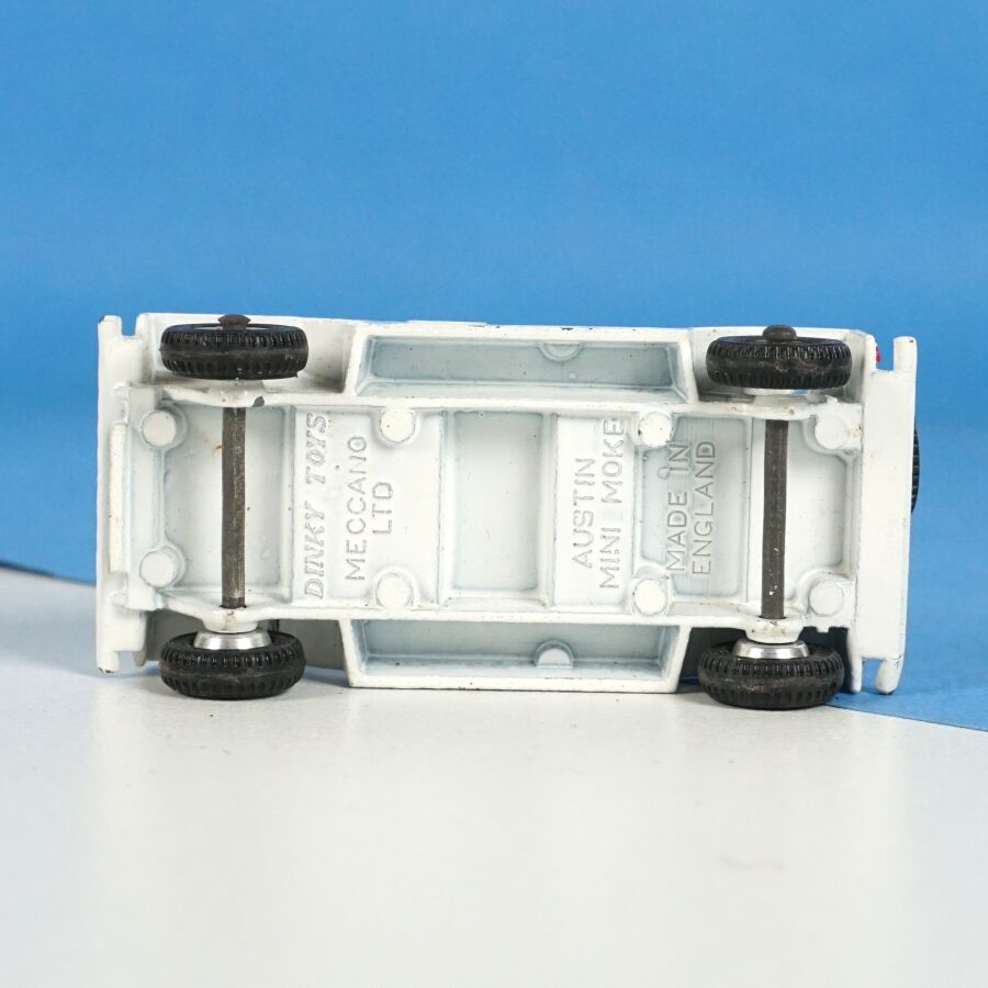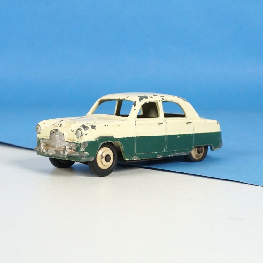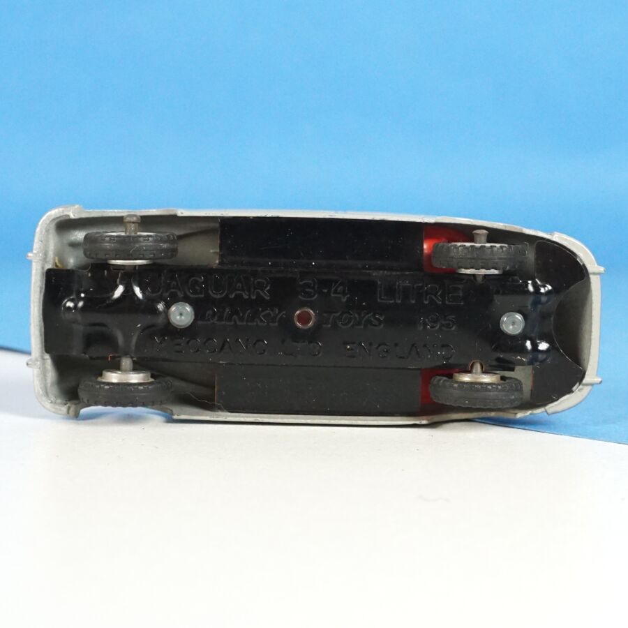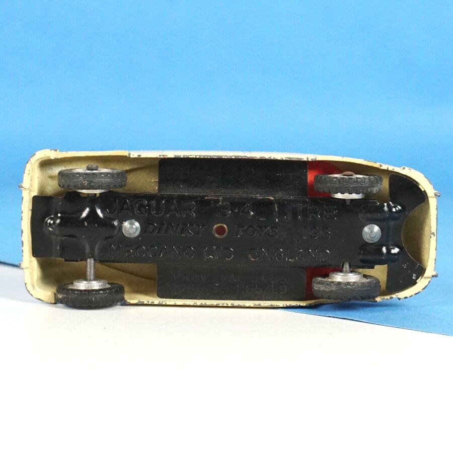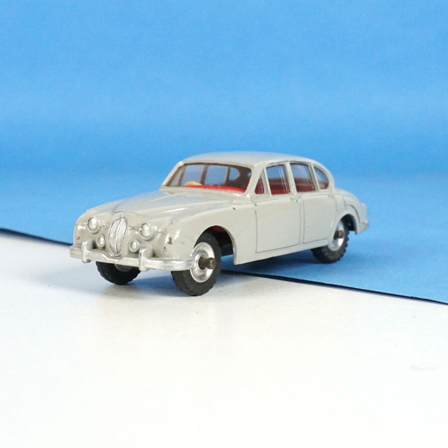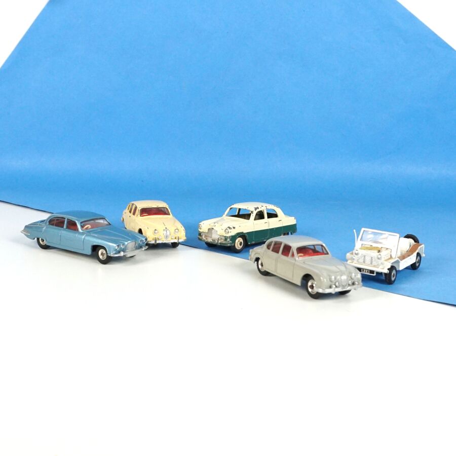 DINKY TOYS : Ensemble de 5 véhicules, échelle 1/43ème, comprenant : (1) Jaguar Mark X, réf. 142, bleu clair ; (1) Jaguar 3-4 Litre, réf. 195, beige ; (1) Jaguar 3-4 Litre, réf. 195, grise ; (1) Ford Zéphyr, réf. 162, blanche et verte et (1) Austin Mini Moke, blanche, l'ensemble sans boîte (quelques écaillures, usures et rayures).