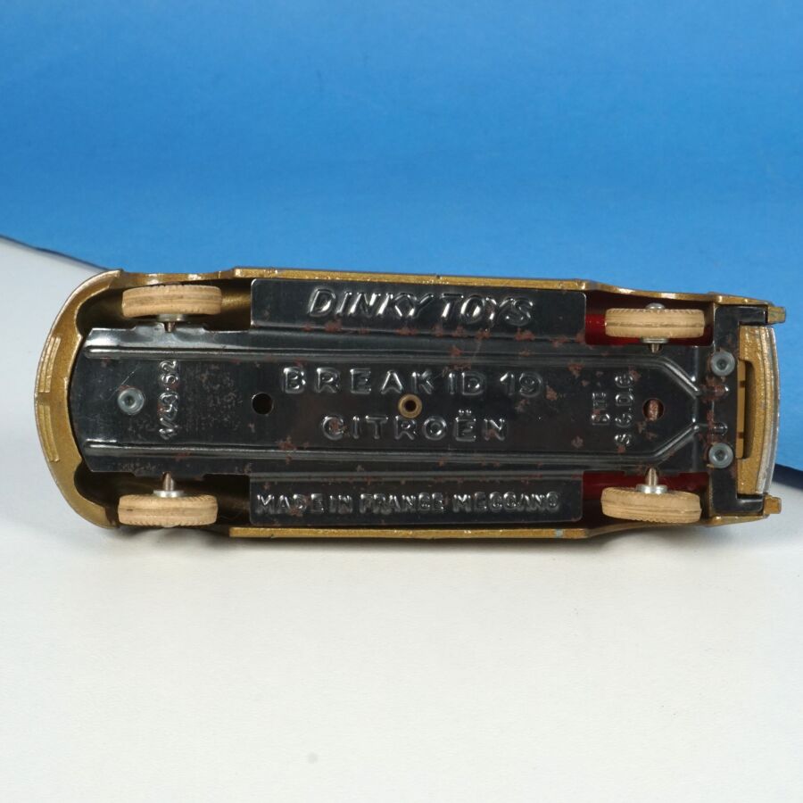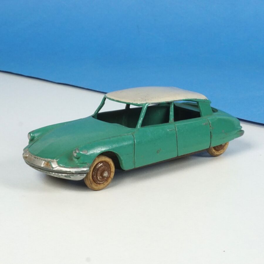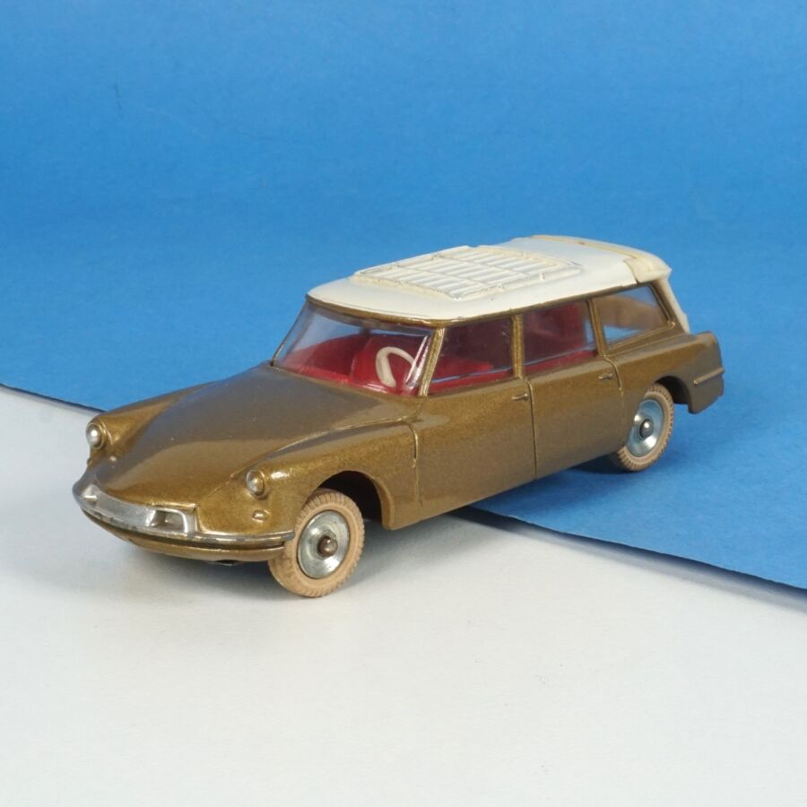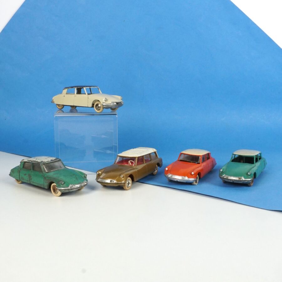 DINKY TOYS : Ensemble de 5 véhicules, échelle 1/43ème, comprenant (1) Citroën Break ID 19, réf. 539, dorée, toit blanc intérieur rouge, avec glaces, coffre ouvrant ; (1) Citroën DS 19, réf. 24C, beige toit noir ; (1) Citroën DS 19, réf. 24C, verte toit beige, avec glaces ; (1) Citroën DS 19, réf. 24C, orange toit beige, avec glaces et (1) Citroën DS 19, réf. 24C, verte toit beige (écaillures, usures, la DS19 verte avec glaces est en l'état).