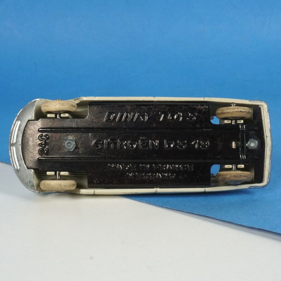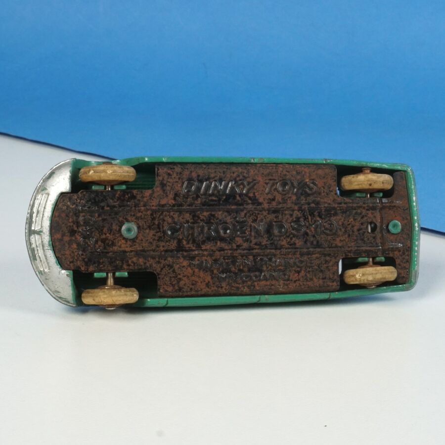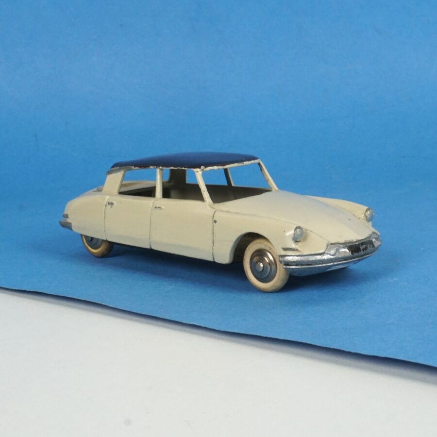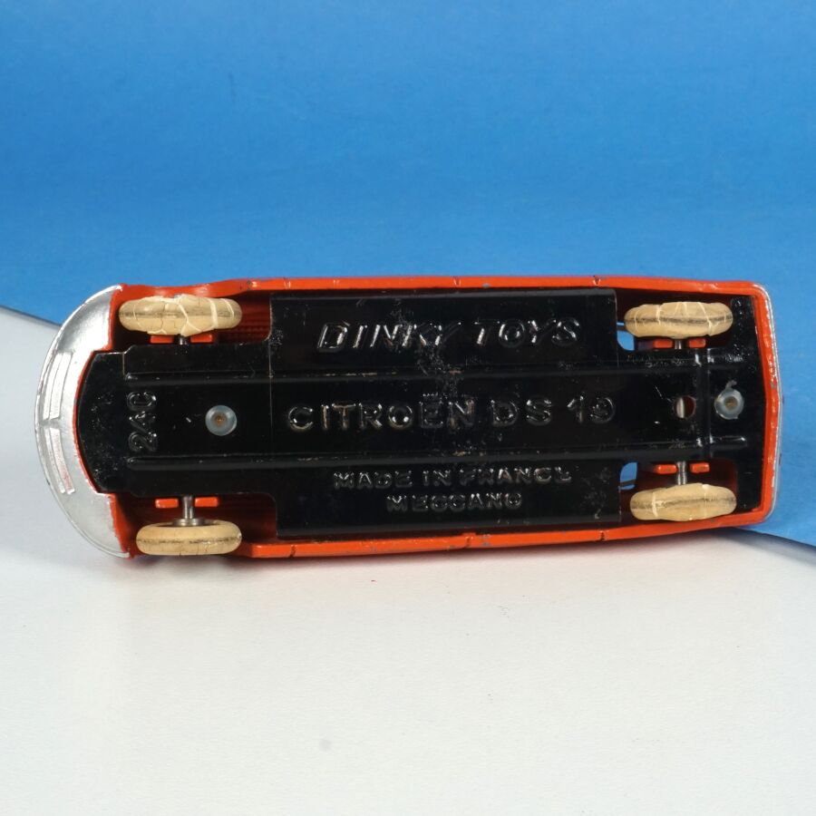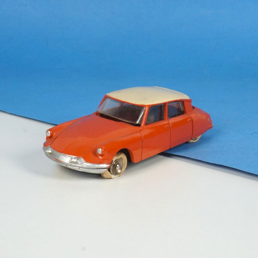 DINKY TOYS : Ensemble de 5 véhicules, échelle 1/43ème, comprenant (1) Citroën Break ID 19, réf. 539, dorée, toit blanc intérieur rouge, avec glaces, coffre ouvrant ; (1) Citroën DS 19, réf. 24C, beige toit noir ; (1) Citroën DS 19, réf. 24C, verte toit beige, avec glaces ; (1) Citroën DS 19, réf. 24C, orange toit beige, avec glaces et (1) Citroën DS 19, réf. 24C, verte toit beige (écaillures, usures, la DS19 verte avec glaces est en l'état).