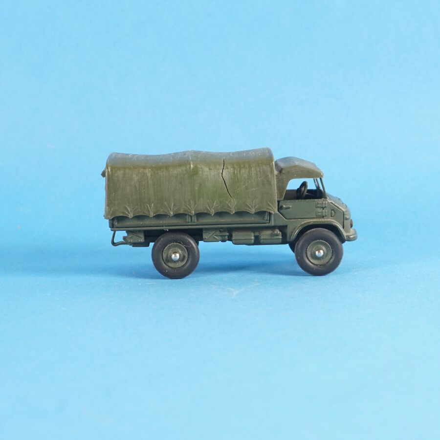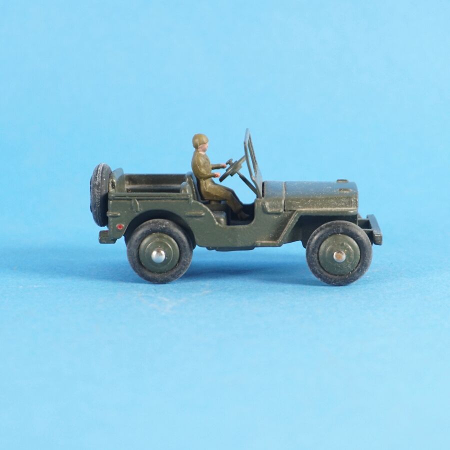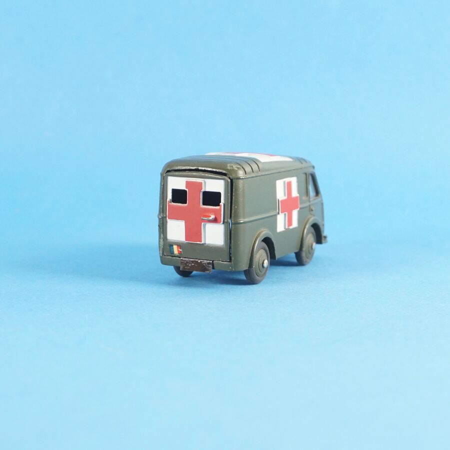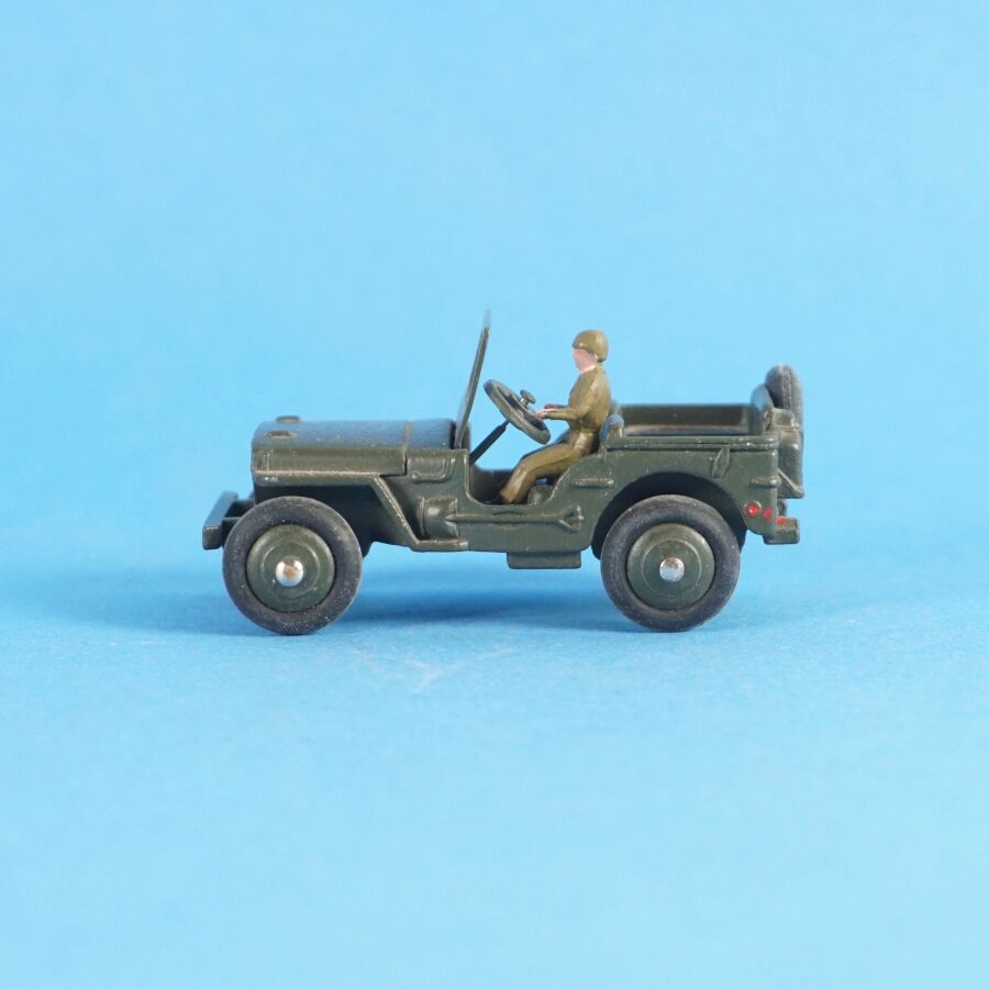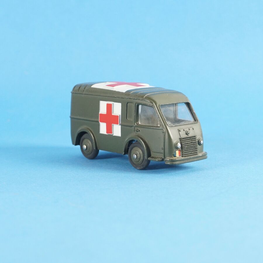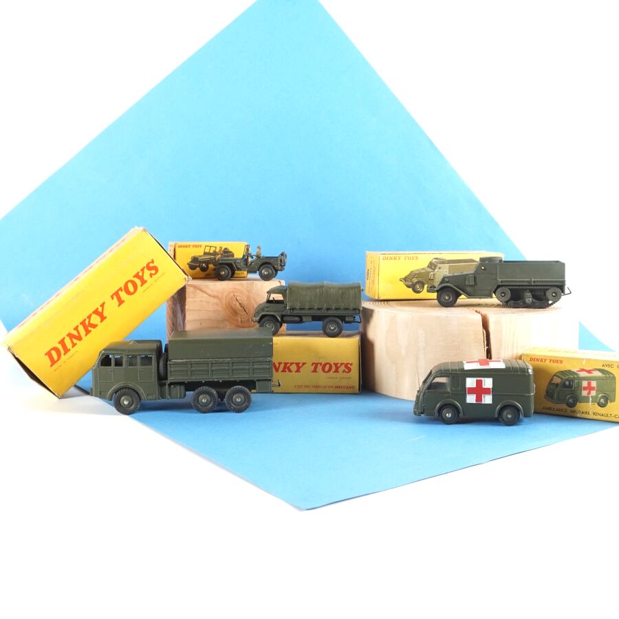 DINKY TOYS : Ensemble de 5 véhicules militaires, échelle 1/43ème, comprenant : (1) Jeep Hotchkiss-Willys, réf. 816, dans sa boîte d'origine (usures à la boîte, quelques traces) ; (1) Half-track M 3, réf. 822, dans sa boîte d'origine (usures à la boîte, quelques traces) ; (1) Unimog Mercedes, camionnette militaire, réf. 821, dans sa boîte d'origine (usures et inscriptions à la boîte, quelques traces, fente à la bâche) ; (1) Ambulance militaire Renault-Carrier, réf. 80F, avec glaces, dans sa boîte d'origine (usures à la boîte et manques quelques languettes, quelques traces) et (1) Camion militaire Berliet tous terrains, réf. 80D, dans sa boîte d'origine (usures à la boîte, quelques traces).
