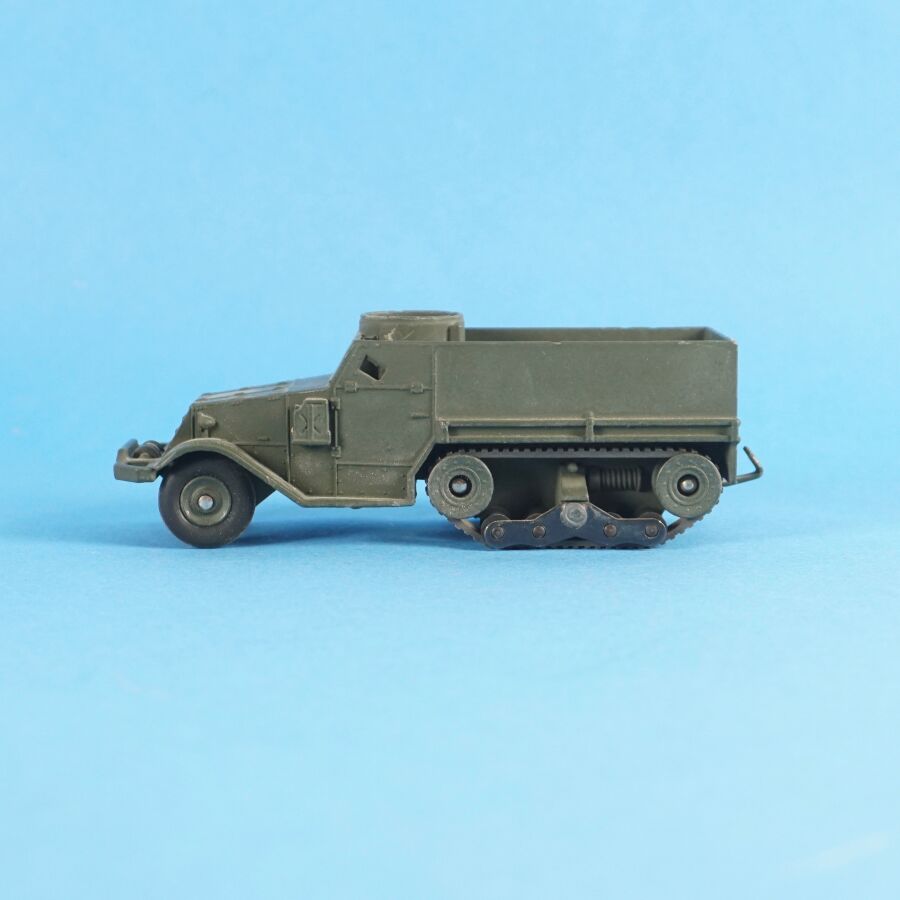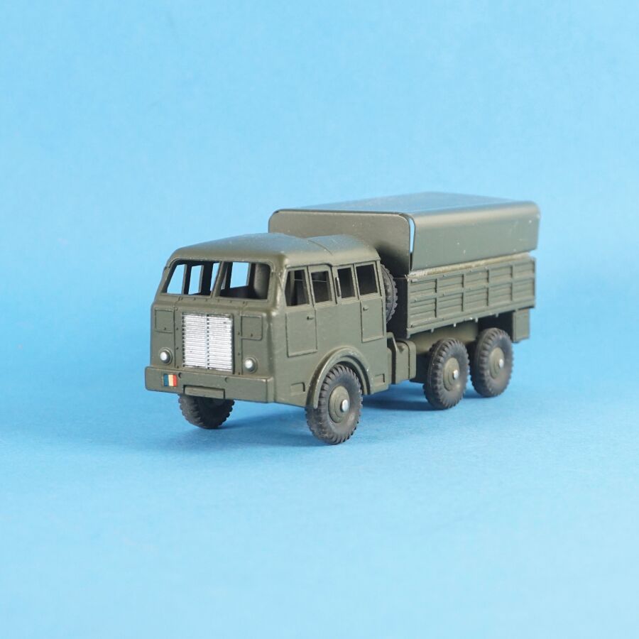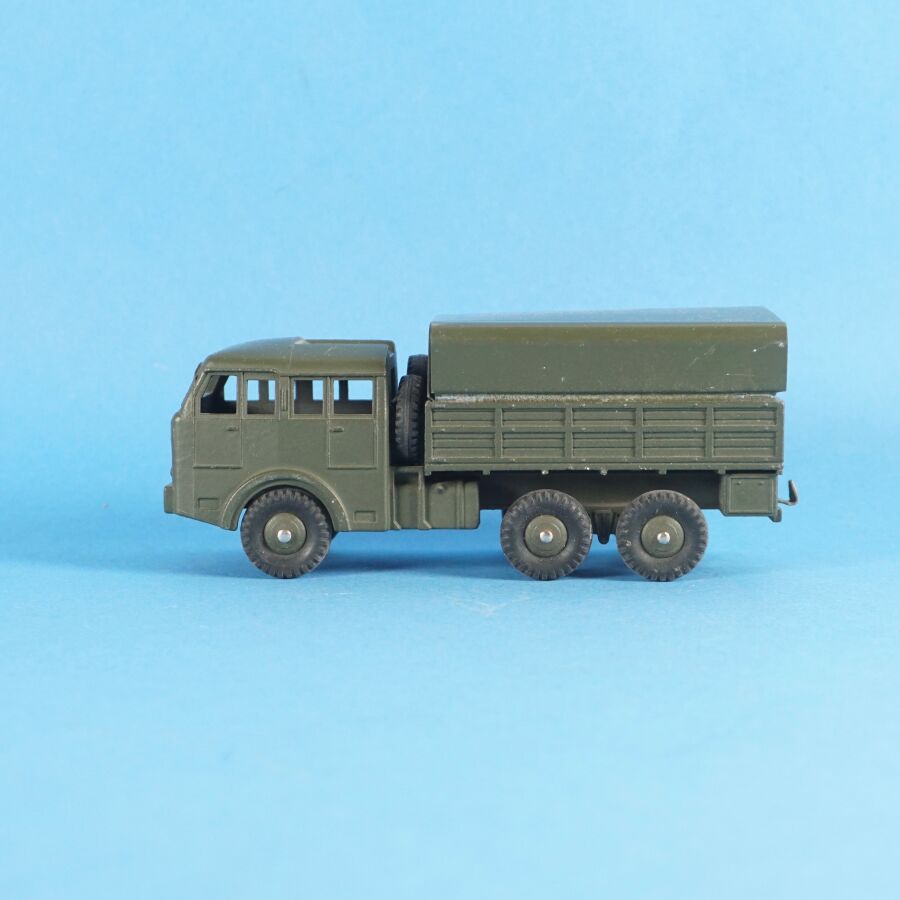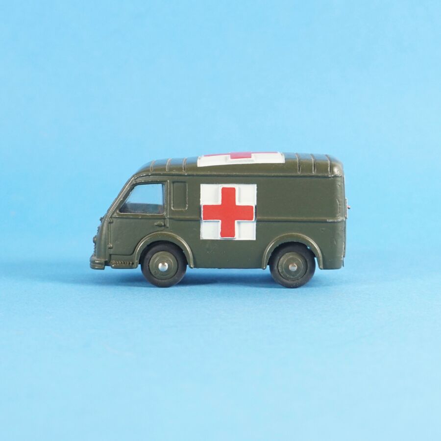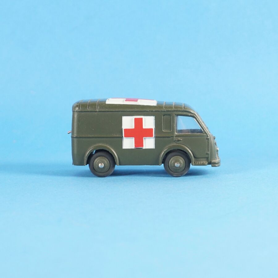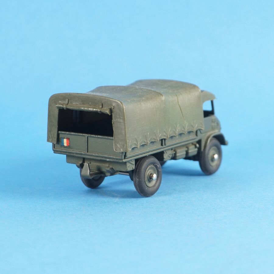 DINKY TOYS : Ensemble de 5 véhicules militaires, échelle 1/43ème, comprenant : (1) Jeep Hotchkiss-Willys, réf. 816, dans sa boîte d'origine (usures à la boîte, quelques traces) ; (1) Half-track M 3, réf. 822, dans sa boîte d'origine (usures à la boîte, quelques traces) ; (1) Unimog Mercedes, camionnette militaire, réf. 821, dans sa boîte d'origine (usures et inscriptions à la boîte, quelques traces, fente à la bâche) ; (1) Ambulance militaire Renault-Carrier, réf. 80F, avec glaces, dans sa boîte d'origine (usures à la boîte et manques quelques languettes, quelques traces) et (1) Camion militaire Berliet tous terrains, réf. 80D, dans sa boîte d'origine (usures à la boîte, quelques traces).