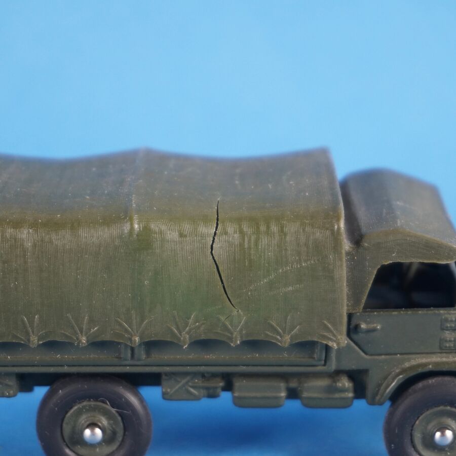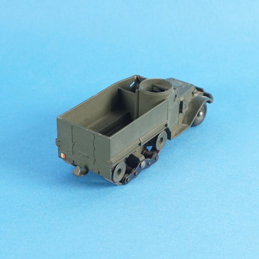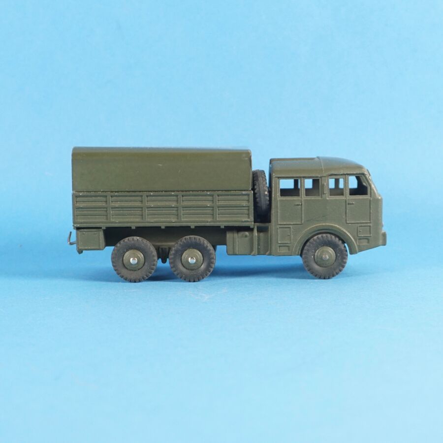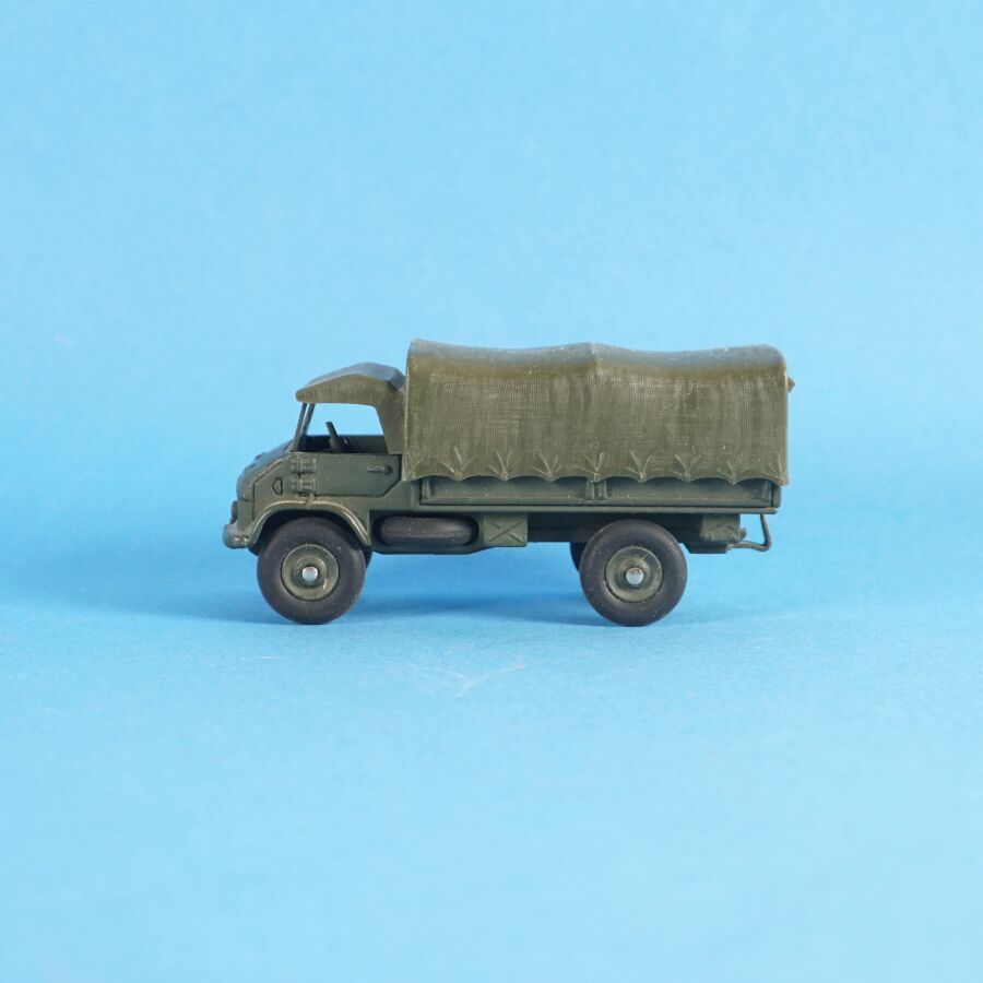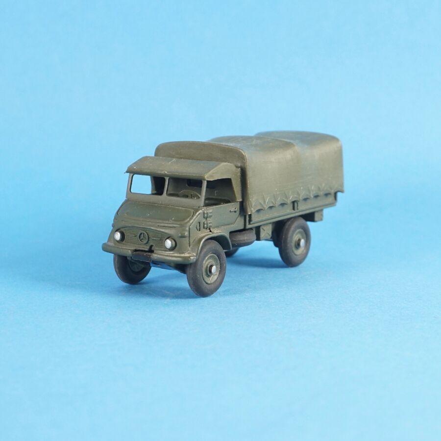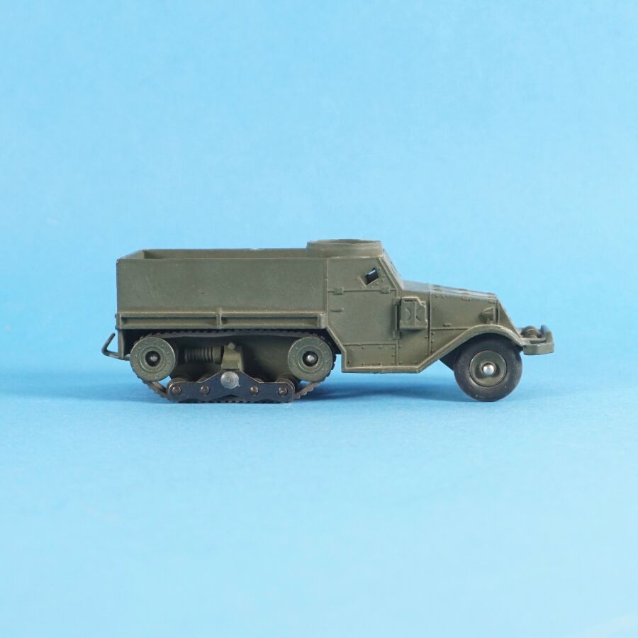 DINKY TOYS : Ensemble de 5 véhicules militaires, échelle 1/43ème, comprenant : (1) Jeep Hotchkiss-Willys, réf. 816, dans sa boîte d'origine (usures à la boîte, quelques traces) ; (1) Half-track M 3, réf. 822, dans sa boîte d'origine (usures à la boîte, quelques traces) ; (1) Unimog Mercedes, camionnette militaire, réf. 821, dans sa boîte d'origine (usures et inscriptions à la boîte, quelques traces, fente à la bâche) ; (1) Ambulance militaire Renault-Carrier, réf. 80F, avec glaces, dans sa boîte d'origine (usures à la boîte et manques quelques languettes, quelques traces) et (1) Camion militaire Berliet tous terrains, réf. 80D, dans sa boîte d'origine (usures à la boîte, quelques traces).