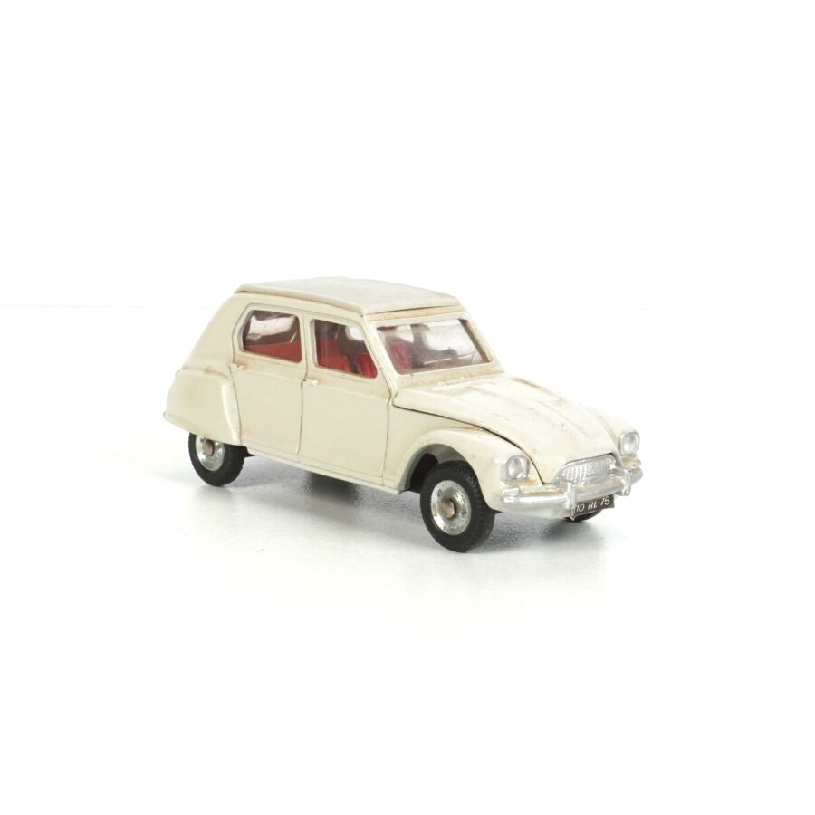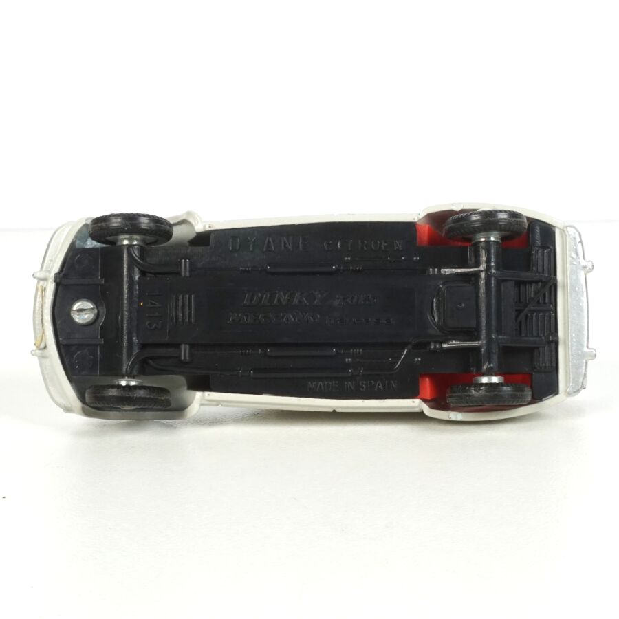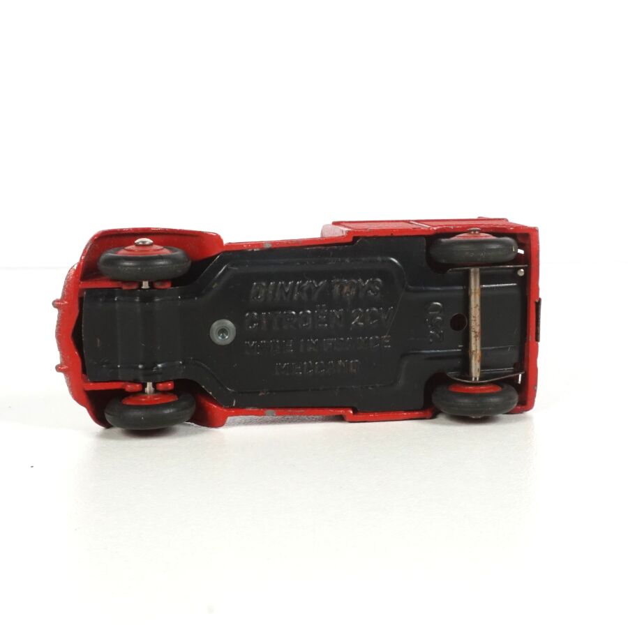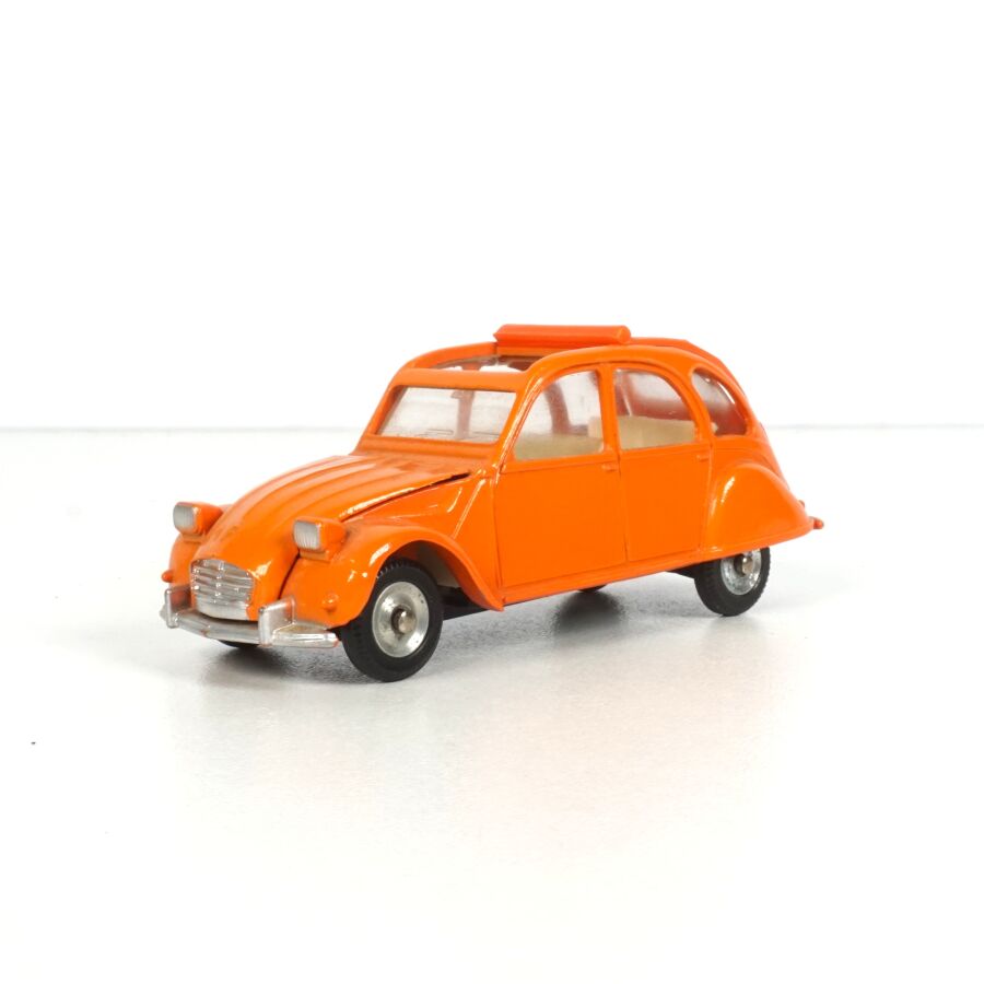 DINKY TOYS : Ensemble de 6 véhicules, échelle 1/43ème, comprenant (1) Citroën 2CV fourgonnette, réf. 25D, rouge, coffre ouvrant ; (2) Dyane Citroën, réf. 1413, beige, coffre et capot ouvrants ; (1) Citroën 2CV, réf. 500, orange ; (1) Citroën 2CV grise et (1) 2CV Citroën, réf. 558, jaune (légères usures).