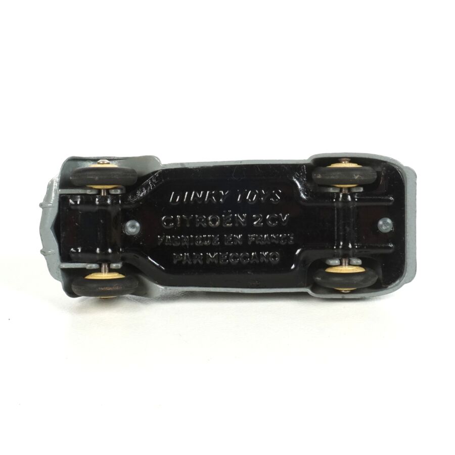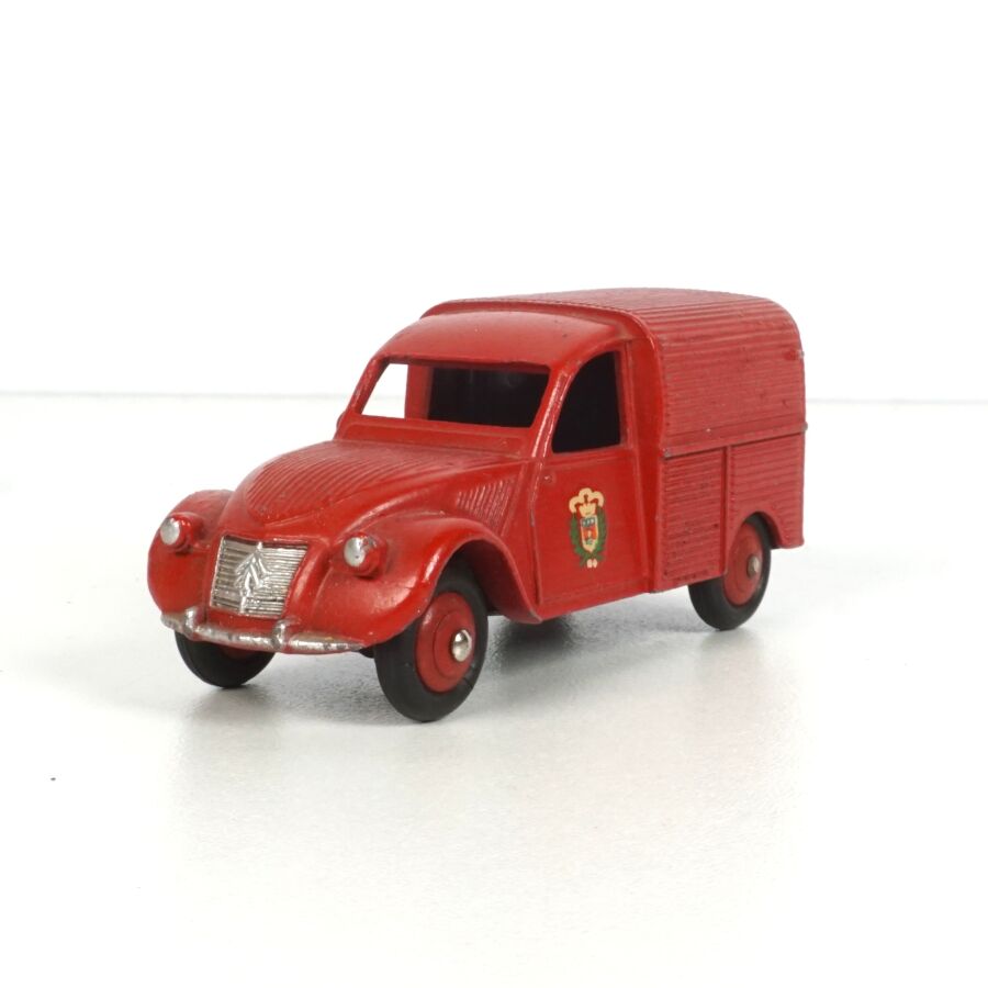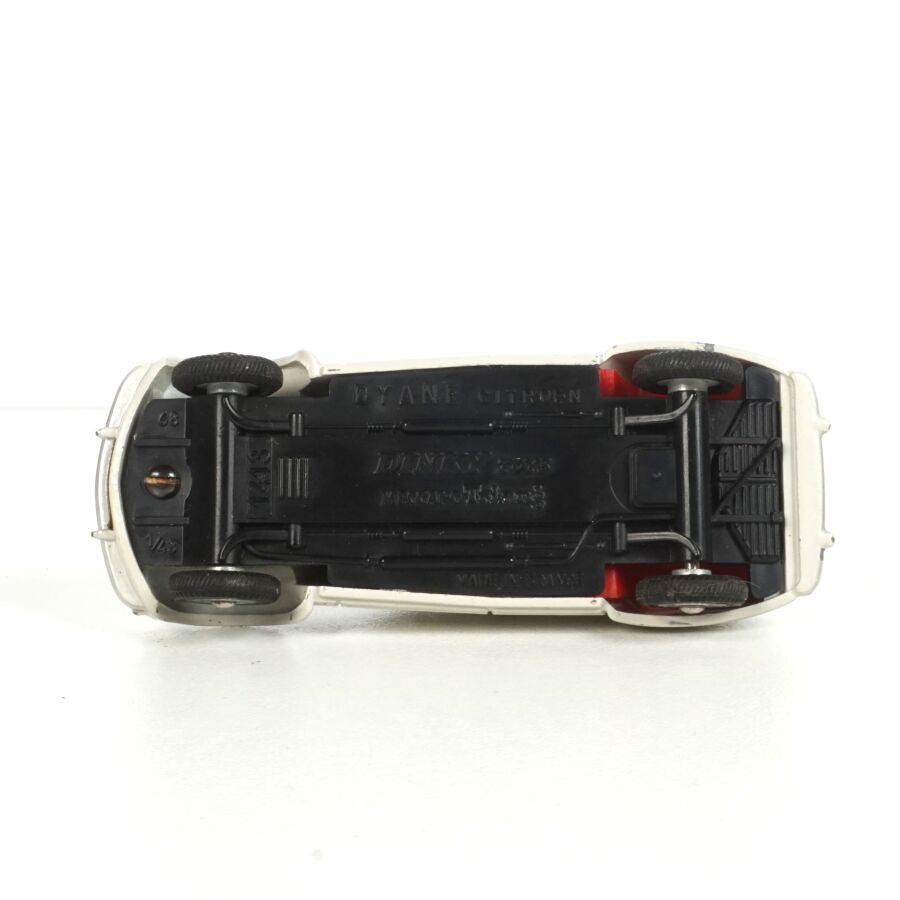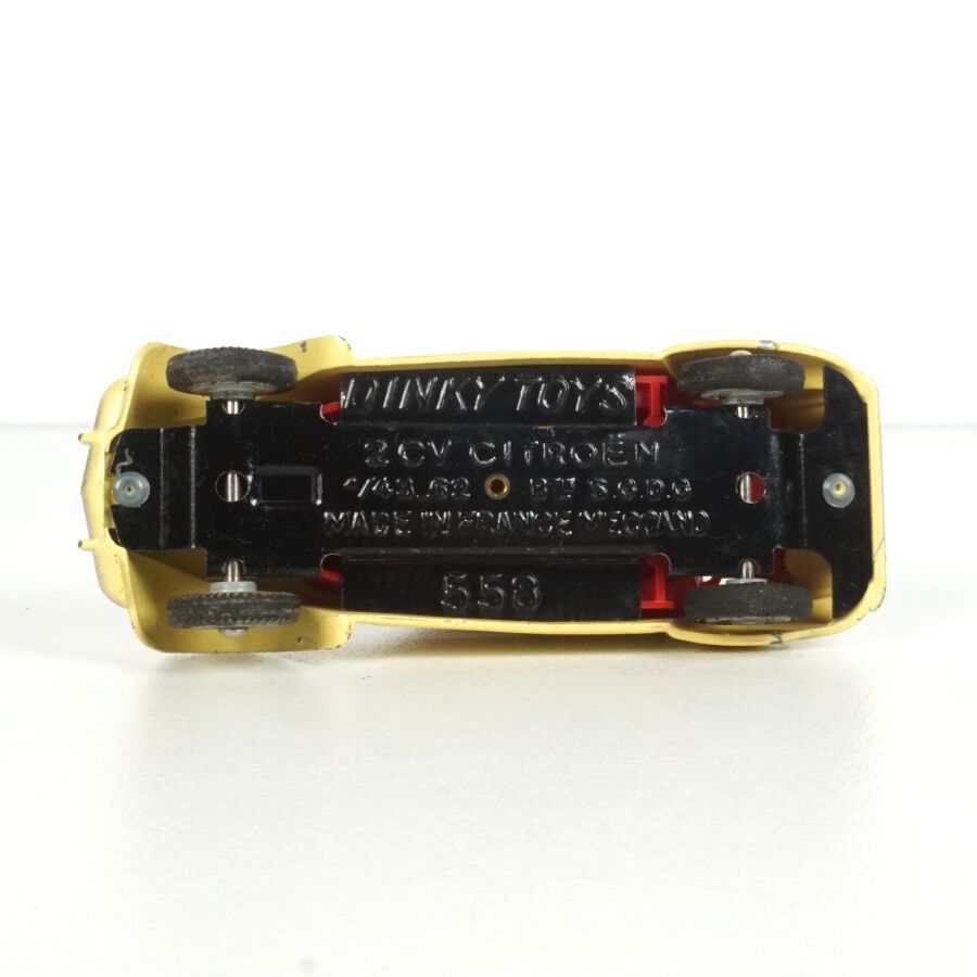 DINKY TOYS : Ensemble de 6 véhicules, échelle 1/43ème, comprenant (1) Citroën 2CV fourgonnette, réf. 25D, rouge, coffre ouvrant ; (2) Dyane Citroën, réf. 1413, beige, coffre et capot ouvrants ; (1) Citroën 2CV, réf. 500, orange ; (1) Citroën 2CV grise et (1) 2CV Citroën, réf. 558, jaune (légères usures).
