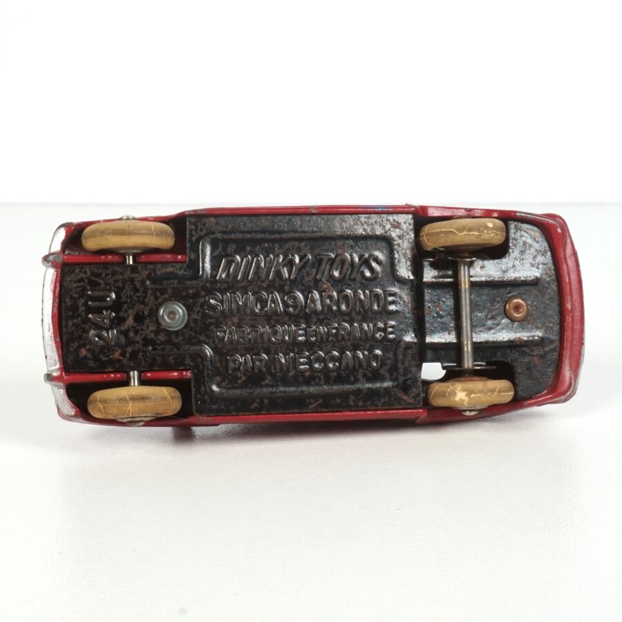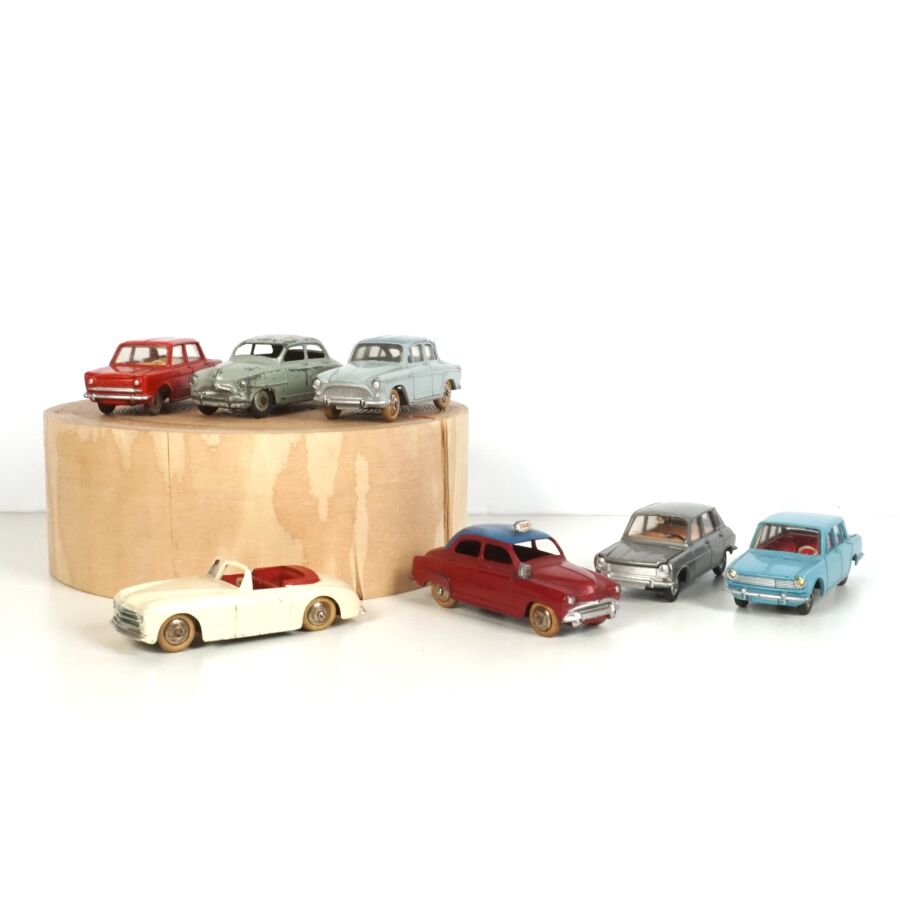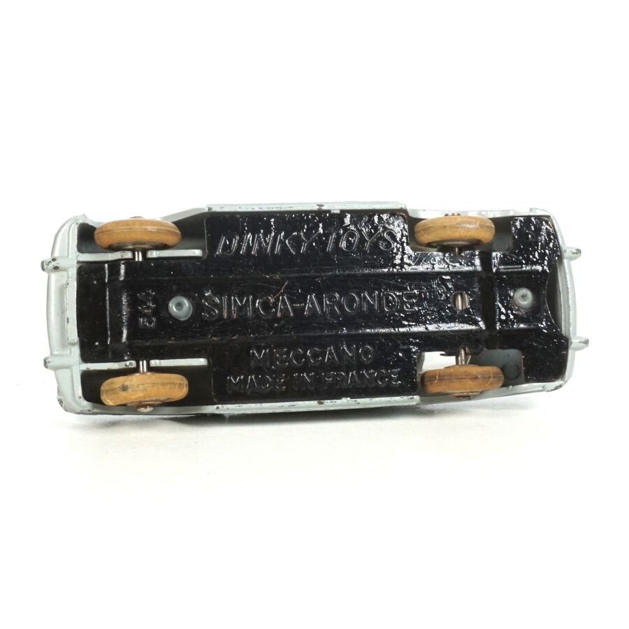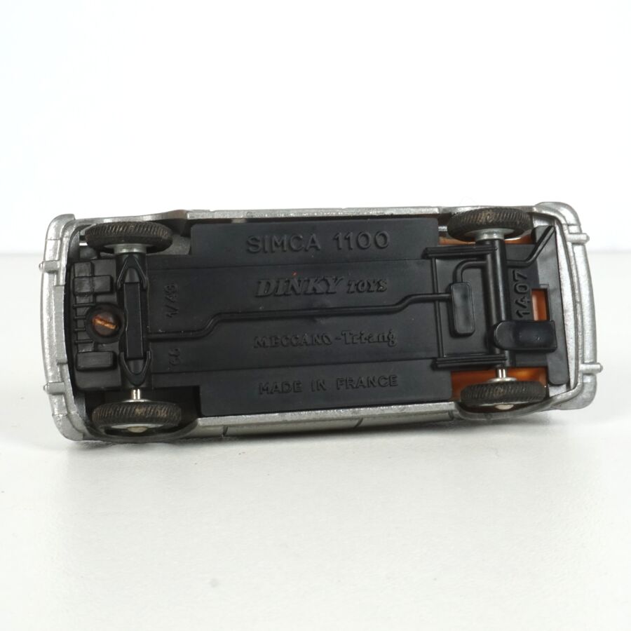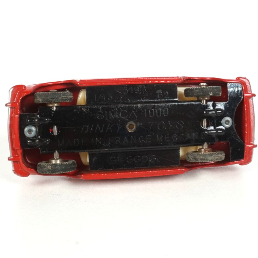DINKY TOYS : Ensemble de 7 véhicules, échelle 1/43ème, comprenant (1) Taxi Simca 9 Aronde, réf. 24U, rouge toit bleu ; (1) Simca 1100, réf. 1407, grise, avec glaces, coffre et capot ouvrant ; (1) Simca 8 Sport, beige ; (1) Simca 1500, réf. 523, bleue, avec glaces ; (1) Simca 1000, réf. 519, rouge, avec glaces ; (1) Simca 9 Aronde, réf. 24U, grise et (1) Simca-Aronde, réf. 544, grise toit bleu/gris, avec glaces (quelques usures et écaillures, la Simca 9 Aronde grise en l'état).