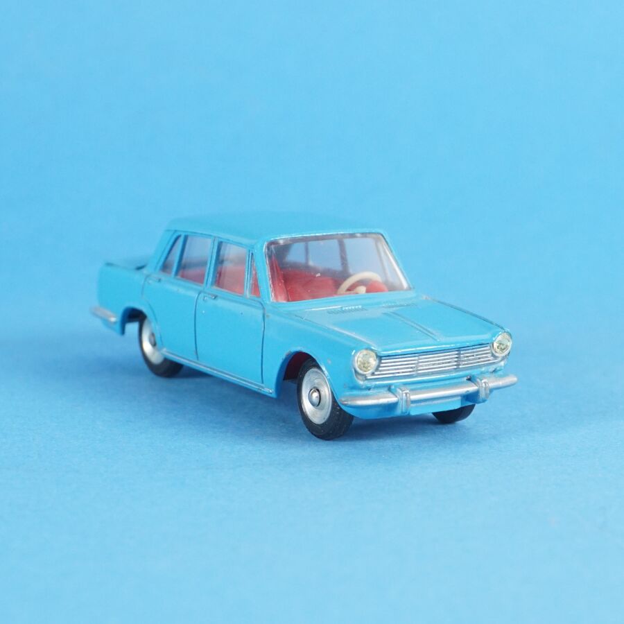 DINKY TOYS : Ensemble de quatre véhicules, échelle 1/43ème, comprenant (1) Break simca 1500, réf. 507, gris clair ; (1) Fiat 600 D, réf. 520, blanche ; (1) Simca 1500 réf. 523, bleue avec trois bagages et (1) Chrysler "New Yorker" réf. 24A, bleue, dans leurs boîtes d'origine (usures aux boîtes, infimes usures).