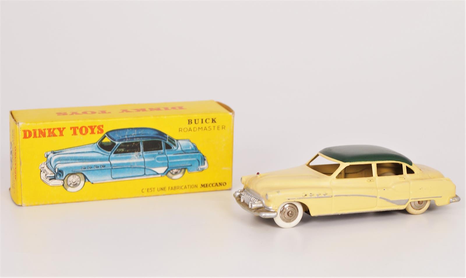 DINKY TOYS France : Buick Roadmaster, réf. 24V, couleur jaune, toit vert foncé, dans sa boîte d'origine), L. 11,5 cm (boîte avec inscriptions stylo, légères traces et écaillures à la peinture).
