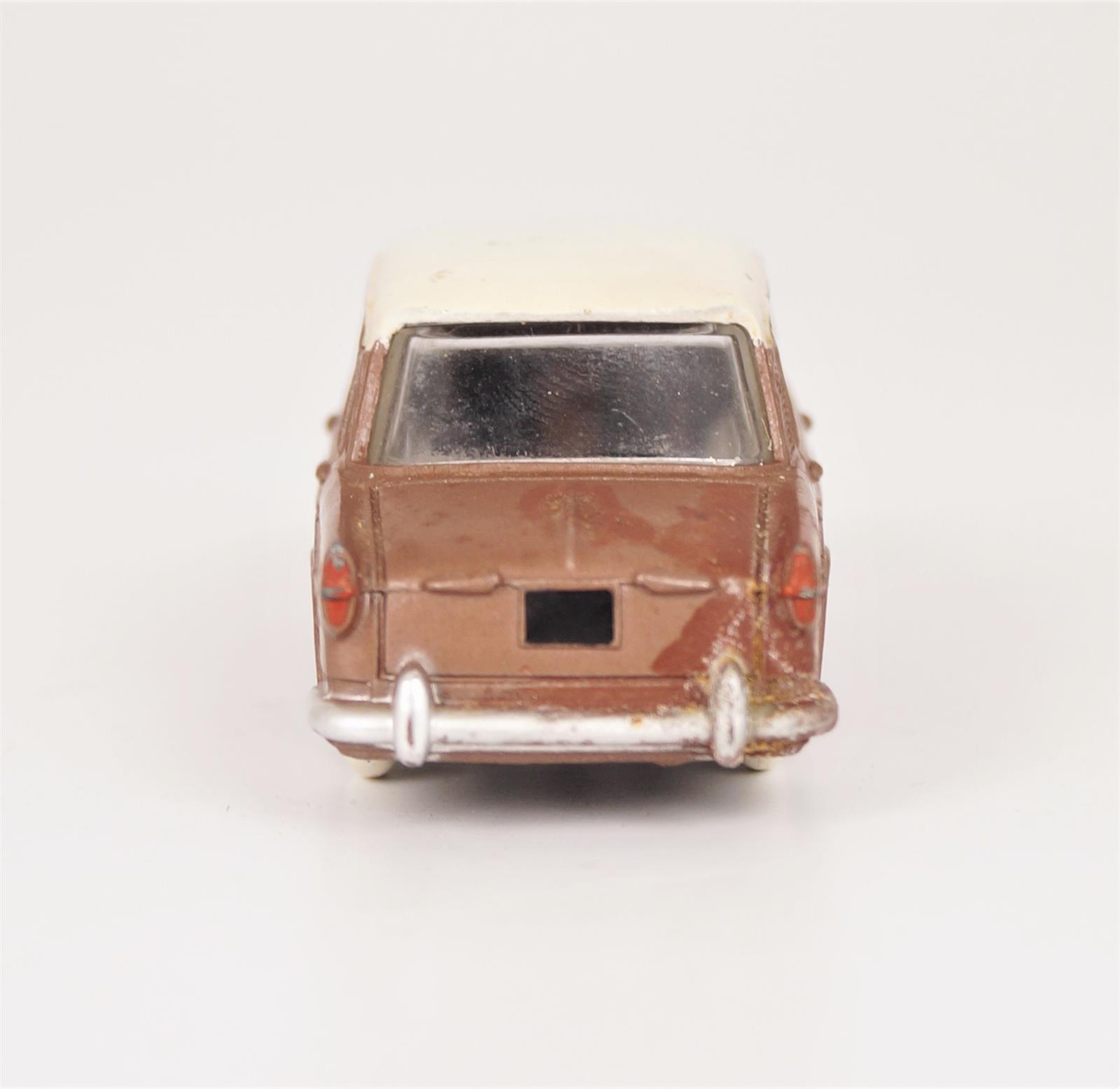DINKY TOYS France : Fiat 1200 "Grande Vue", réf. 531, couleur marron, toit blanc, avec glaces, dans sa boîte d'origine, L. 9.5 cm (légères traces à la voiture, inscription au crayon de papier et infimes usures à la boîte).