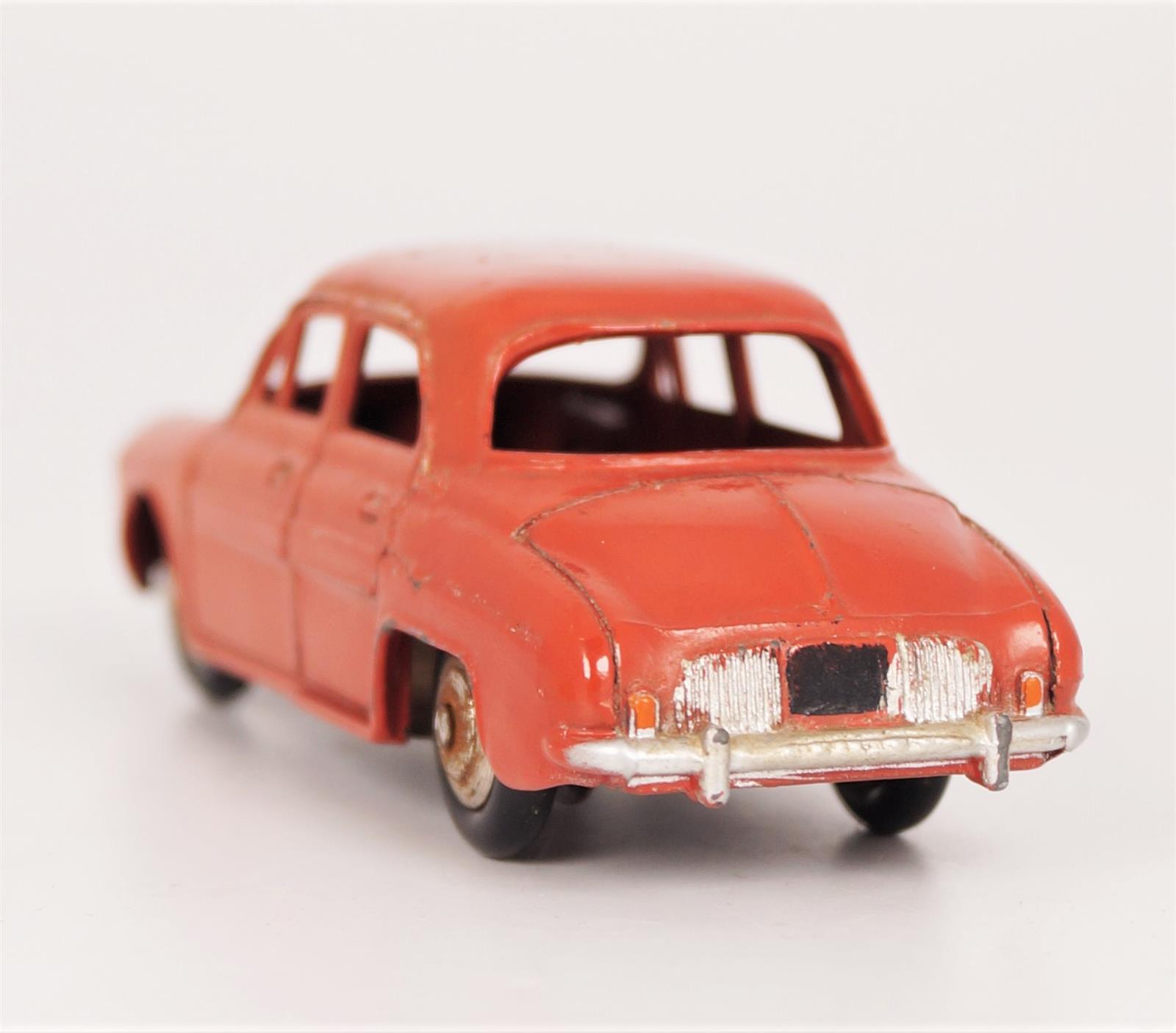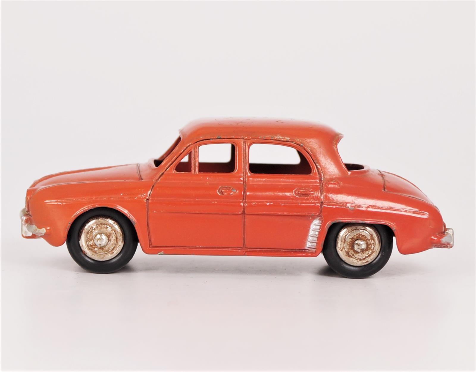 DINKY TOYS France : Renault "Dauphine", réf 24E, couleur rouille, sans glaces, dans sa boîte d'origine, L. 9,5 cm (quelques pliures à la boîte).