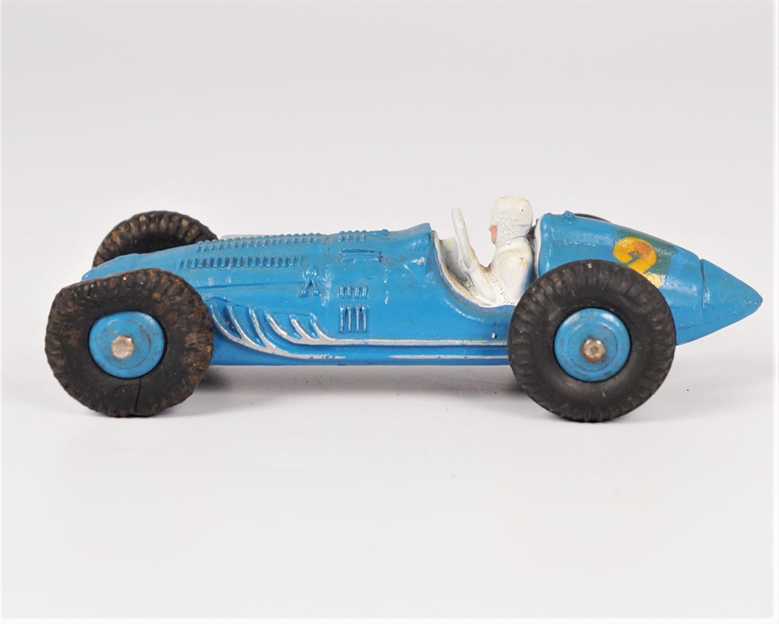 DINKY TOYS : Lot de 4 voitures modèles compétition dont : 1 McLaren M8A, réf. 223, blanche et bleue, intérieur rouge, n°5, coffre ouvrant ; 1 Talbot Lago, réf. 23H, bleue, avec pilote, n°2 ; 1 BRM Racing car, réf. 243, verte, avec pilote, n°7 ; 1 Maserati, réf. 224, rouge avec pilote, L. de 8 cm à 9.5 cm (sans boîtes, infimes usures).
