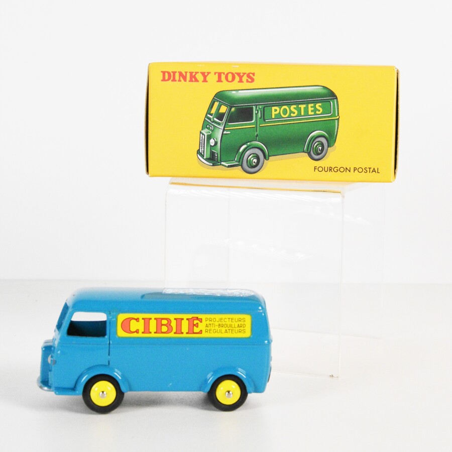 DINKY TOYS : Peugeot D.3.A "Cibié projecteur anti-brouillard régulateurs" réf. 25B couleur turquoise et logo jaune et rouge, dans une boîte "Fourgon postal", édition Atlas, L. 8.5 cm, bel état.