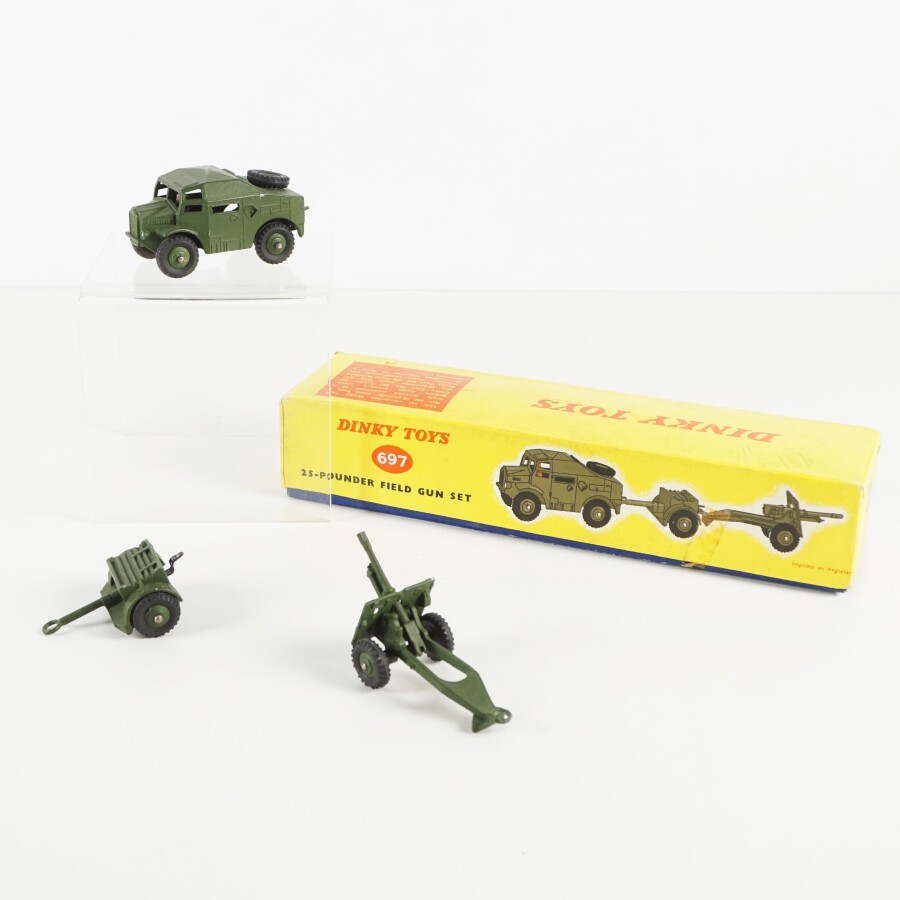 DINKY TOYS : Pièce d'artillerie de 25 livres, réf.697, échelle 1/43ème, présentée dans sa boîte d'origine (écritures et usures à la boîte).