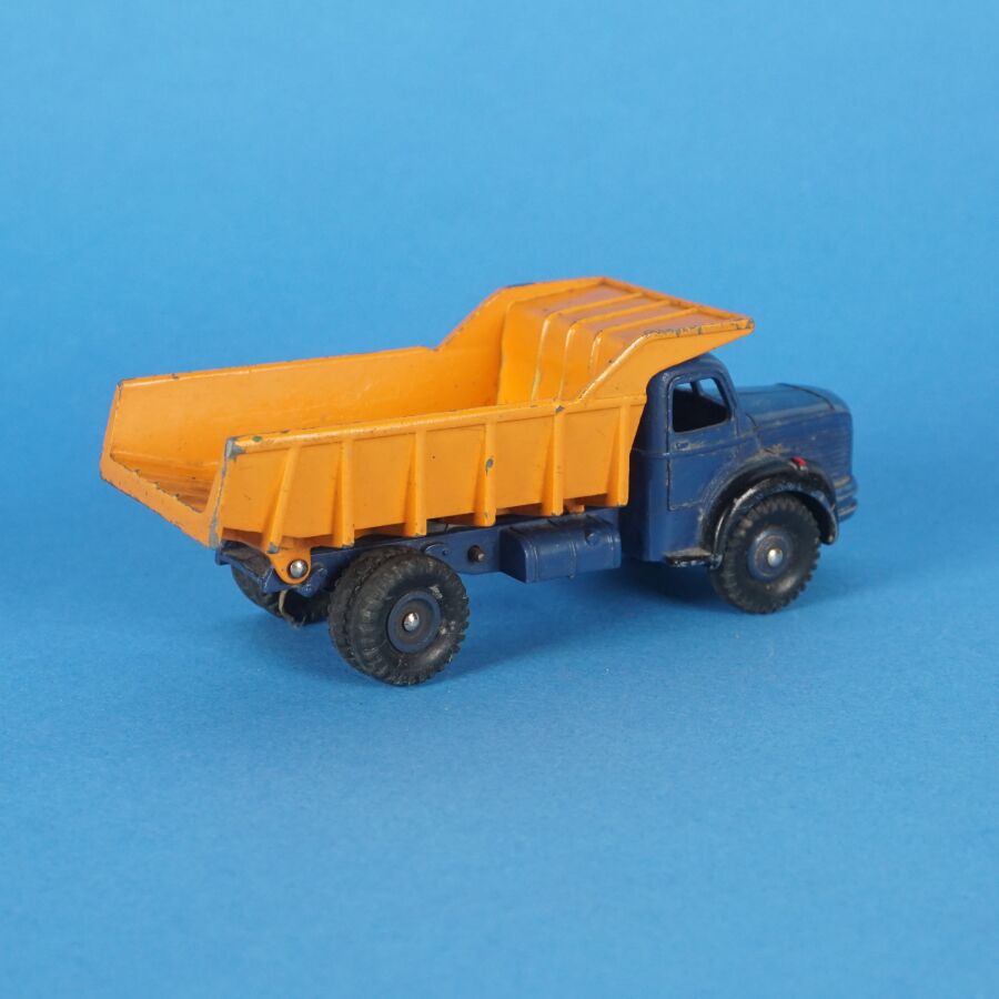 DINKY TOYS - SUPERTOYS : Ensemble de 5 véhicules utilitaires / engins, échelle 1/43ème, comprenant : (1) Simca cargo, réf. 33, "Saint-Gobain, miroitier", jaune et vert ; (1) Balayeuse, LMV, réf. 596, beige et verte (balaie en l'état) ; (1) Camion benne Berliet "34", bleu et benne orange ; (1) Multibenne UNIC, réf. 38A, grise et jaune et (1) Bulldozer "Blow Know", réf. 885 (sans chenilles en caoutchouc), sans boîtes (écaillures, manques, usures, en l'état).