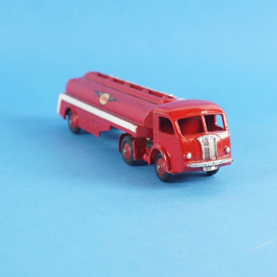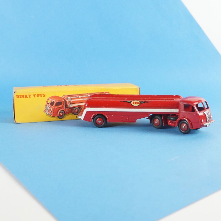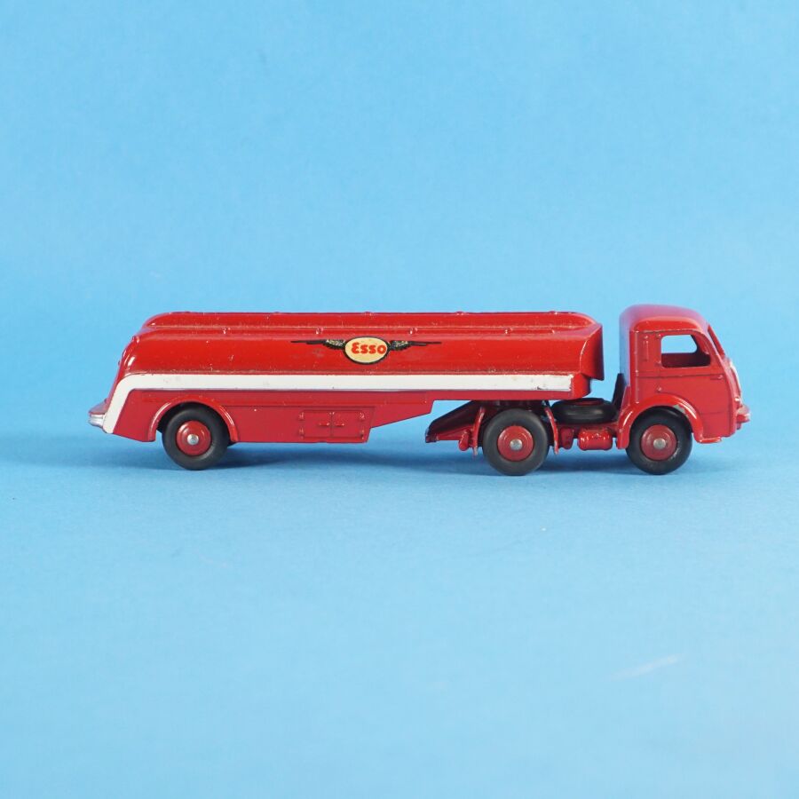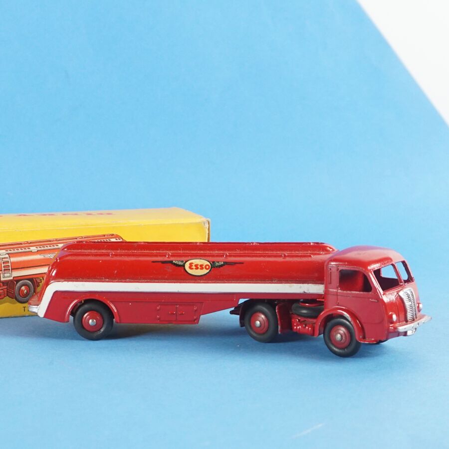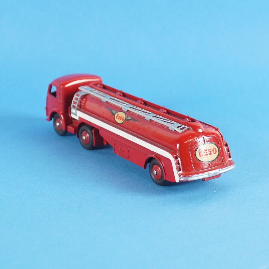 DINKY TOYS : Tracteur Panhard avec semi-remorque citerne TITAN, réf. 32C, couleur rouge, logo "Esso" effacé, dans sa boîte d'origine (usures à la boîte, petites traces à la peinture).