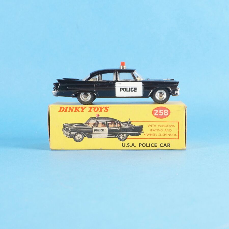 DINKY TOYS : U.S.A Police car, réf. 258, échelle 1/43ème, avec glaces, présenté dans sa boîte d'origine (petites usures à la boîte, infime écaillure).