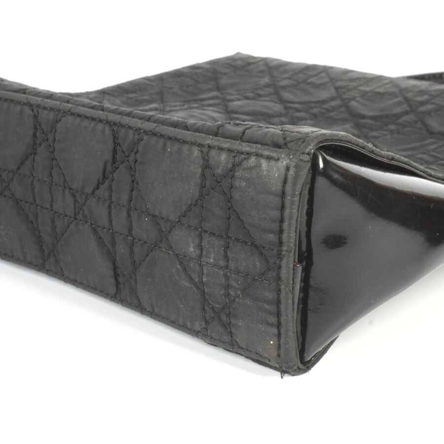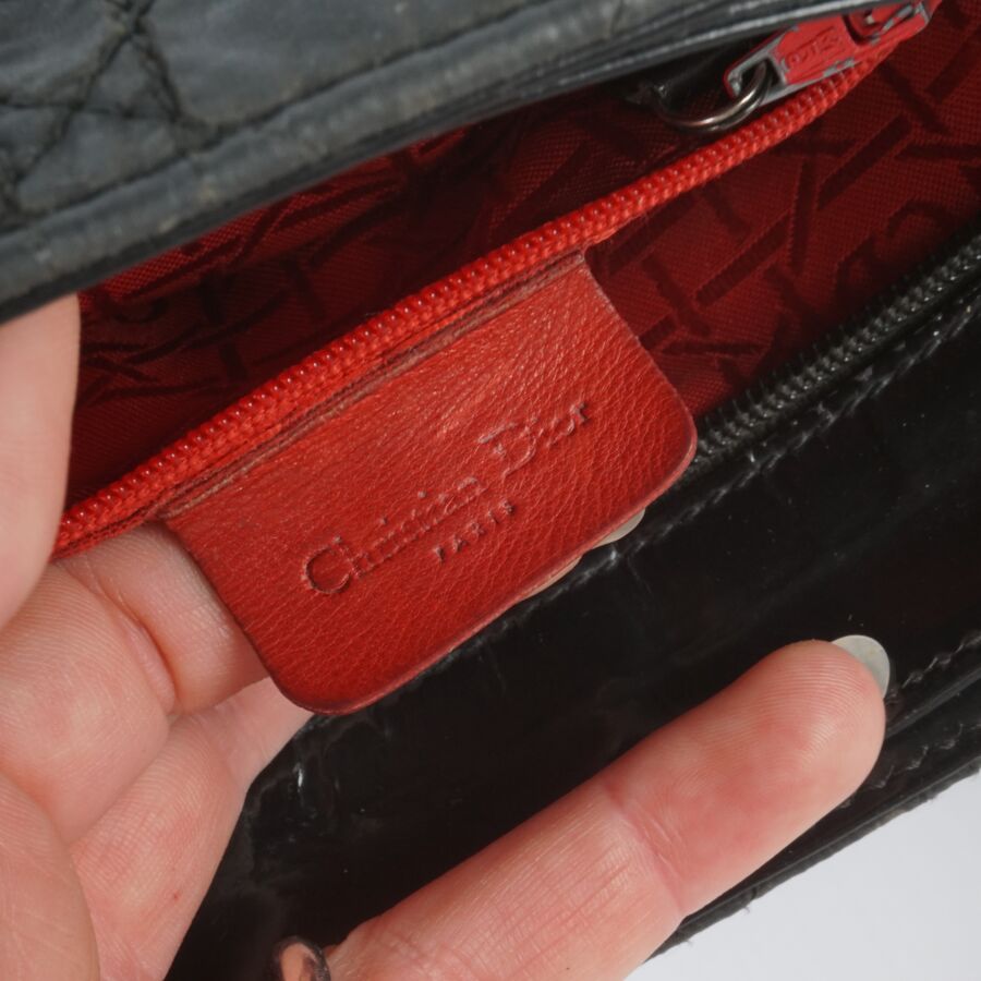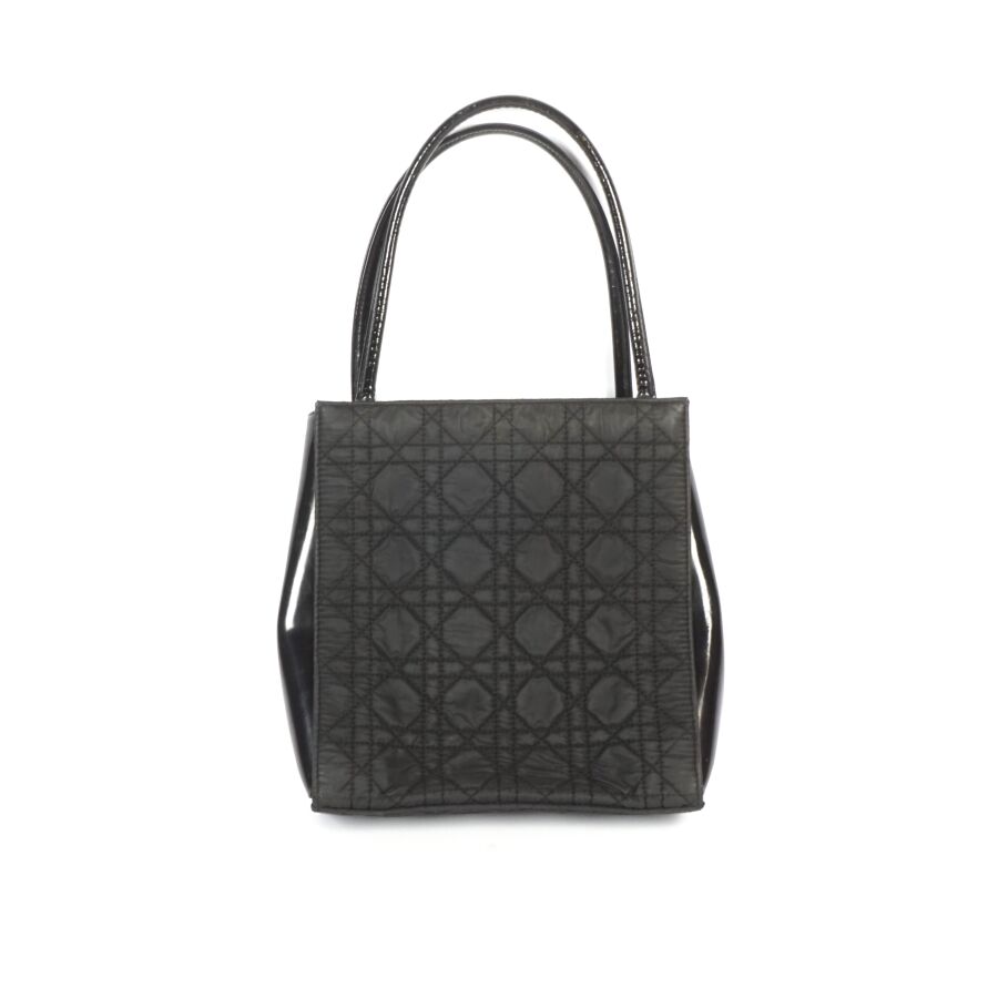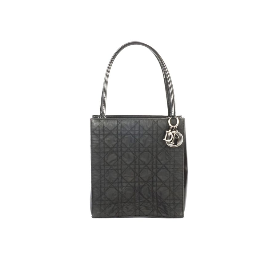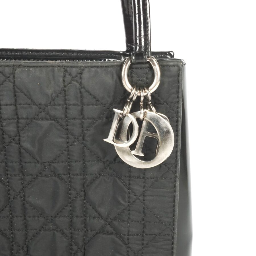 DIOR : Sac à main modèle "Lady Dior" en nylon matelassé et et cuir lisse de couleur noir, deux anses pour un porté main, fermeture principale zippée, intérieur rouge logoté "CD", pochette intérieure zippée avec plaque en cuir rouge logotée et numérotée, avec sa bijouterie "DIOR" en métal argenté, H. Hors anses : 22 cm. H. Avec anses : 39 cm. L. 21.5 cm. Larg. 7.5 cm (usures notamment aux coins inférieurs, traces).