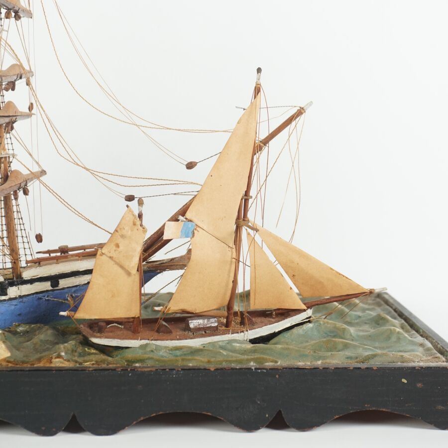 Diorama d'un trois-mâts barque accompagné de son bateau pilote sur une mer formée en mastic, L. 49.5 cm. H. 31 cm. (accidents au mât, usures, manques).
