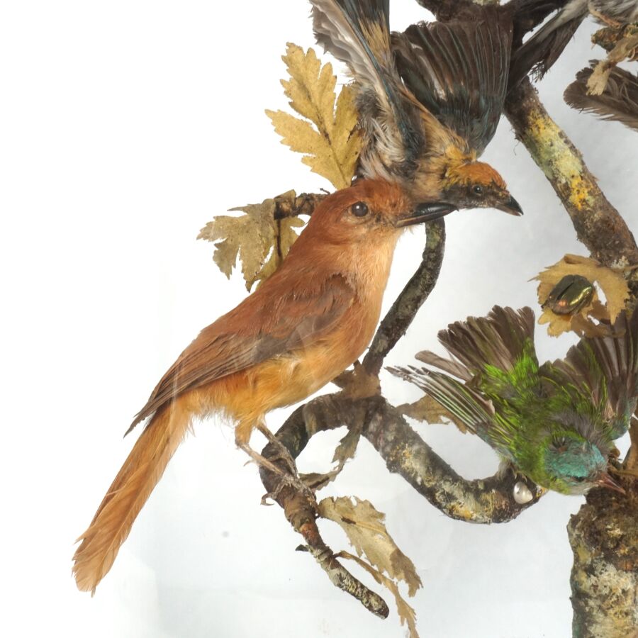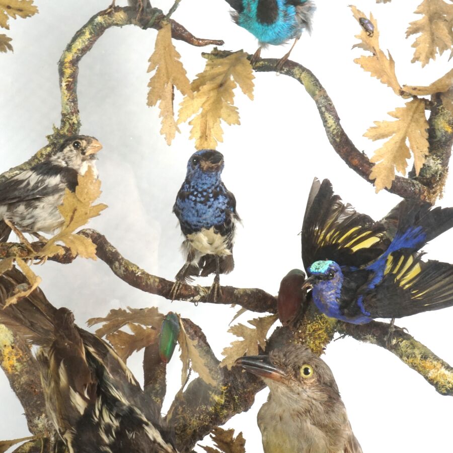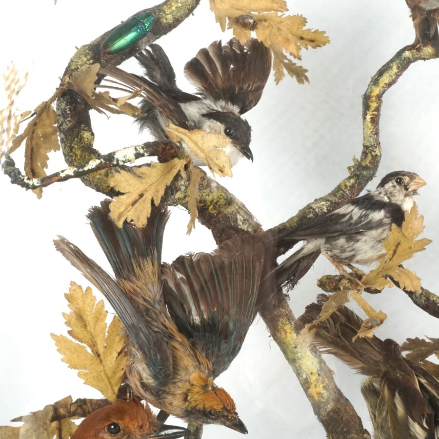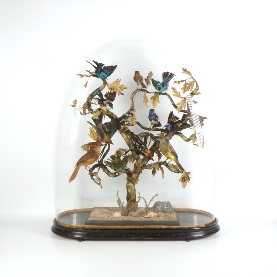 Diorama figurant des oiseaux et insectes branchés, travail de taxidermie d'époque Napoléon III, présenté avec son socle en bois noirci de forme ovale et son globe en verre, Dim. Totale : 66 x 55 cm (petites usures).