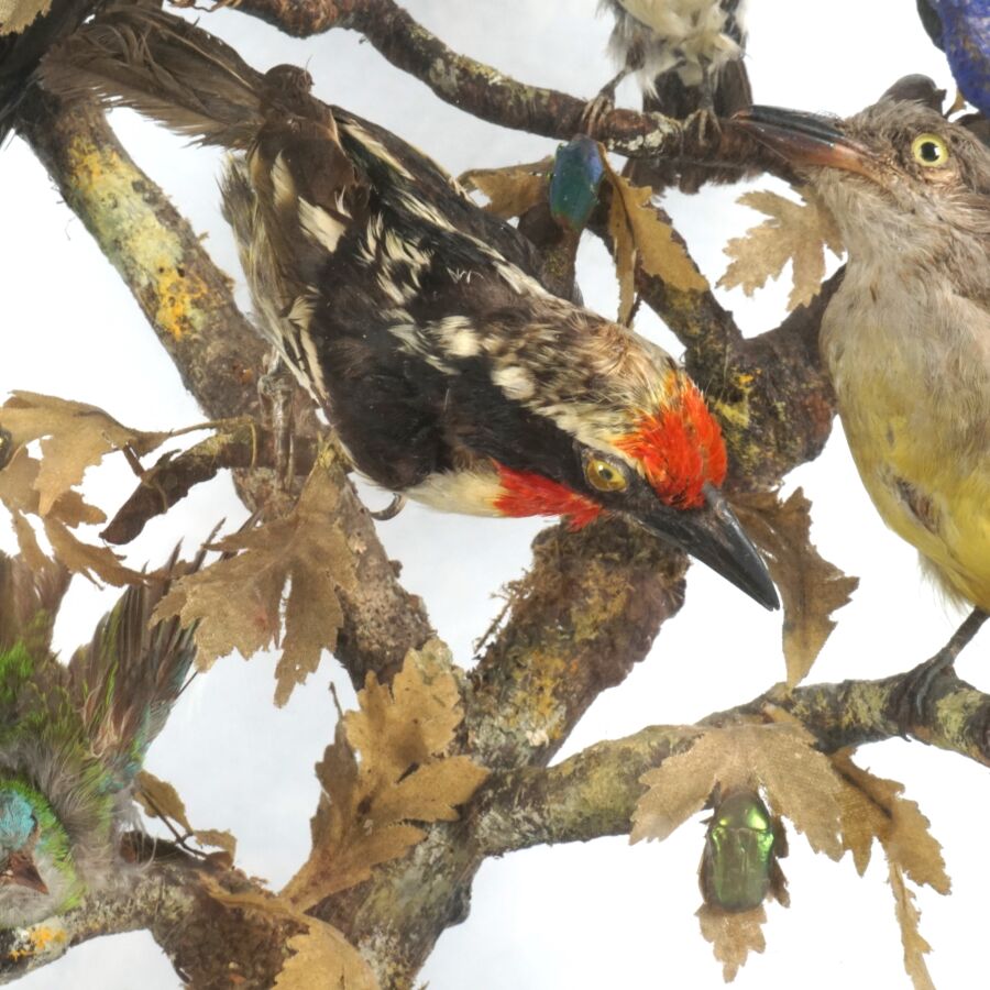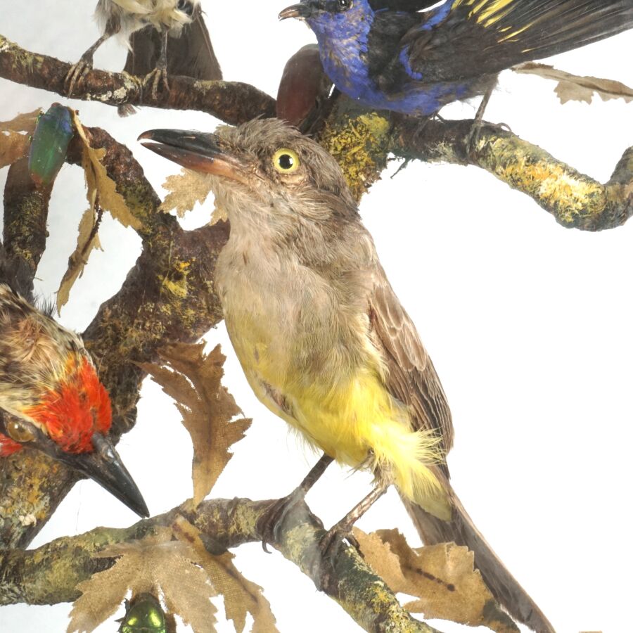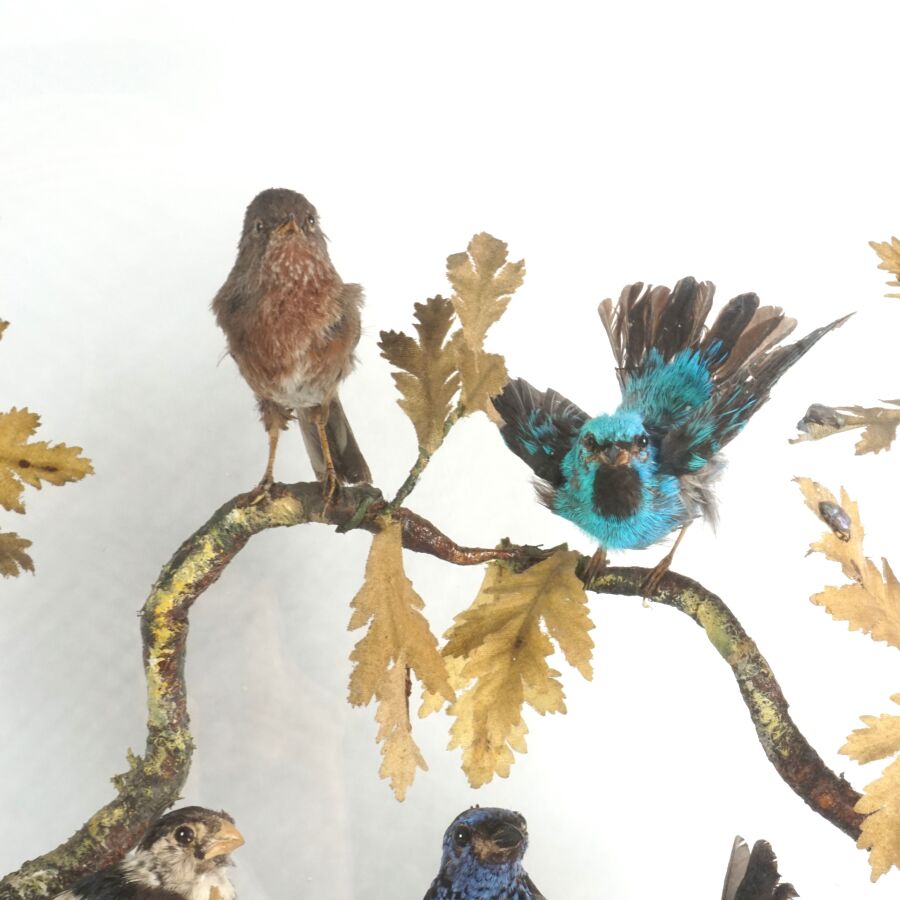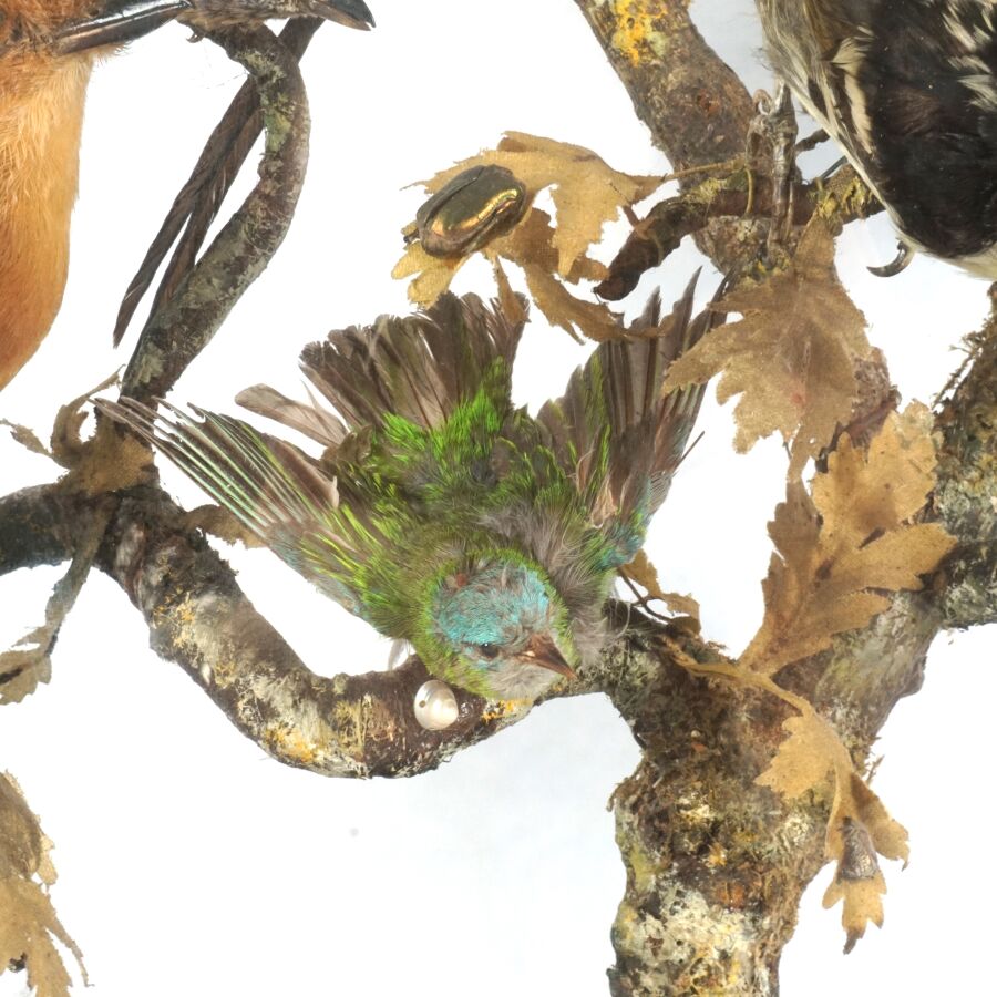 Diorama figurant des oiseaux et insectes branchés, travail de taxidermie d'époque Napoléon III, présenté avec son socle en bois noirci de forme ovale et son globe en verre, Dim. Totale : 66 x 55 cm (petites usures).