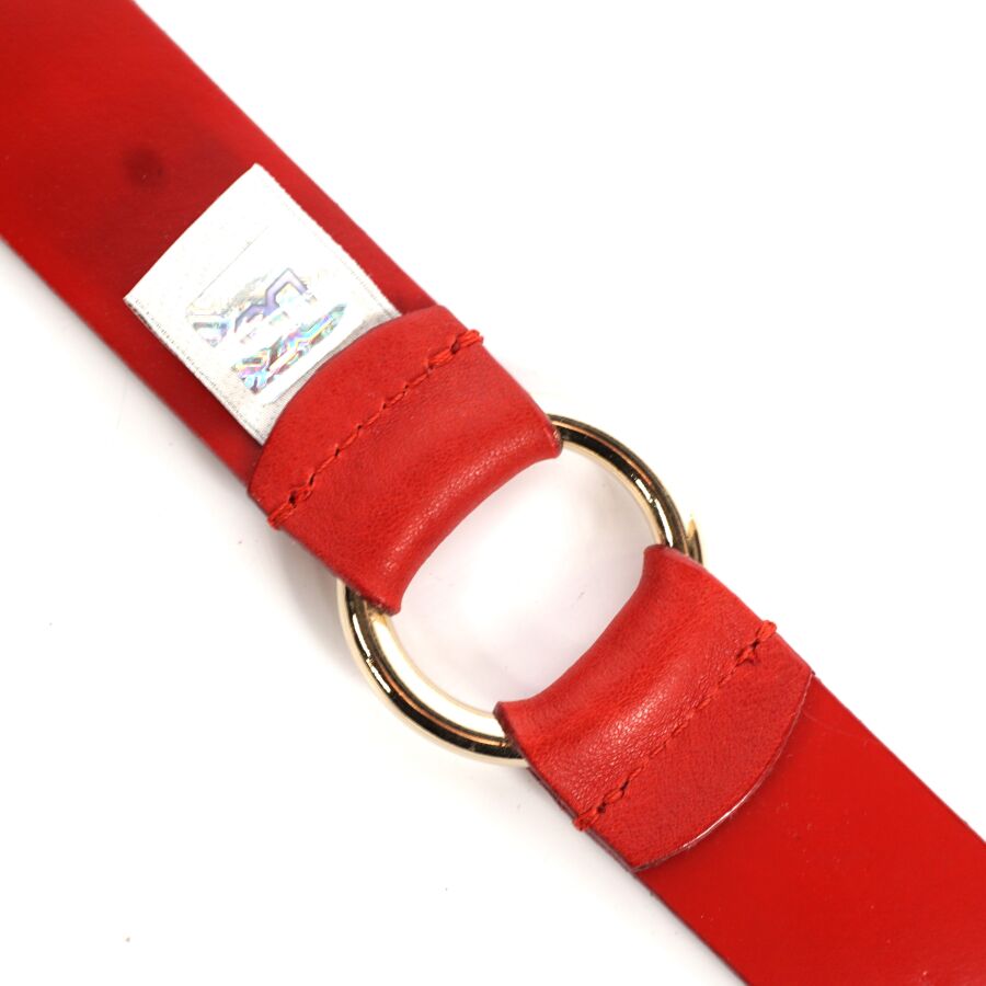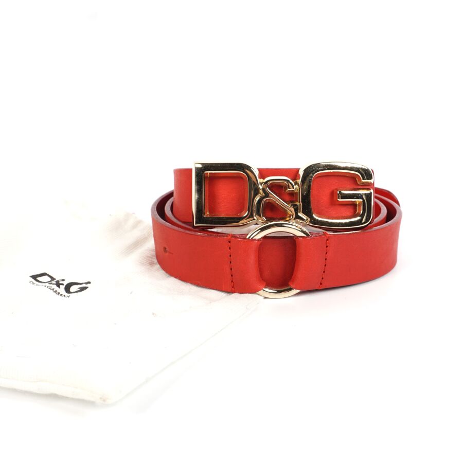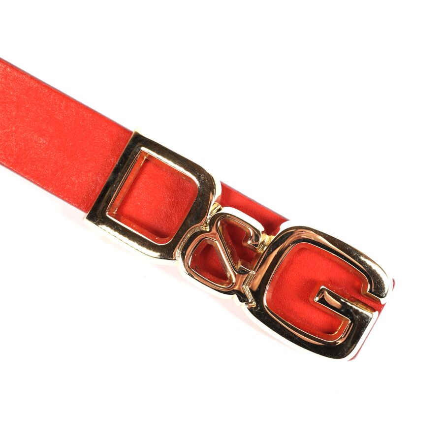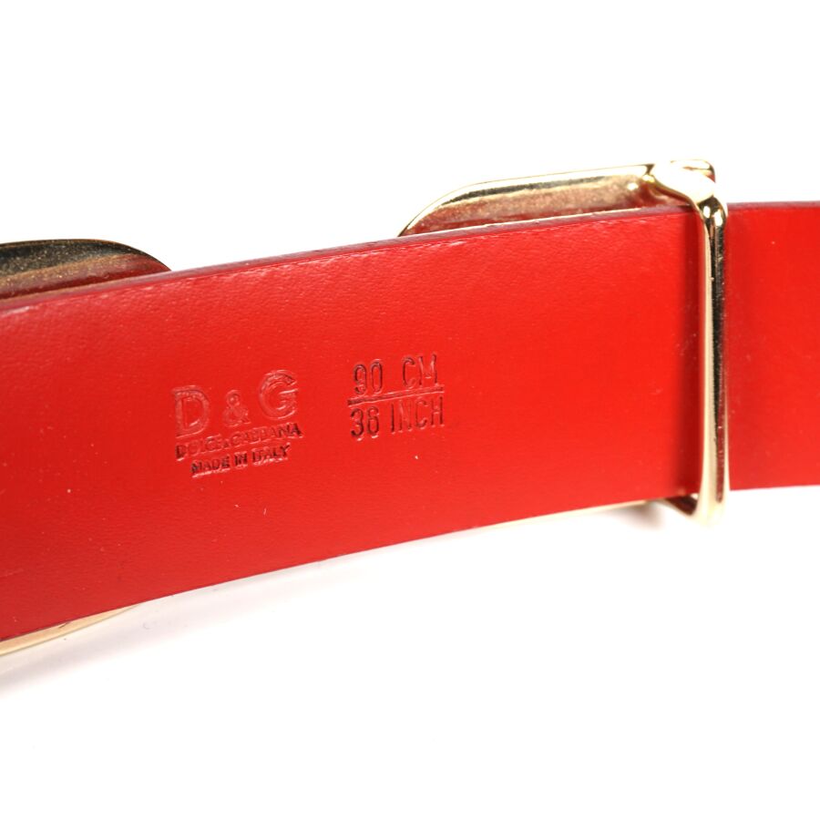 DOLCE & GABBANA : Ceinture en cuir de couleur rouge, boucle en métal doré monogrammé "D&G", présentée dans sa housse d'origine, taille 90 cm. Larg. 3 cm (taches à l'intérieur du cuir).