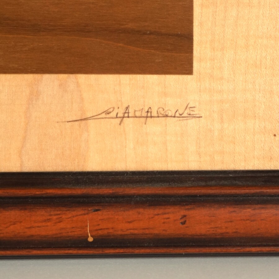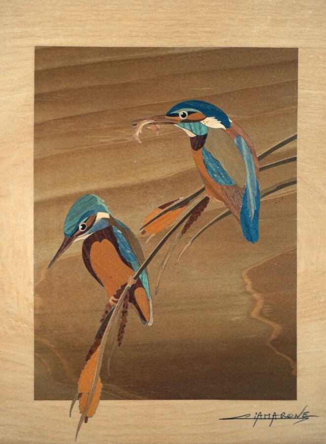 Dominique CIAMARONE (1959), "Marins pêcheurs" & "Buse", deux panneaux marquetés, signés en bas à droite, 25 x 20 cm et 30.5 x 24.5 cm (portent des tampons d'authenticité au dos).