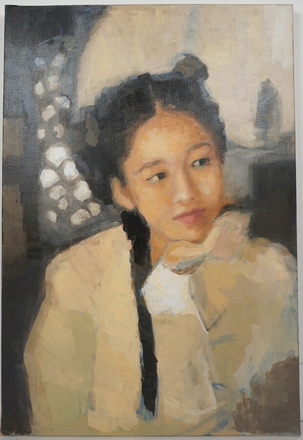 Dominique MESNAY (1957), "Le secret partagé" 2020, huile sur toile représentant un portrait de jeune fille songeuse, signée, datée et titrée au dos, 72.5 x 50 cm.