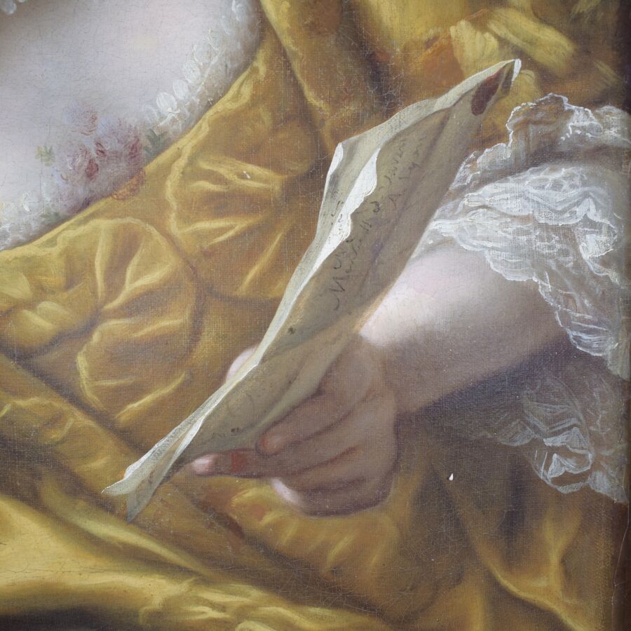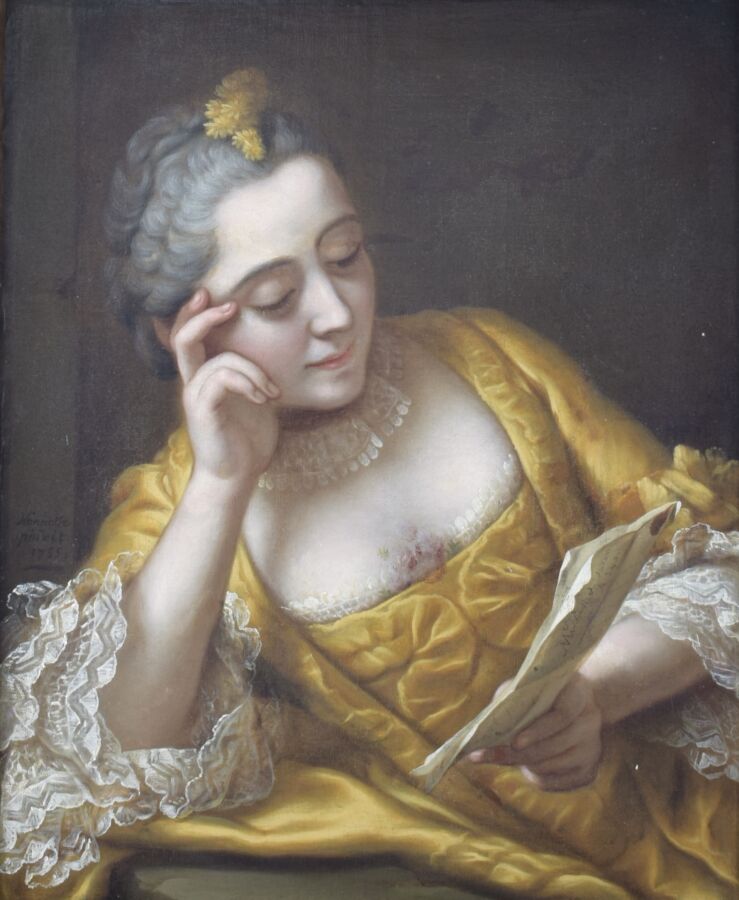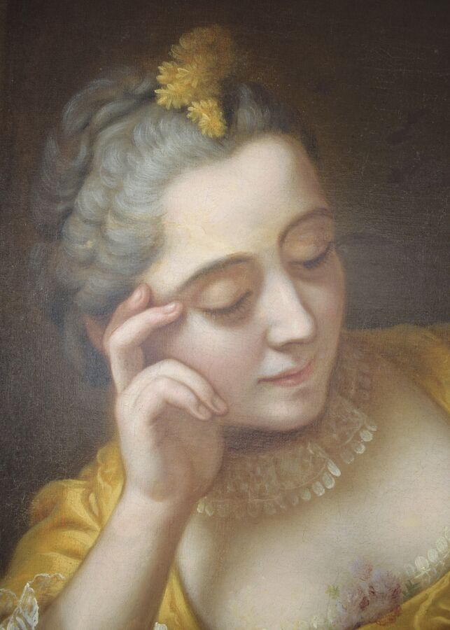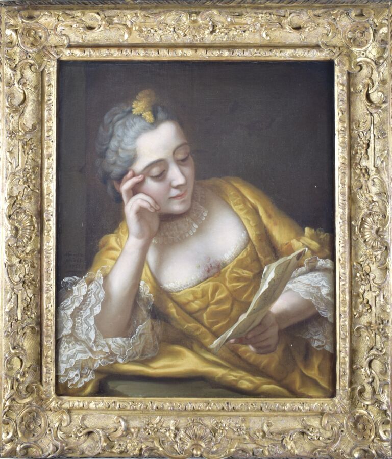 Donatien NONOTTE (1708-1785), "La lecture", 1755, huile sur toile, signée et datée au centre à gauche, 60 x 50 cm, (manques, restaurations).