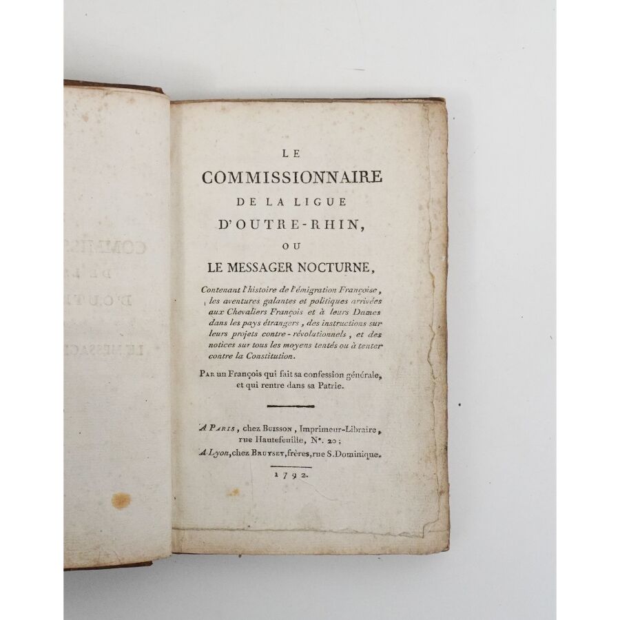 [DOPPET (Général, François-Amédée)]. Le Commissionnaire de la Ligue d'Outre-Rhin, ou Le Messager nocturne, contenant l'histoire de l'émigration françoise, les aventures galantes et politiques arrivées aux chevaliers françois et à leurs dames dans les pays étrangers, des instructions sur leurs projets contre-révolutionnels, et des notices sur tous les moyens tentés ou à tenter contre la Constitution. Par un François qui fait sa confession générale, et qui rentre dans sa Patrie. Paris, Buisson, Lyon, Bruyset, 1792. In-8, demi-veau brun, dos lisse, étiquette de titre manuscrite (reliure de l'époque).