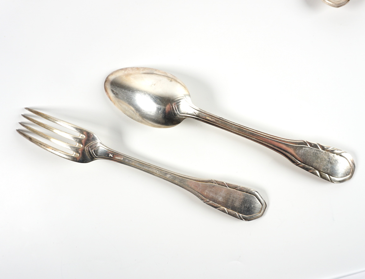 Douze grands couverts de table en métal style Art-Déco, modèle filet et chevrons, L. 21 cm (légères rayures d'usage).