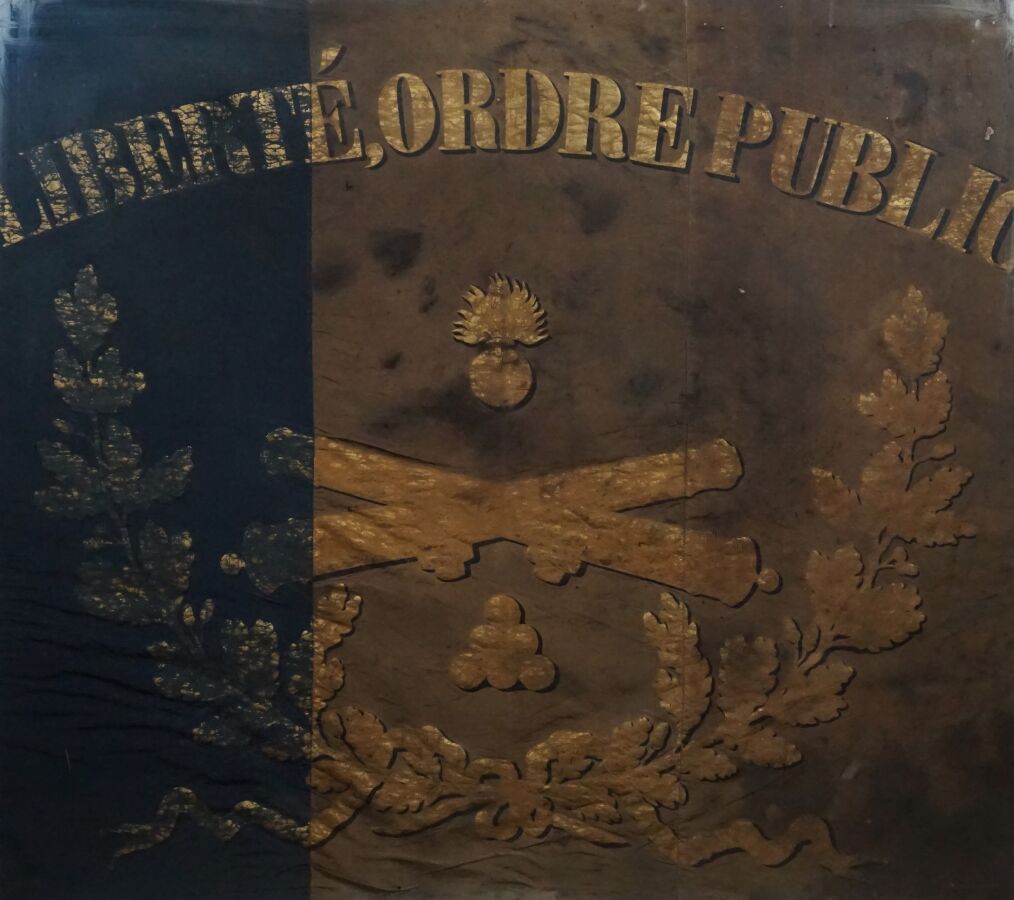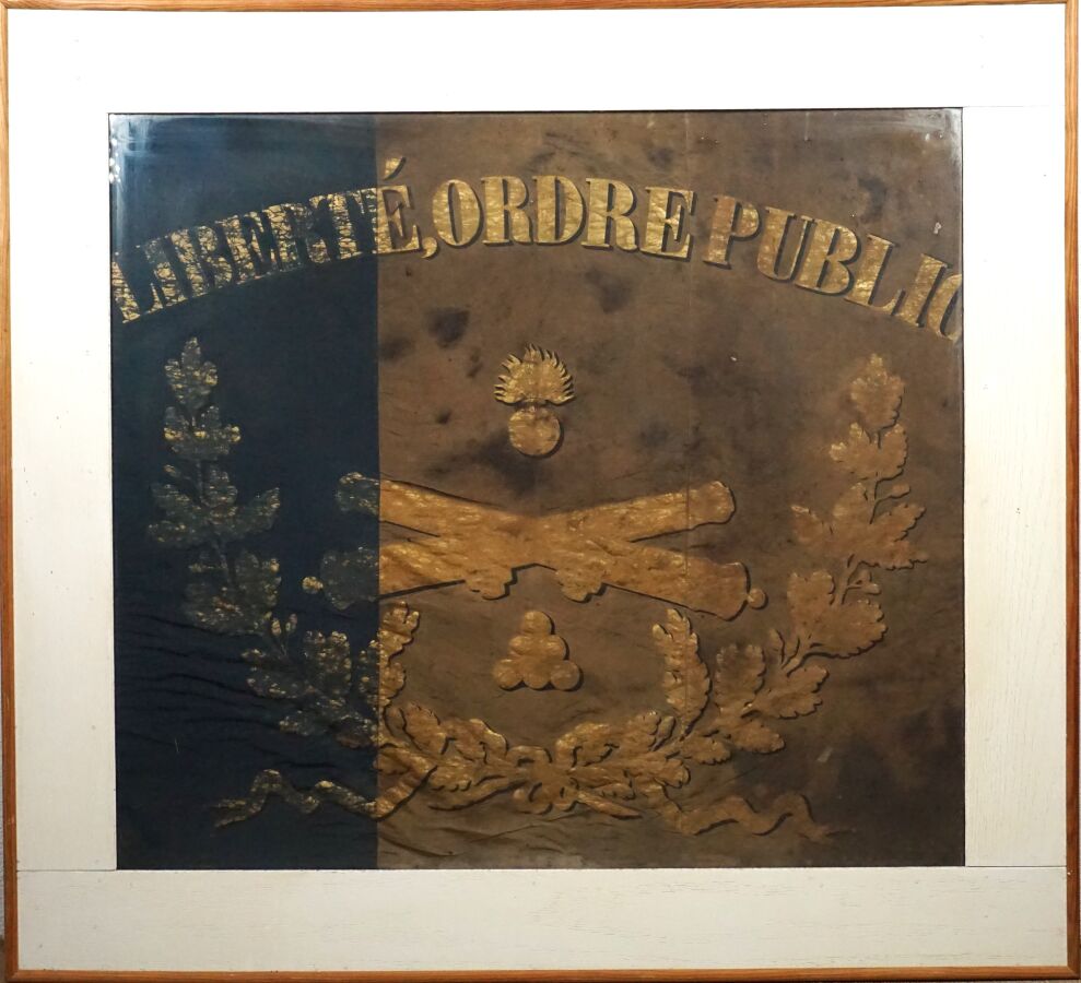 DRAPEAU GARDE NATIONALE LIBERTE ORDRE PUBLIC, en soie décolorée et tâchée à lettres imprimées à l'or, 74 x 82 cm, encadrement sous verre, XIXème, EM.
