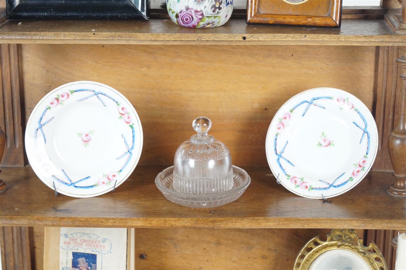 Dressoir en bois ciré à deux portes, circa 1900, H. 56 cm. On joint différents accessoires : bougeoirs, vase, cadres, assiettes en porcelaine...