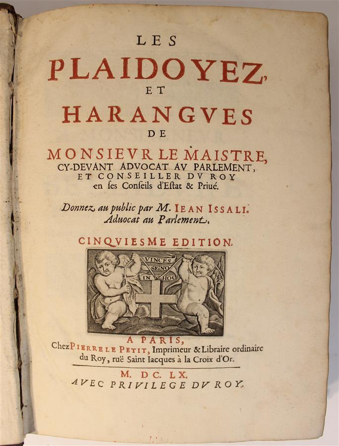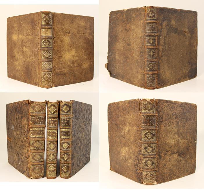 [DROIT] - Journal du Palais ou recueil des principales décisions de tous les Parlemens & Cours Souveraines de France - Paris ; Denys Thierry, Jean Guignard, 1672-1775 - 4 tomes en 3 volumes In-4° - Mouillures éparses, quelques annotations anciennes en marge, des feuillets jaunis - Belles vignettes armoriées aux titres - Reliure de l'époque veau brun granité (fentes partielles aux mors du 1er volume, des coins et coupes usés, des travaux de vers superficiels à certains plats) - Dos à nerfs ornés et titrés or (4 coiffes absentes) - Tranches mouchetées de rouge - Bel ex-libris armorié répété - On y joint : L'HOMMEAU (Pierre de) - Maximes générales du droict françois divisées en trois livres [] - Paris ; Michel Bobin, Nicolas Le Gras, 1665 - 1 volume In-4° - Pâle mouillure en marge supérieure, des soulignements et marques anciennes à l'encre noire - Vignette au titre - Reliure de l'époque veau brun granité (de petits manques de cuir au 2nd plat, coins usés, 1 coupe très endommagée) - Dos à nerfs orné (dédoré et coiffe supérieure absente) - Tranches mouchetées - On y joint : LE MAISTRE - Les plaidoyez et harangues de Monsieur Le Maistre [] Donnez au public par M. Jean Issali - Cinquiesme édition - Paris ; Pierre Le Petit, 1660 - 1 volume In-4° - Quelques rares mouillures en marge supérieure - Titre en rouge et noir avec vignette - Reliure de l'époque veau brun granité (petit manque de cuir au 1er plat, 1er mors frotté, l'autre fendu sur 4 cm, coins usés, 1 coupe très endommagée) - Dos à nerfs orné (coiffes absentes, cuir craquelé) - Tranches mouchetées de rouge - On y joint : RENUSSON (Philippe de) - Traitez du douaire et de la garde-noble et bourgeoise qu'on appelle bail en plusieurs coustumes - Paris ; La Compagnie des Libraires, 1724 - 1 volume In-4° - Quelques piqures éparses - Reliure de l'époque veau havane (plats légèrement épidermés et frottés) - Dos à nerfs orné (coiffes frottés et petit accident à l'inférieure) - Pièce de titre maroquin blond - Tranches rouges - Bon exemplaire.