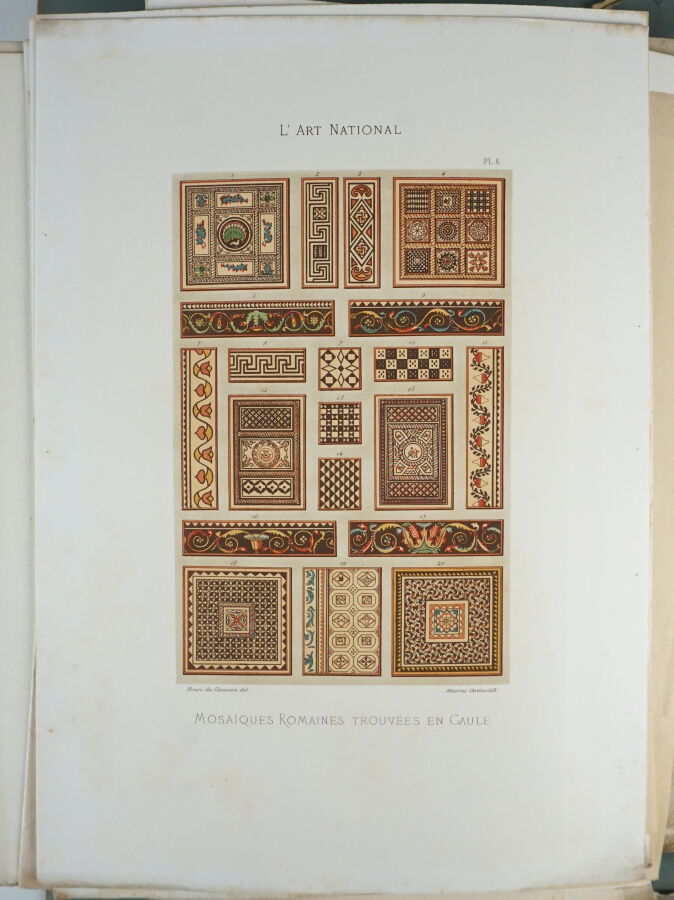DU CLEUZIOU (Henri) - L'art National. Étude sur l'histoire de l'art en France. Les origines - La Gaule - Les Romains - Les Francs - Les Byzantins - L'art ogival - Paris ; Librairie Abel Pilon, A. Le Vasseur Successeur, 1882-1883 - 2 volumes In-4° en feuilles à toutes marges sous chemises éditeur toilées grises à rabats titrées aux 1ers plats (lacets manquants) - 20 chromolithographies, 20 planches tirées à part, et 430 et 494 gravures in texte - Bon exemplaire numéroté sur Hollande (n°121 sur les 200 de tirage total).